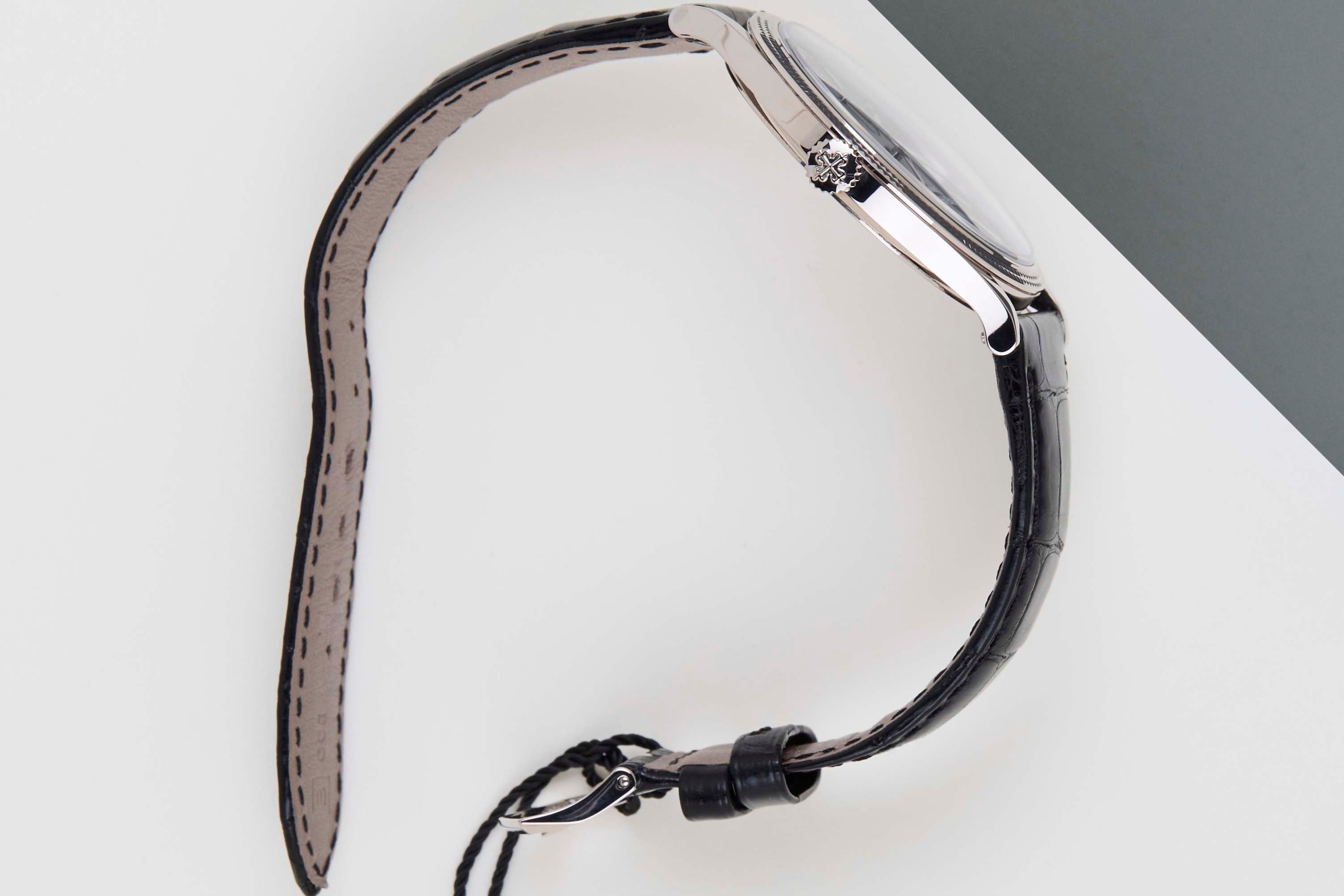 Full Set | International Patek Philippe Warranty Until October 2028 Patek Philippe has been successful for over 180 years because of its dedication to innovation, quality, and tradition. The brand is known for its timeless elegance, precision, and artistry, inspiring many watch enthusiasts and collectors. Patek Philippe continues to evolve and adapt, maintaining its status as a leader in the watchmaking industry. Today, it is still an independent, family-owned company, with Thierry Stern as the President.Patek Philippe produces around 60,000 to 70,000 watches each year, focusing on limited production, quality craftsmanship, and innovation. This ensures that each watch is a masterpiece and maintains the brand’s exclusive reputation in the world of fine watchmaking.The Patek Philippe watch collection is divided into five main families, each with its own unique style and features: Calatrava, Nautilus, Aquanaut, Complications, and Grand Complications.The Patek Philippe Calatrava, introduced in 1932, is one of the brand’s most iconic and enduring models. Named after the Calatrava Cross, this watch represents the brand’s commitment to elegance, precision, and timeless design.The Calatrava is celebrated for its minimalist and refined look, following the Bauhaus design principle that form follows function. This is evident in its clean lines, simple dial, and balanced proportions, making it a classic in watchmaking.