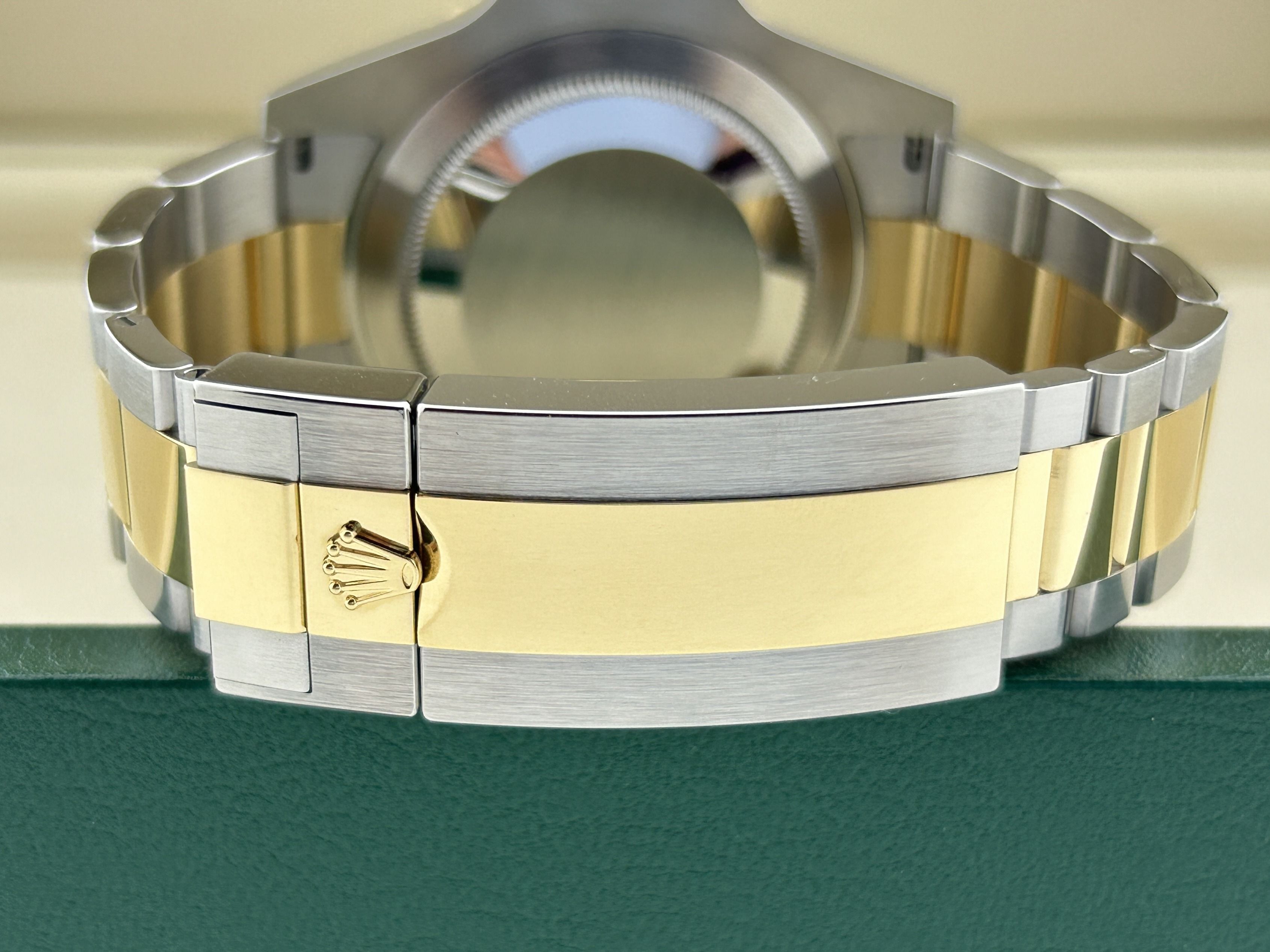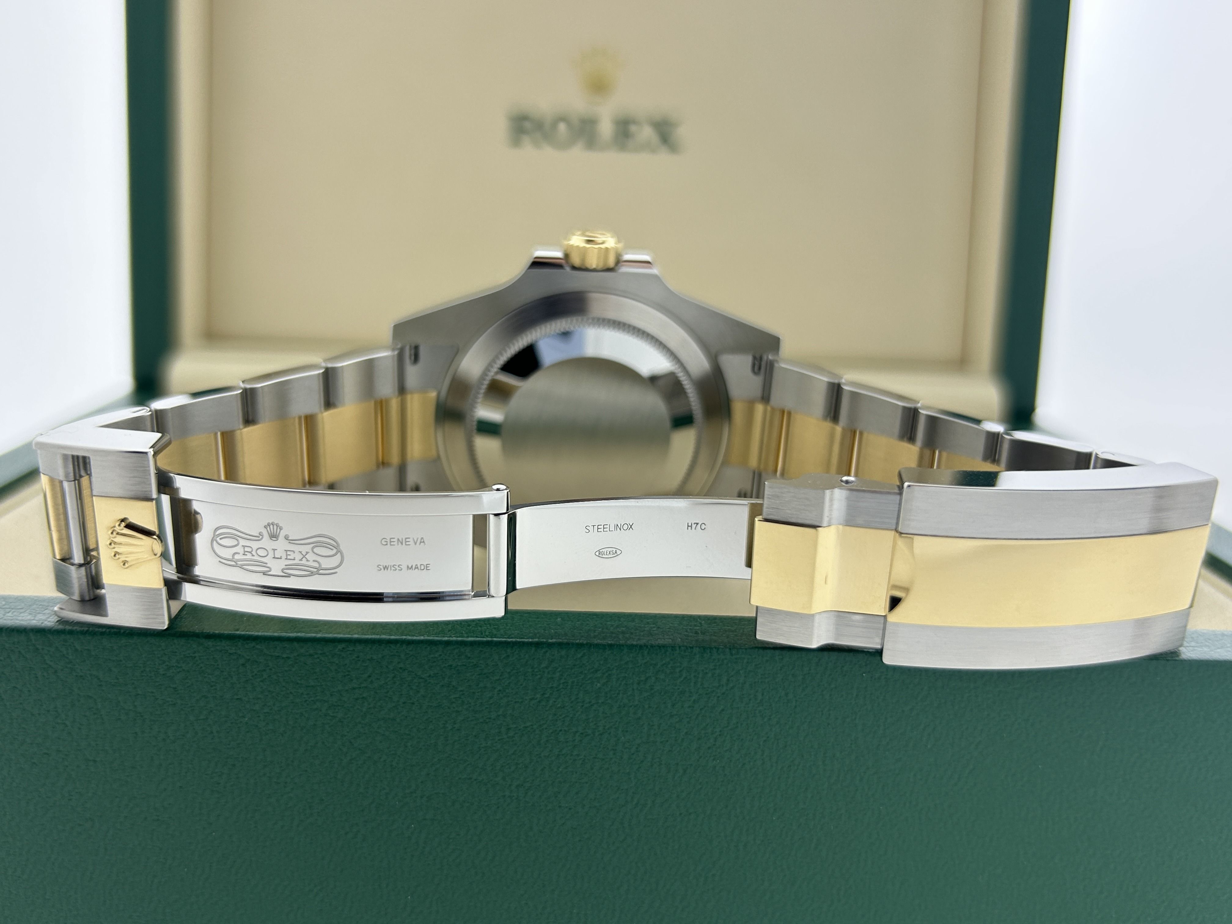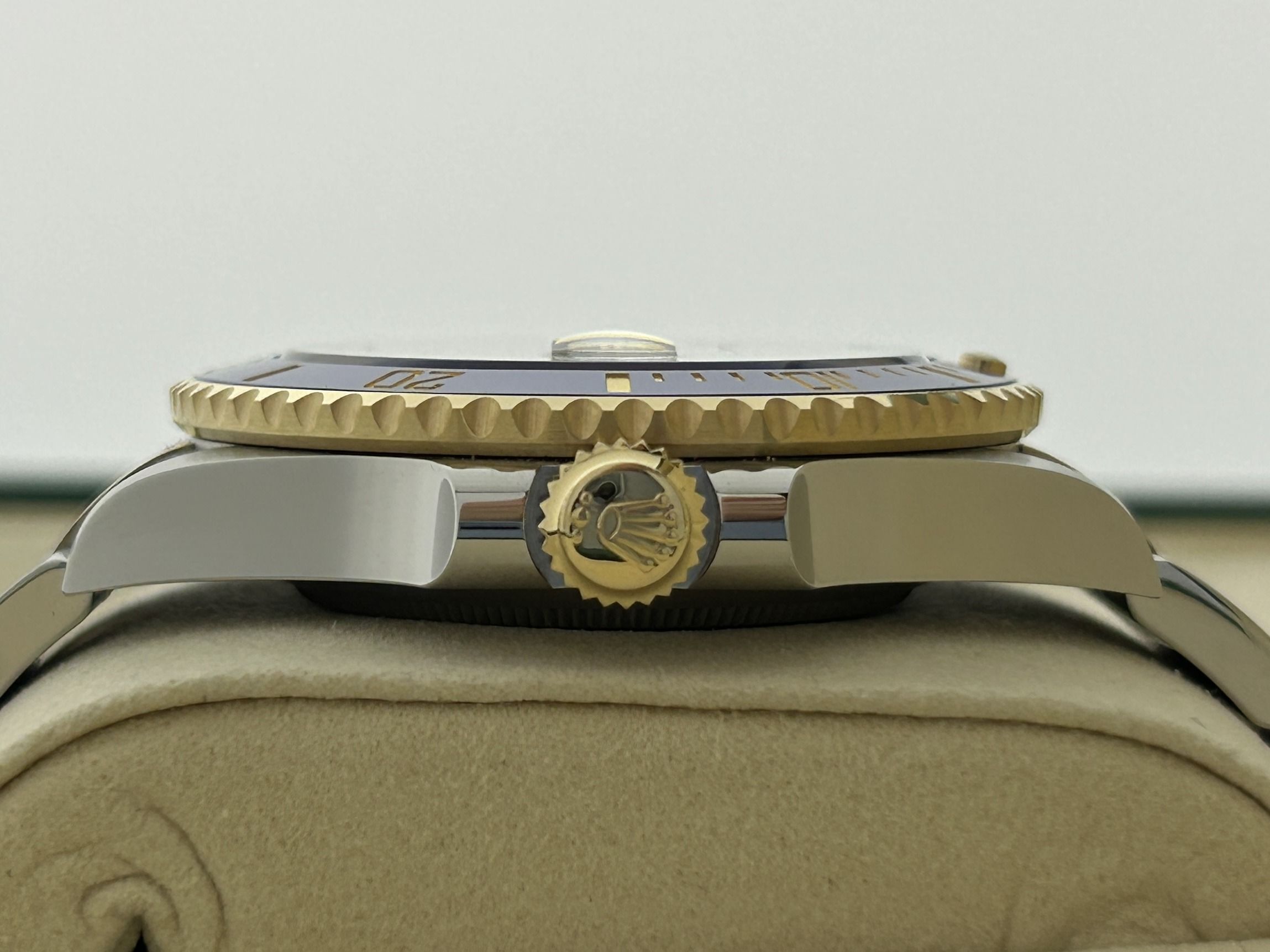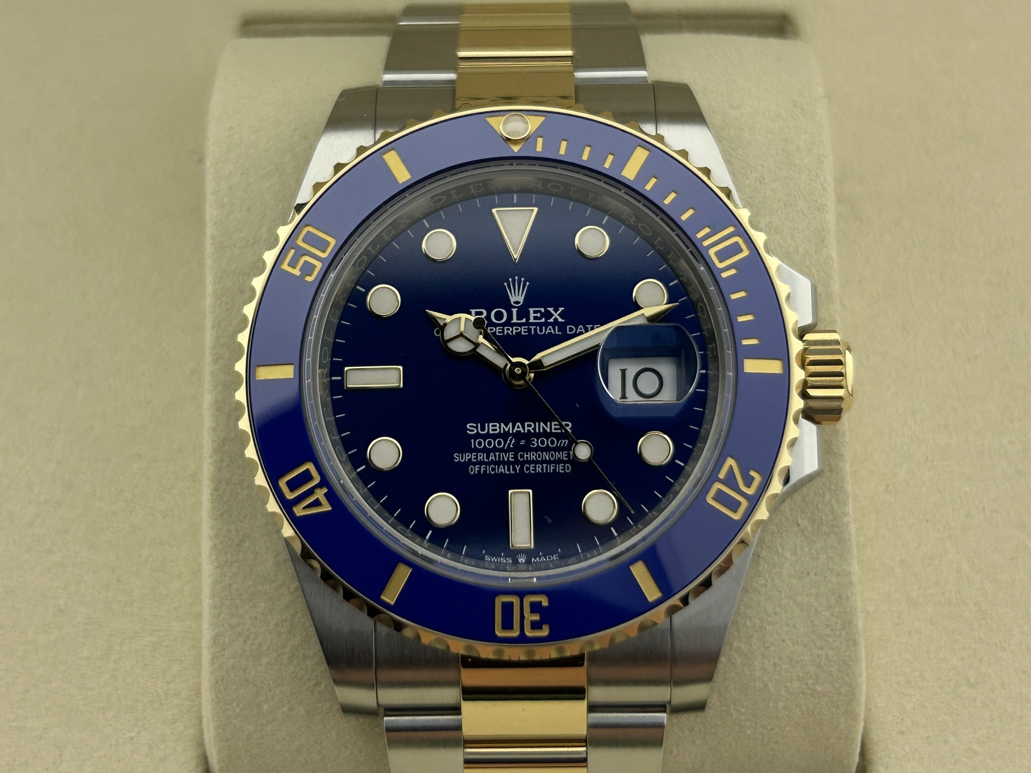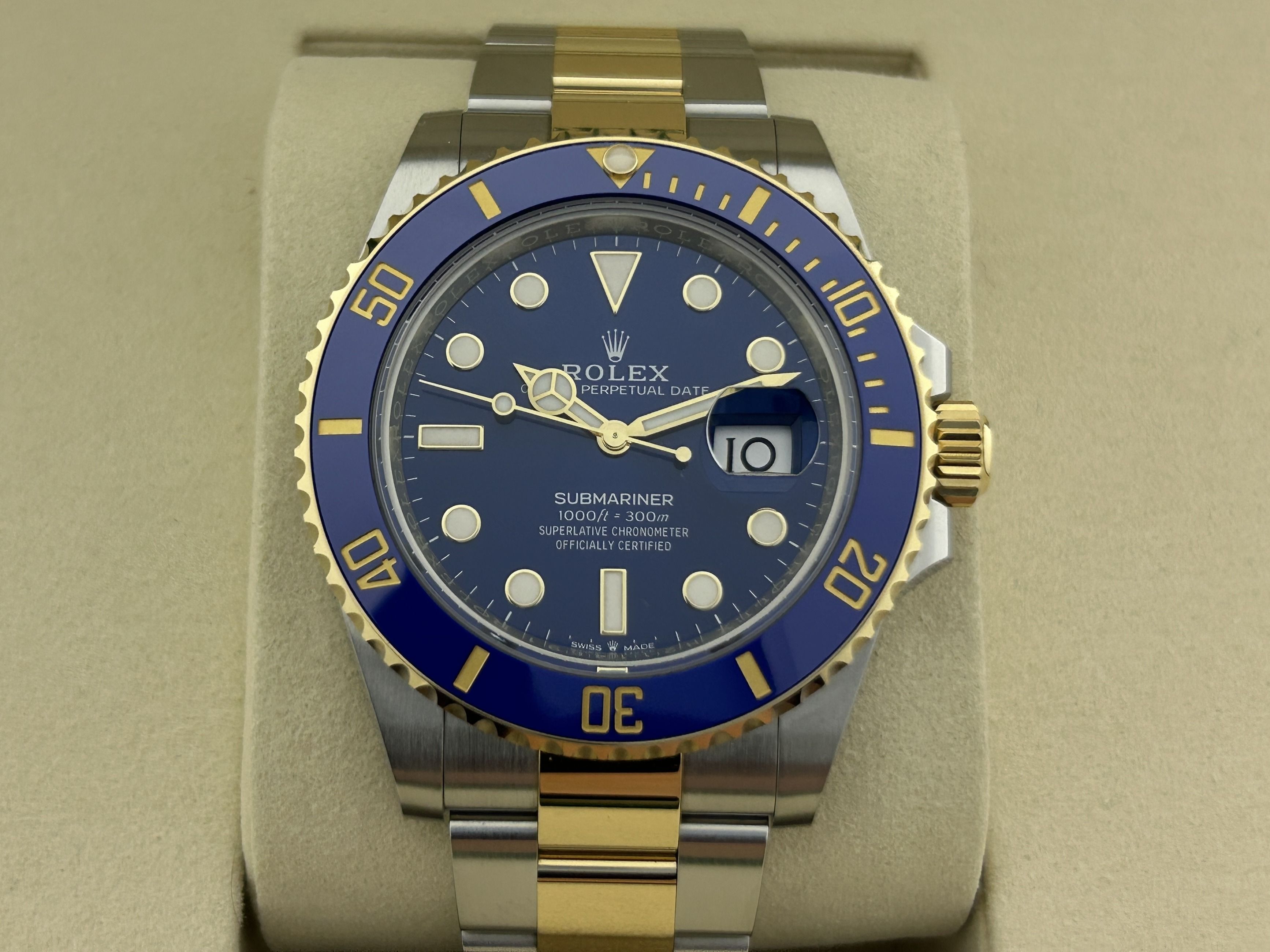 A gold/steel Rolex Submariner Date, ref.126613LB, fullset, from 2025. The Rolex has a gold/steel 41mm case with the original gold/steel Oyster-bracelet. The watch has a blue dial with a date-window at 3 o'clock with a blue bezel. The watch is like new and from 2025. The Rolex is completely fullset, with its original box and certificate.