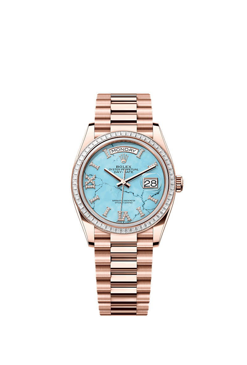 Rolex 128395TBR-0018 - Day-Date 36 Everose Gold - Baguette / Turquoise / President - Diamond