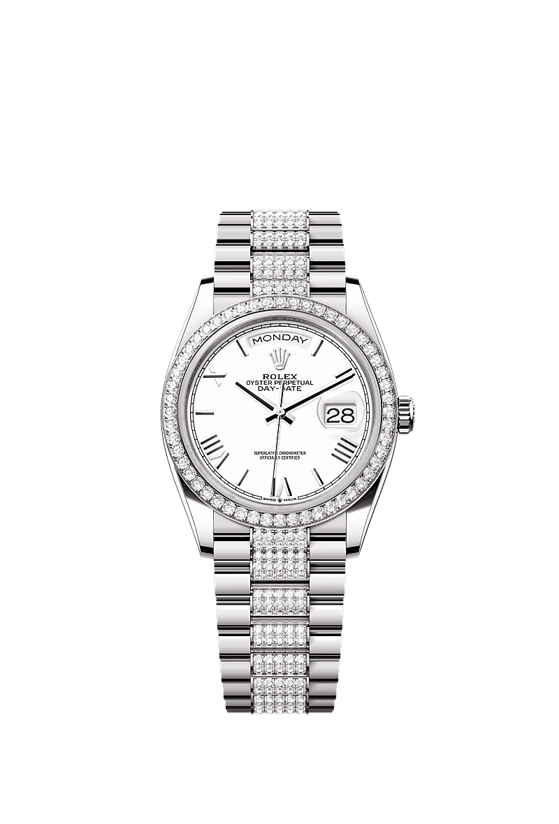 Rolex 128349RBR-0044 - Day-Date 36 White Gold - Diamond / White - Roman / President - Diamond