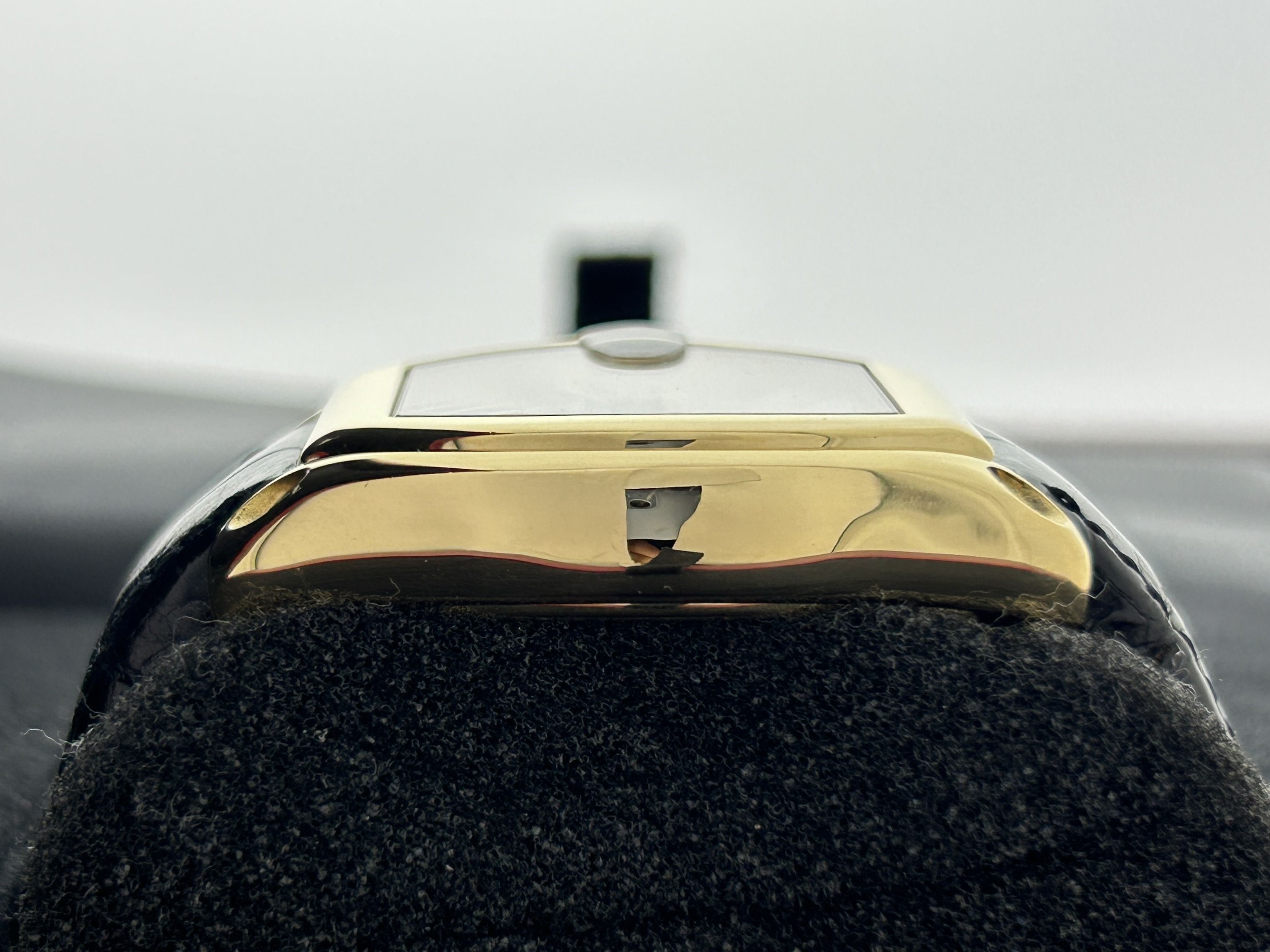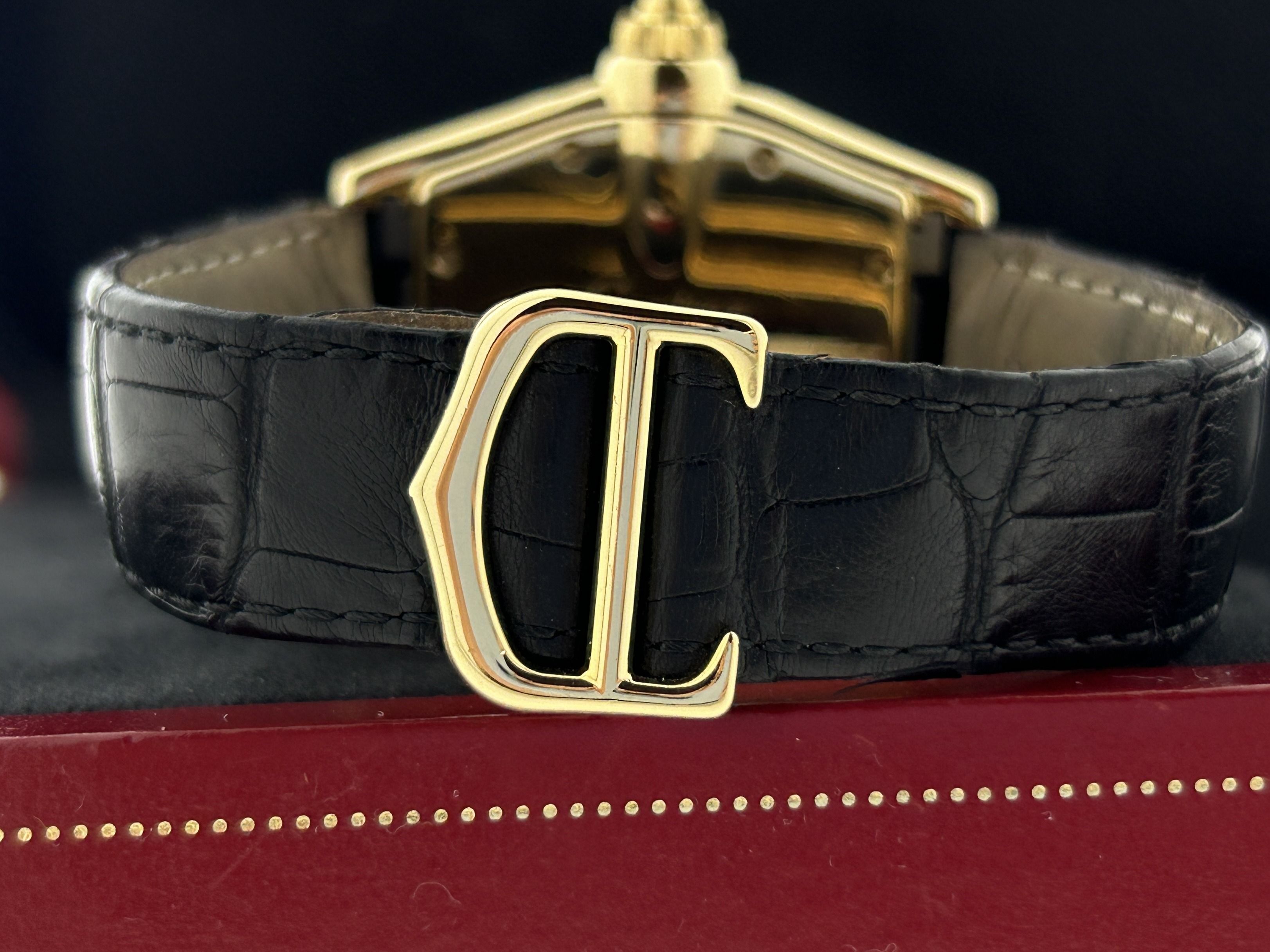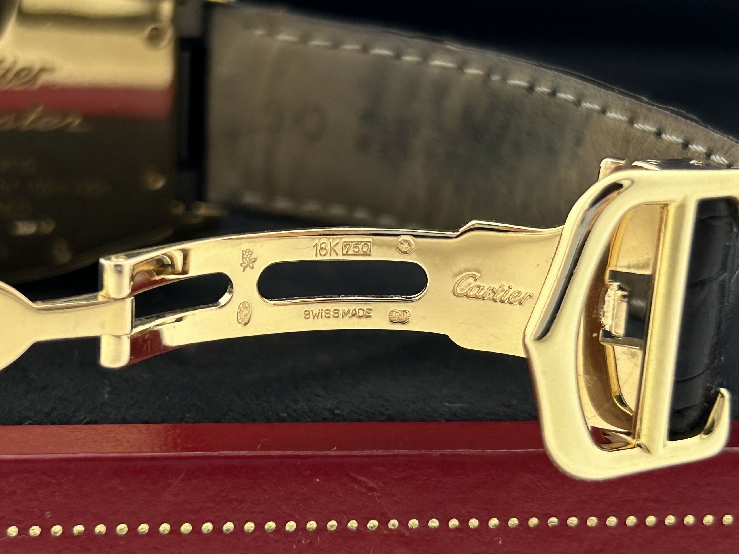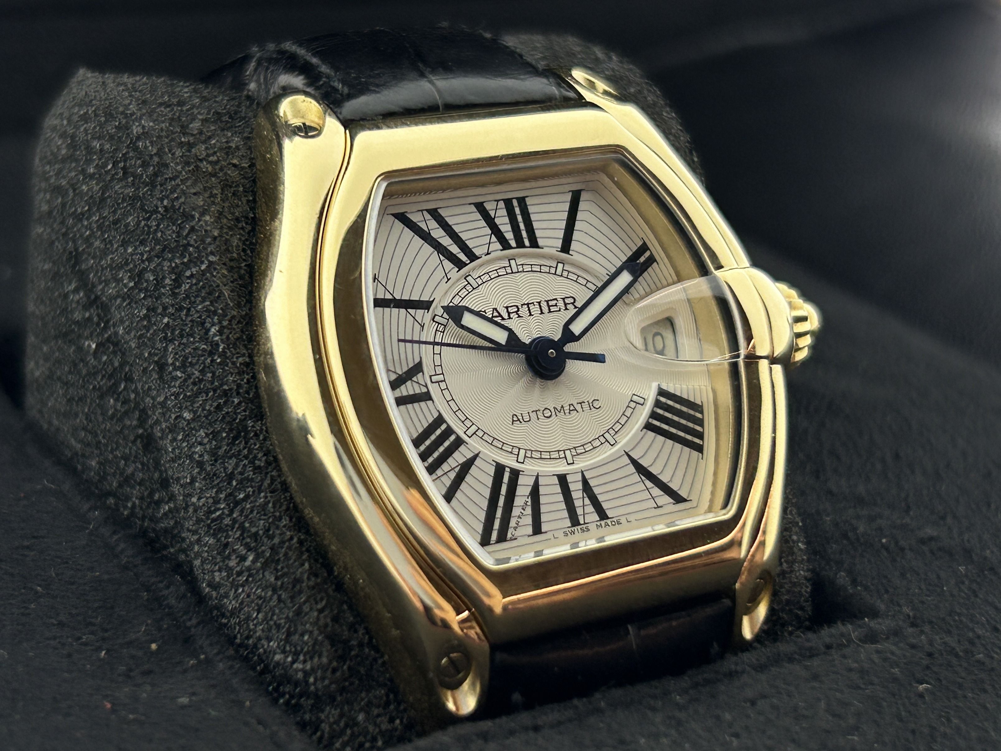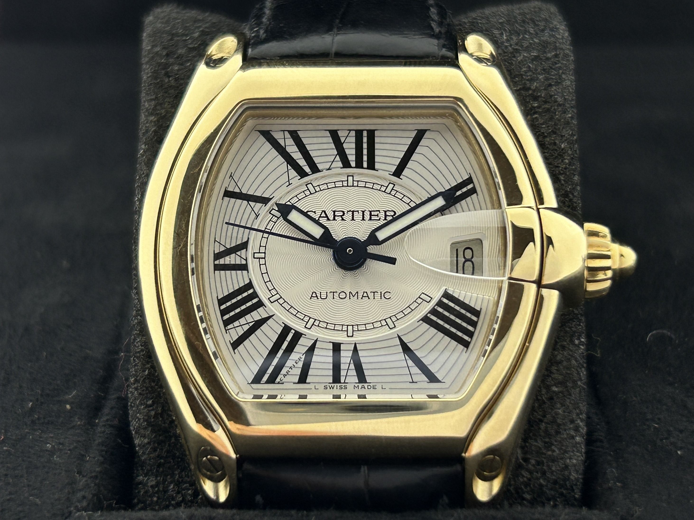 A yellow gold Cartier Roadster Large automatic watch, ref. 2524/W62005V2. The watch has a yellow gold 37.5 x 44mm case with a black, Cartier leather strap. The Cartier Roadster has a silver colored, guilloche dial with Roman numerals and a date-window at 3 o'clock. The watch has been serviced recently and is in a great condition. The Cartier Roadster comes with its original box and an extra brown leather set of straps.