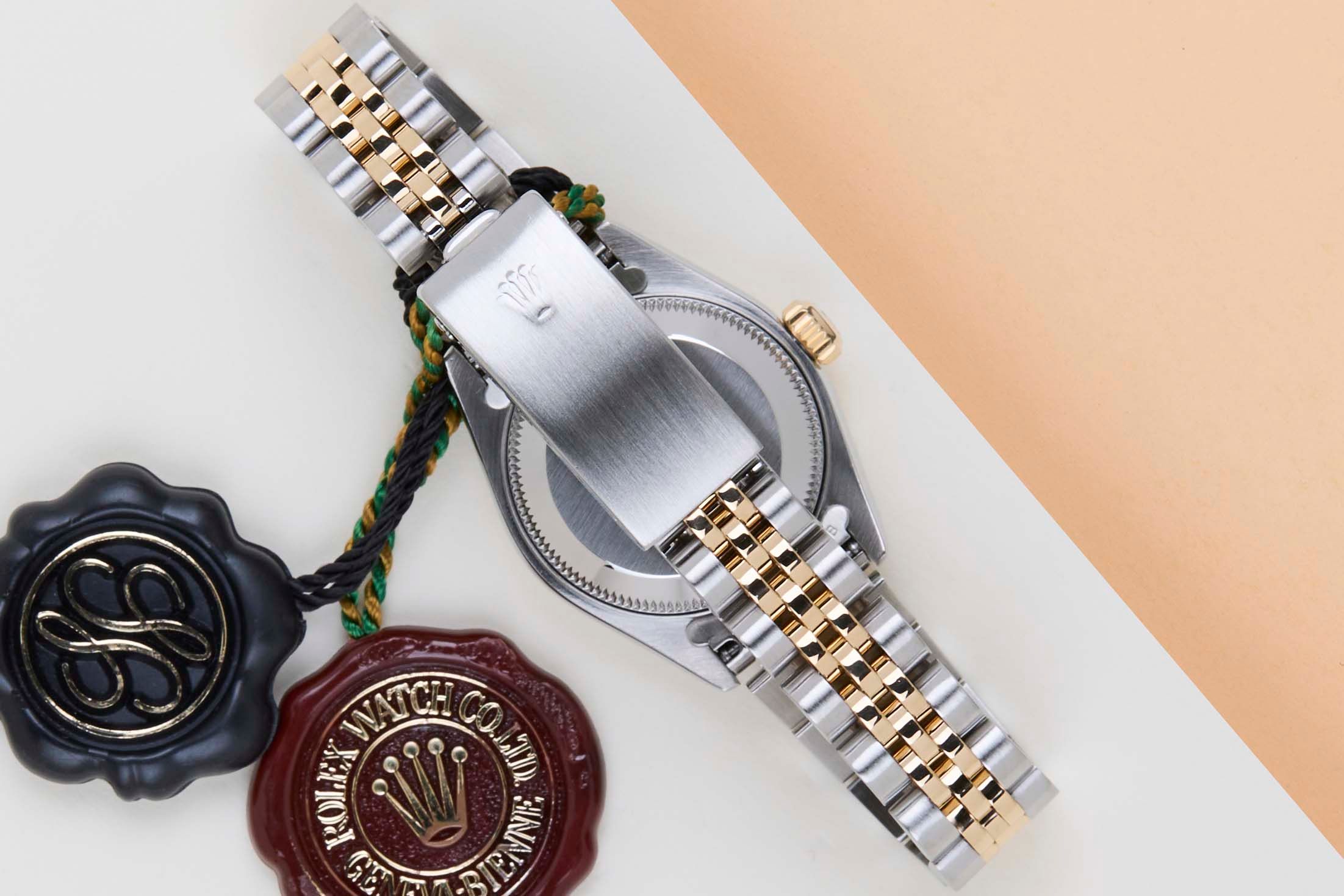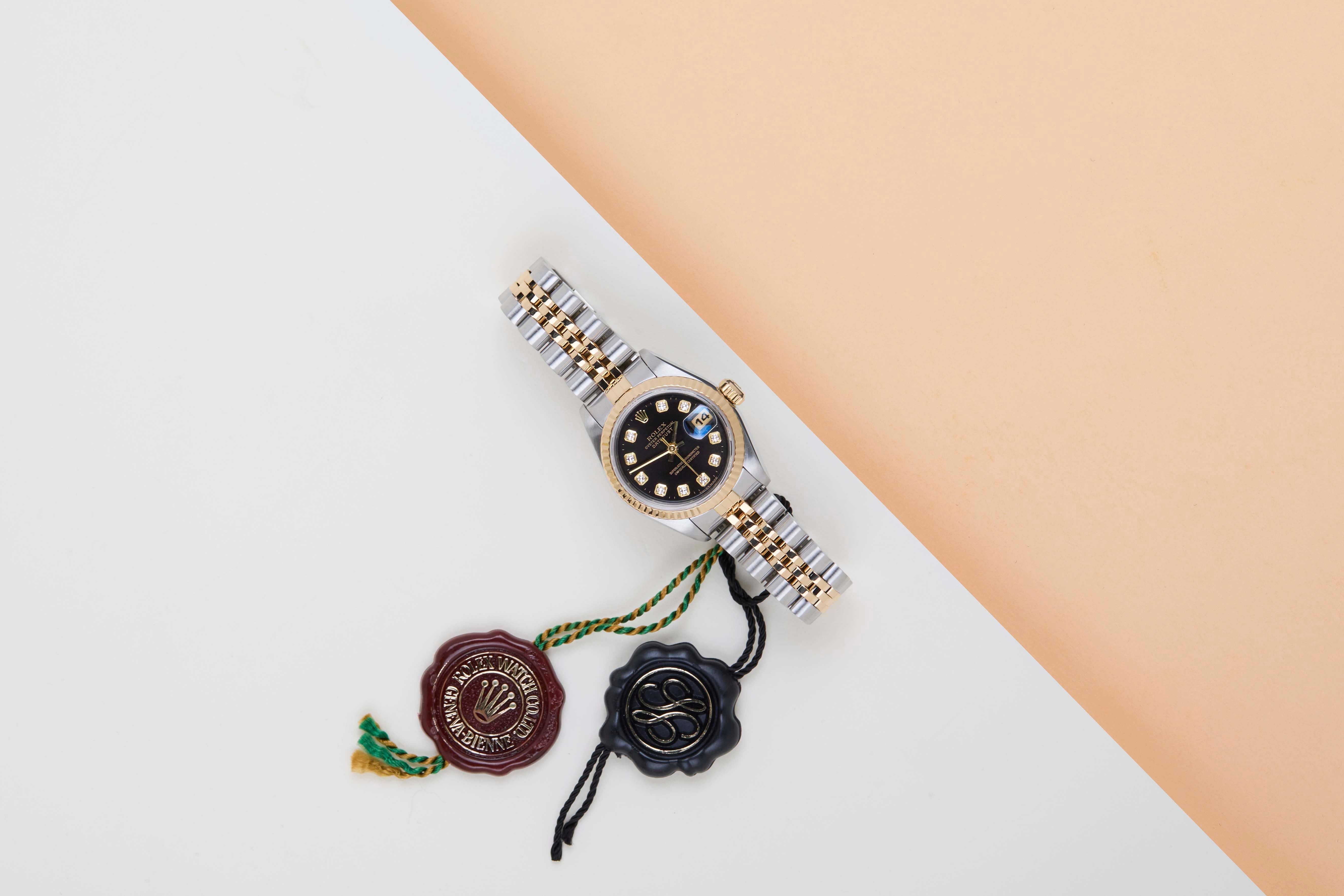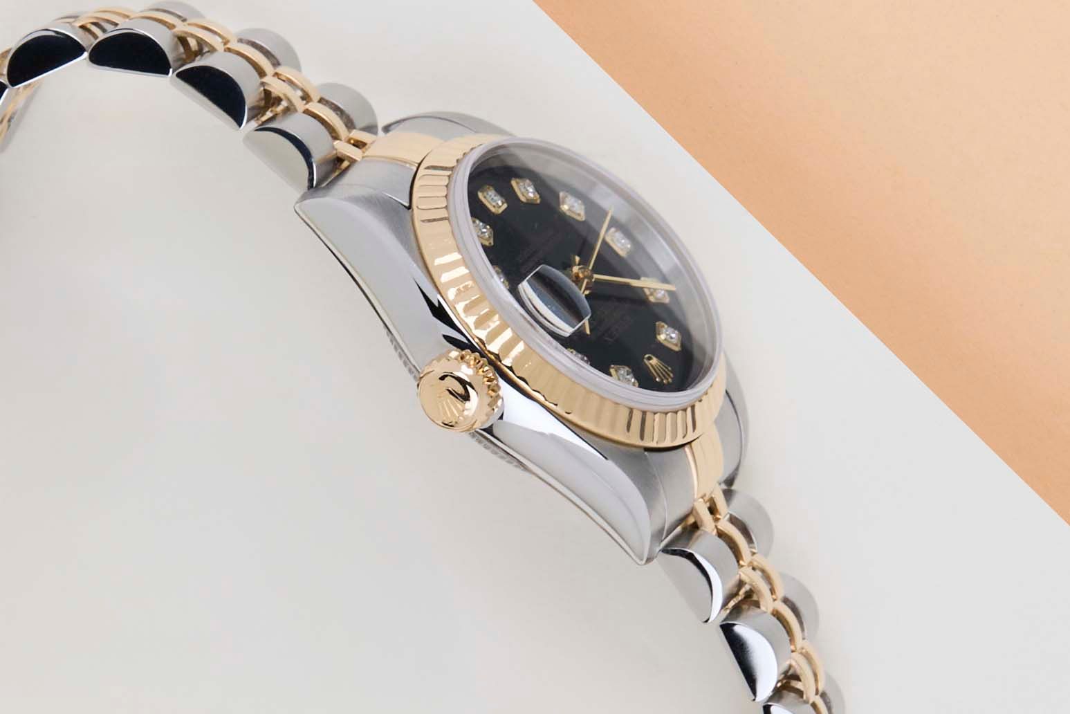 Rolex introduced the original Datejust in 1945 to celebrate the company's 40th anniversary. Due to the enormous success, Rolex released the first Lady-Datejust in 1957.This Rolex Datejust 26 'Black Diamond Dial - Jubilee' dates back to September 2000.This Datejust is made of a combination of 18k Yellow Gold and stainless steel and is fitted with a Jubilee bracelet.This Rolex Datejust 26 is in Mint condition and comes with the original Rolex Warranty Card and box. Furthermore, the watch has been serviced by our watchmakers and therefore it comes with One year of Steiner Warranty.