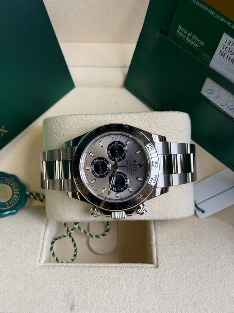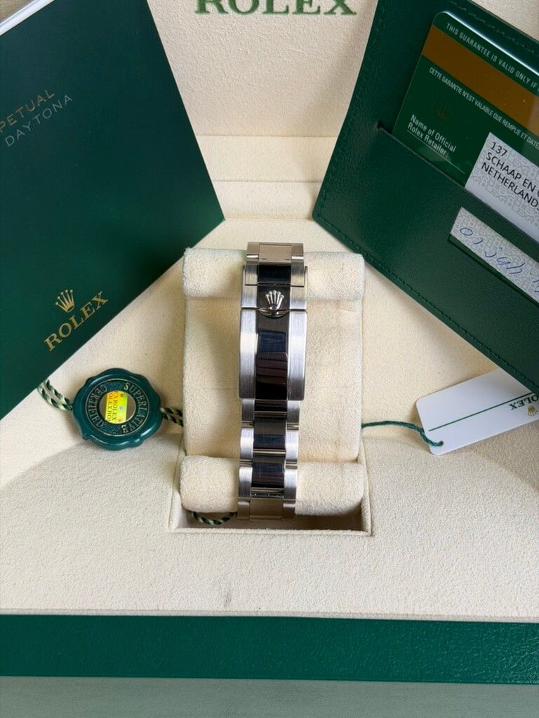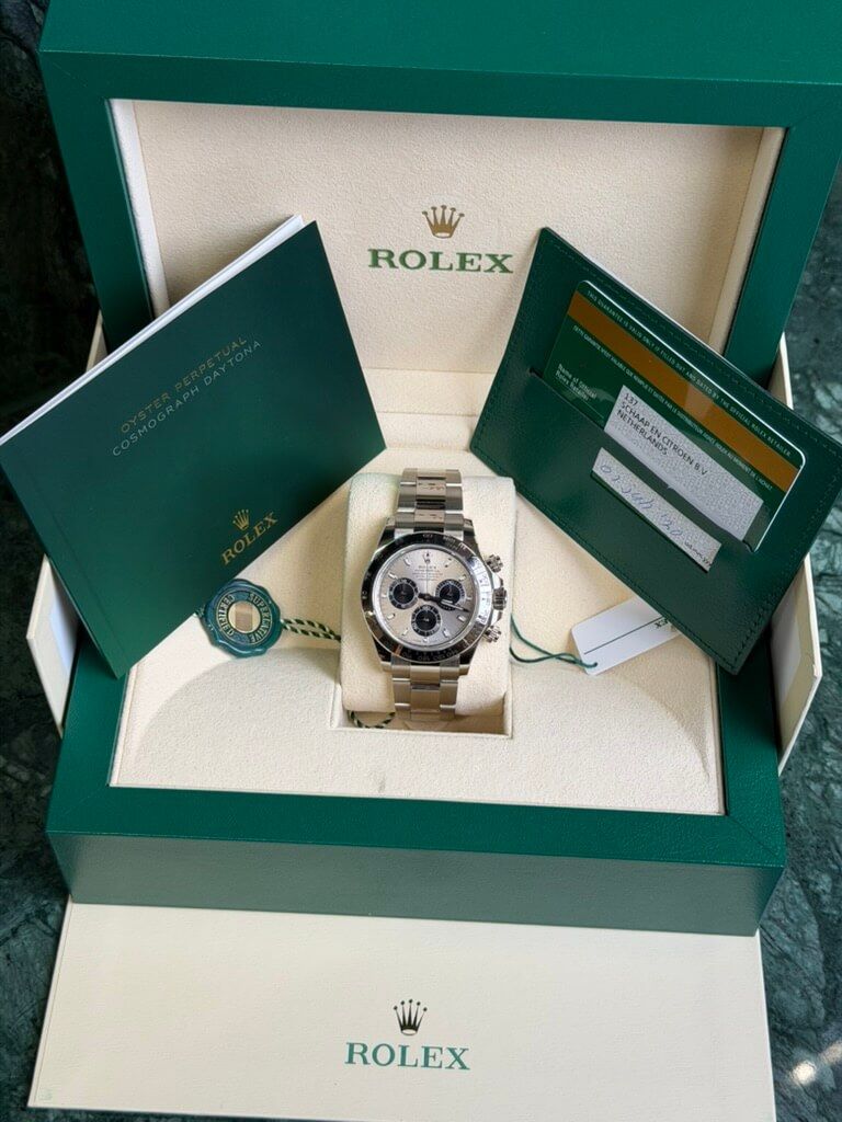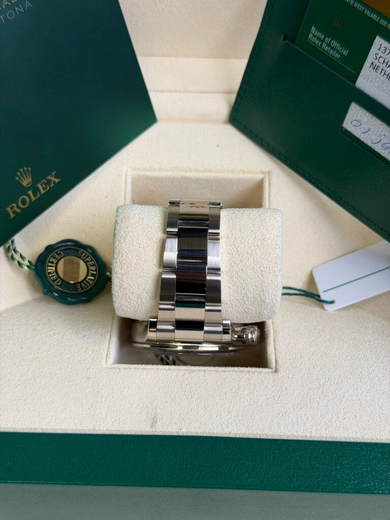 De Rolex Daytona chronograaf ref. 116509 straalt pure luxe en verfijning uit. Dit herenhorloge is vakkundig vervaardigd in 18-karaats witgoud, van de 40 mm kast tot de lunette en de armband. Drie zwarte chronograafsubwijzerplaten vormen een subtiel contrast met de zilverkleurige wijzerplaat. De blauw oplichtende Chromalight uurmarkeringen en wijzers zorgen voor een goede afleesbaarheid bij weinig licht. In de kast bevindt zich het COSC Superlative Chronometer Certified kaliber 4130 automatisch uurwerk met een gangreserve van 70 uur.De papieren en de originele doos van de fabrikant worden meegeleverd bij deze Rolex Daytona horloge van staal met zwarte wijzerplaat en 18-karaats witgoud (ref. 116509).