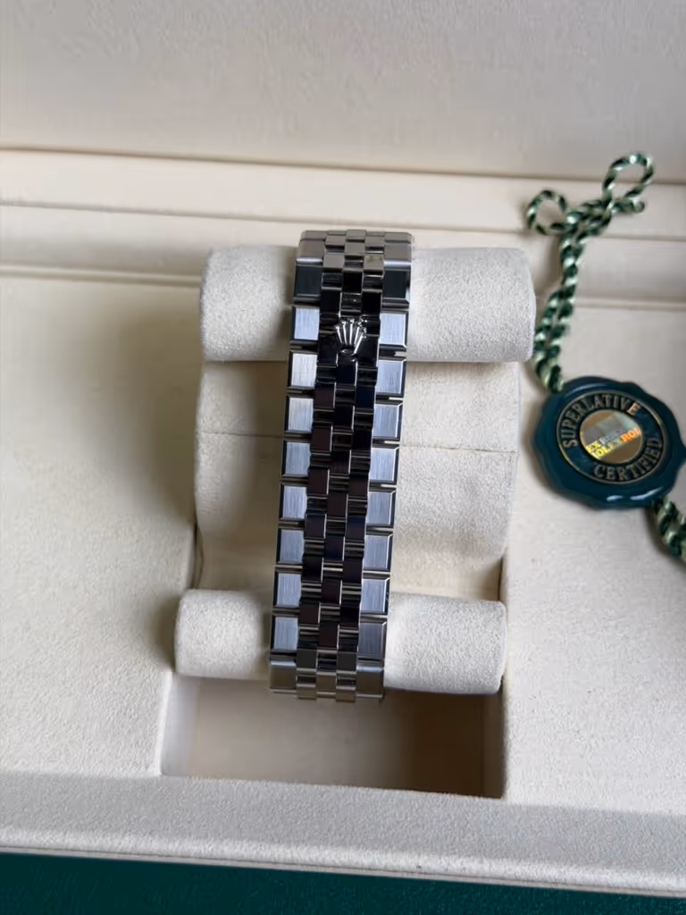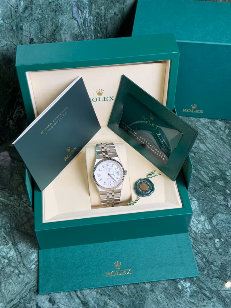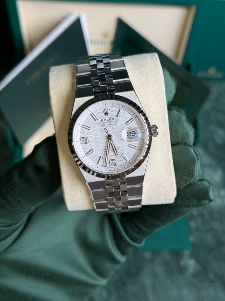 De Land-Dweller, die in 2025 werd gelanceerd als nieuwe pijler naast de Sea-Dweller en de Sky-Dweller, biedt verzamelaars een uitgesproken moderne Rolex die in elke omgeving veelzijdig inzetbaar blijft. Het horloge heeft een 36 mm Oystersteel-kast met een geribbelde lunette van 18 karaats witgoud en een speciaal voor dit model ontworpen Flat Jubilee-armband. De armband, die naadloos in de kast is geïntegreerd, heeft platte, satijngepolijste buitenste schakels en gepolijste binnenste schakels. De witte wijzerplaat van het horloge heeft een satijngepolijst honingraatmotief met lichtgevende indexen en Arabische cijfers als uurmarkeringen, en lichtgevende wijzers. Het horloge wordt aangedreven door het nieuw ontwikkelde zelfopwindende kaliber 7135, met het Dynapulse-echappement voor meer efficiëntie en precisie.Deze Rolex Land-Dweller 36 witgoud en Oystersteel horloge 127334 wordt geleverd met papieren en de doos van de fabrikant.