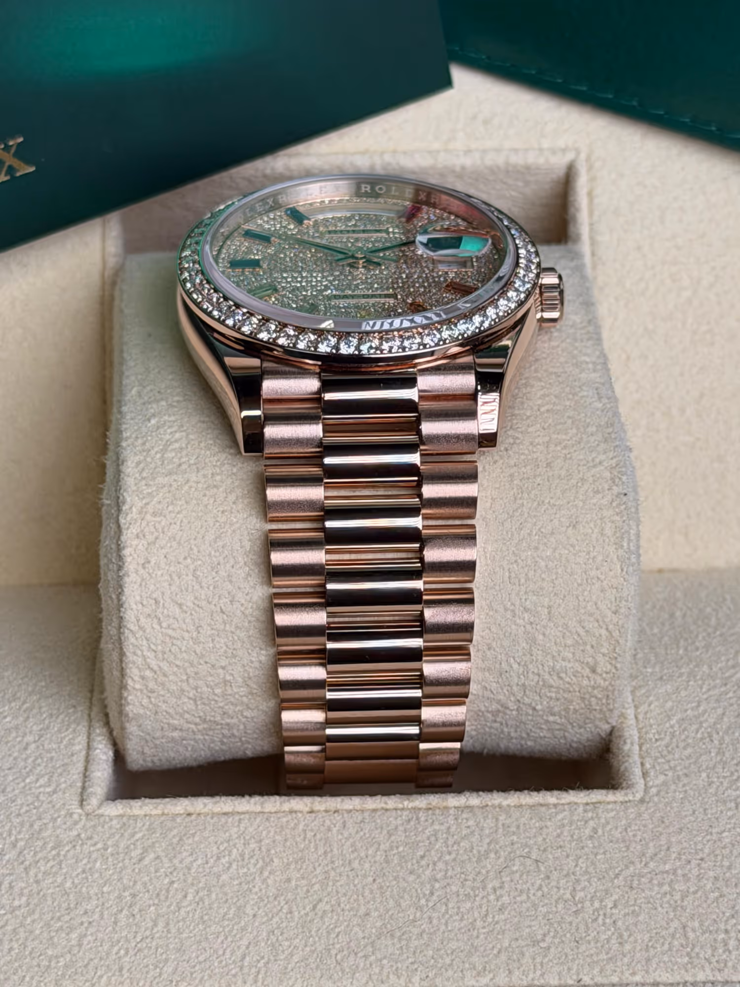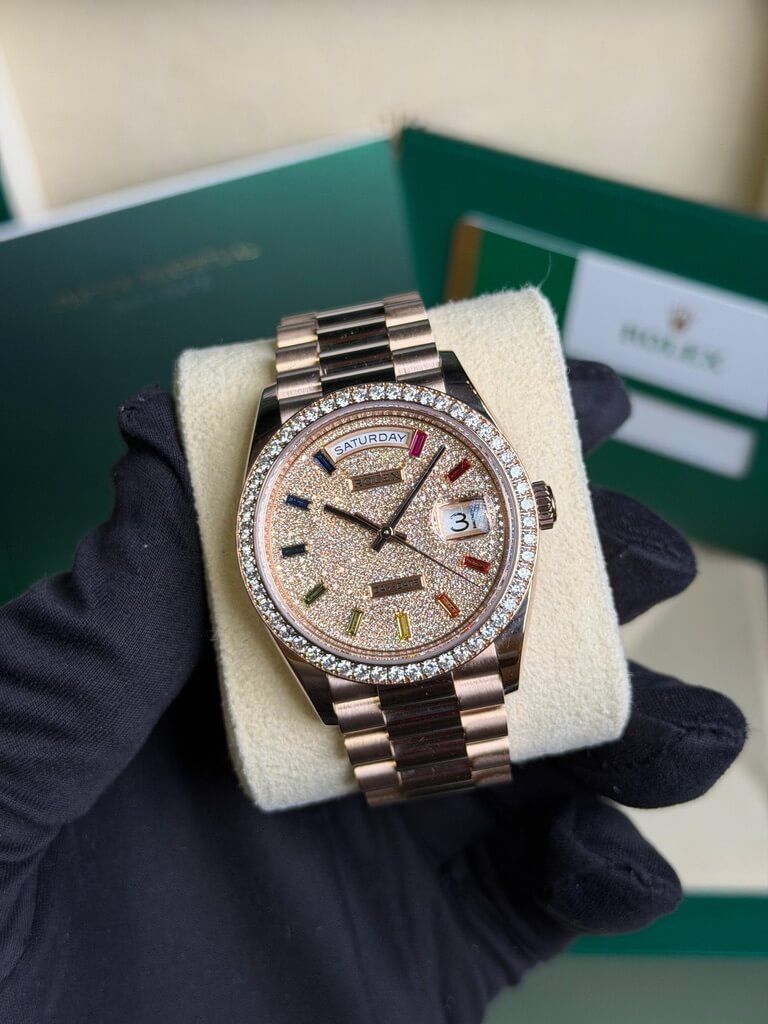Rolex 128235-0039 Day-Date 36 Everose Gold / Fluted / Paved-Rainbow / President
