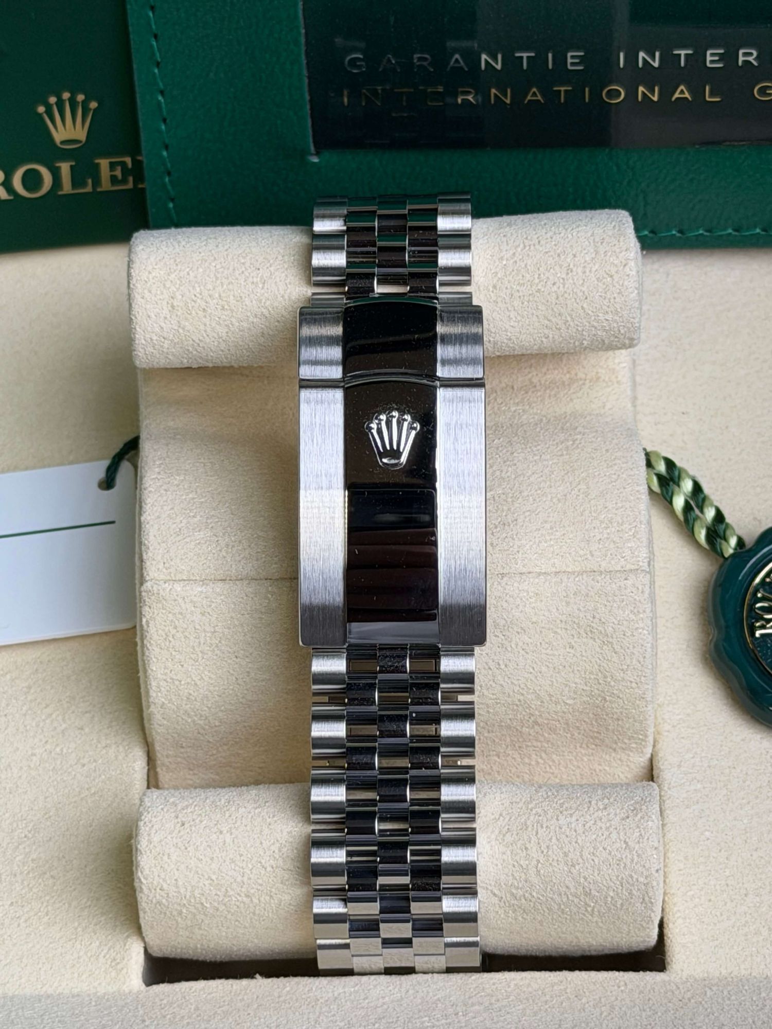 De Rolex Datejust 41 ref. 126334 Wimbledon Jubilee combineert klassieke elegantie met een opvallende kleuraccent. Dit horloge heeft een 41 mm Oystersteel kast met fluted bezel in witgoud en wordt geleverd op de comfortabele Jubilee‑bracelet. De kenmerkende Wimbledon‑wijzerplaat is diepgroen met een subtiele sunburst‑afwerking, wat een opvallend contrast geeft met de witte gouden bezel en uurmarkeringen.Aangedreven door het geavanceerde Calibre 3235, biedt dit horloge een gangreserve van circa 70 uur, een datumaanduiding met vergrootglas en waterdichtheid tot 100 m. Een perfecte keuze voor wie een tijdloos horloge met een frisse en stijlvolle twist wil dragen.