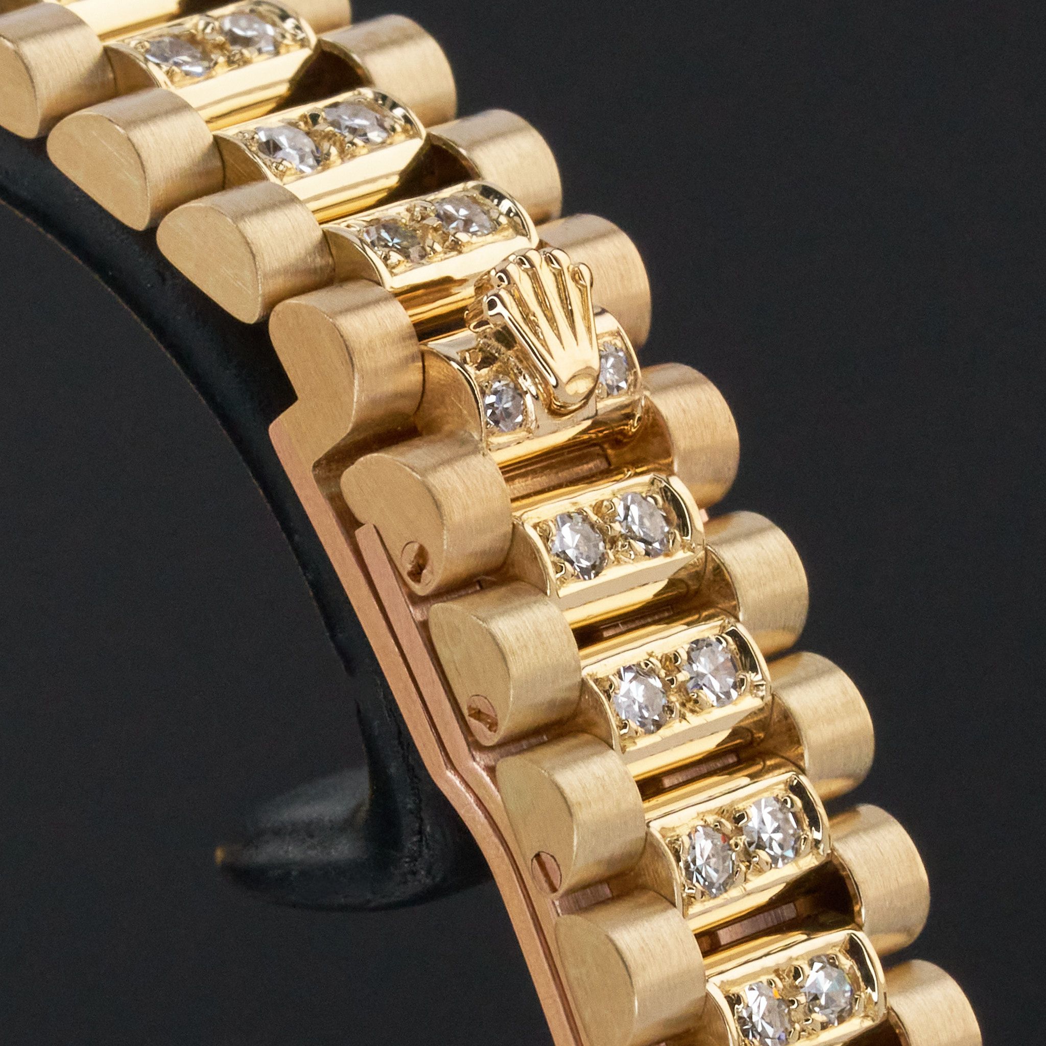 This Rolex Lady-Datejust 69178 features a Pave ruby diamond dial and is crafted from 18K yellow gold, with a production year of 1991. Dial, bezel, case and bracelet are original, but have aftermarket diamond setting.