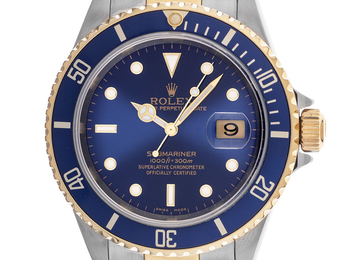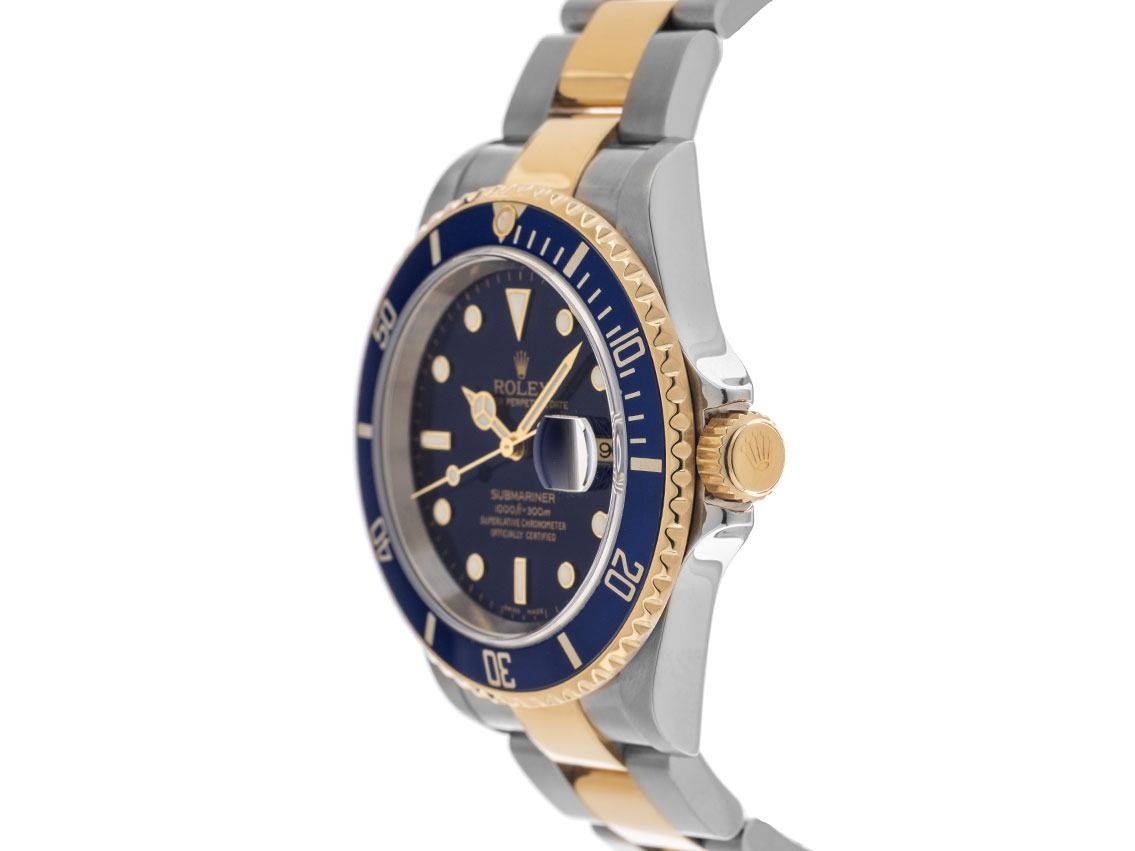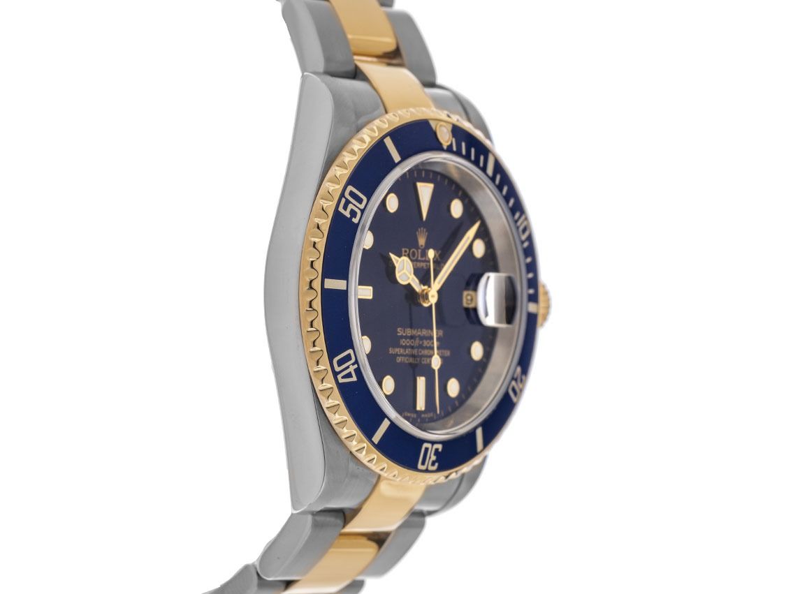 Gehäuse Edelstahl poliert und satiniert, Gehäusedurchmesser ohne Krone 40mm, Gehäusehöhe 12,8mm. Lünette 18kt Gelbgold mit blauem Inlay und 60-Minuten Skala, einseitig drehbar. Armband Oyster Edelstahl / 18kt Gelbgold poliert und satiniert, Sicherheitsfaltschließe Edelstahl mit Hersteller-Logo. Zifferblatt blau mit aufgesetzten in Gelbgold gefassten Indexen und Punkten sowie gelbgoldenen Zeigern. Uhrwerk Automatik, Chronometer, Rolex Manufakturkaliber 3135 mit 31 Edelsteinen. Anzeige von Stunde, Minute und Sekunde über Zeiger aus der Mitte mit Sekundenstopp zur sekundengenauen Einstellung der Uhrzeit, Datumsanzeige mit Schnellverstellung unter Glaslupe bei 3 Uhr. Saphirglas kratzfest. Krone verschraubbar mit Flankenschutz und Hersteller-Logo. Boden Edelstahl verschraubt. Gewicht der Uhr inklusive Armband 145g, Länge des Armbandes inklusive Gehäuse 175mm. Referenznummer: 16613, Gehäusenummer: D559XXX, Baujahr: 2005, ID: KA1570205160825H-13800, Artikelnummer: 10000081817. Mit Gangkontrolle und kompletter äußerlicher Aufarbeitung von August 2025. Original Rolex Box und Beschreibung, Ledermäppchen, Übersetzungsheft, Rolex Chronometer-Siegel und Watchregister Auszug von August 2025, The Watch Register Zertifikat / ohne Eintrag (Internationale Datenbank für verlorene oder gestohlene Uhren), Superschnäppchen, Kapitalanlage mit Wertsteigerungspotential, extrem seltenes Sammlerstück. Sehr guter Zustand. Lieferzeit sofort.
