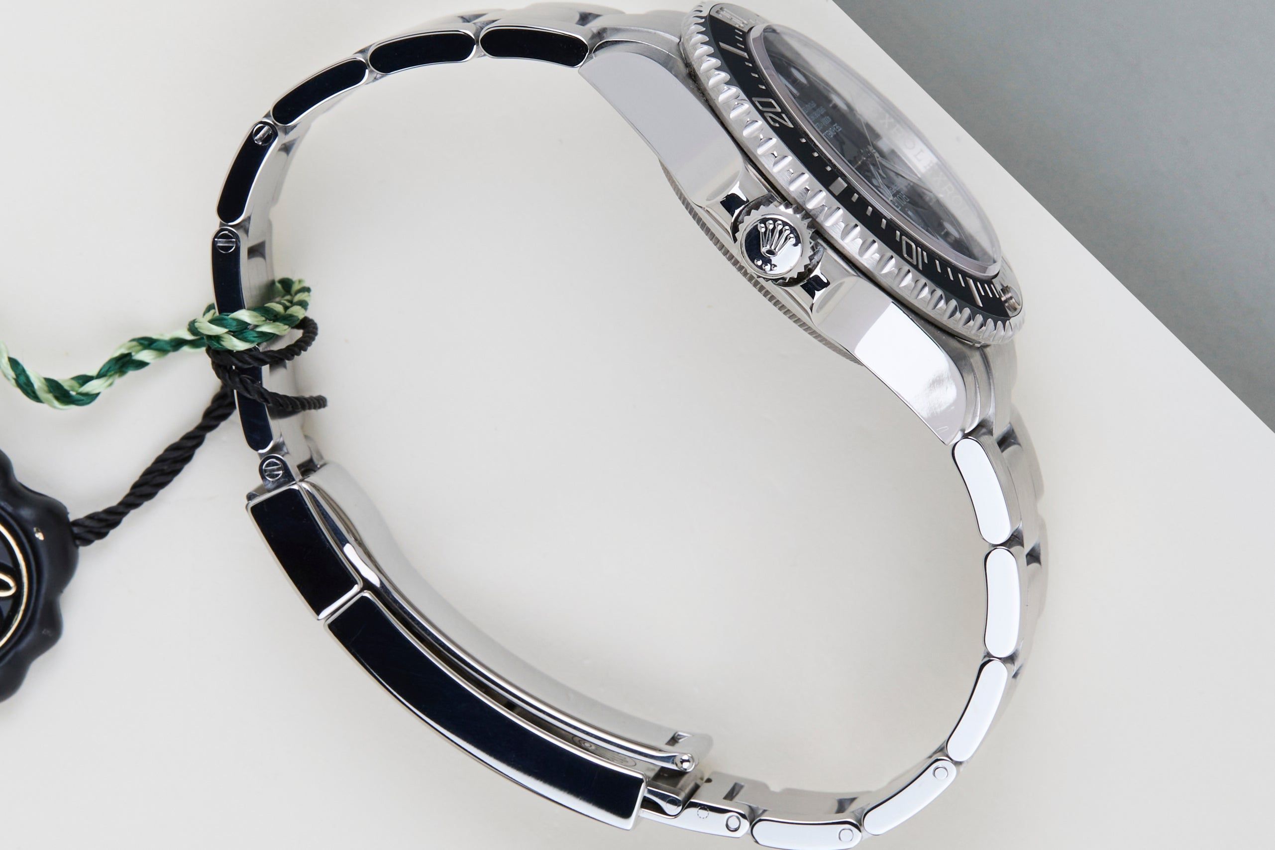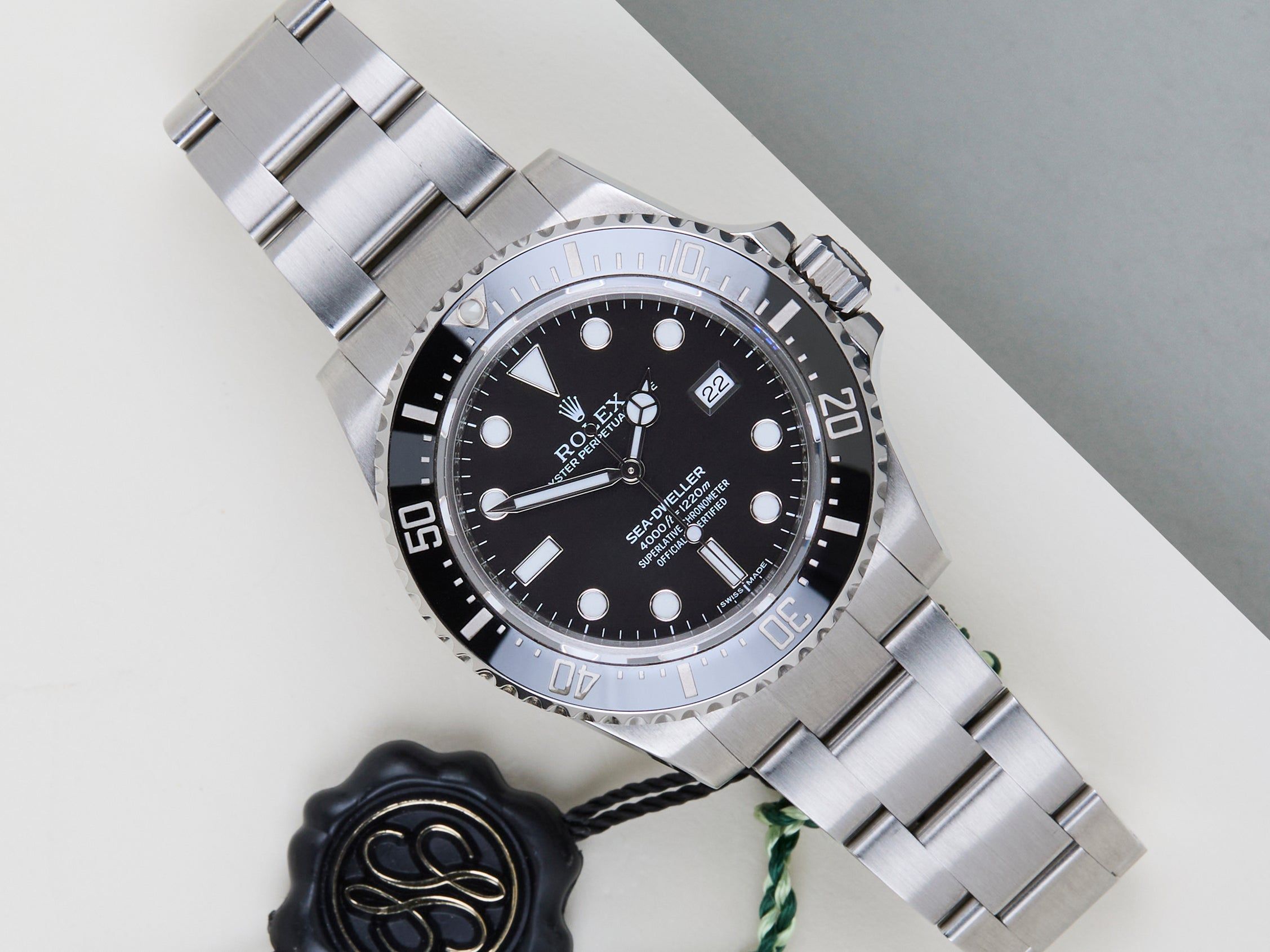 In 2008, Rolex shelved the Sea-Dweller model in favor of a new and much larger Deepsea Sea-Dweller (DSSD) watch. Nevertheless, after six years, the Swiss watchmaking giant decided to bring it back, and at Baselworld in 2014 the Sea-Dweller 4000 ref. 116600 made its debut. Rolex has been discontinued the 116600 in 2017.The rotatable bezel is one of the key functionalities of the Sea Dweller. The luminescent capsule on the zero marker makes sure that a diver is always able to accurately monitor diving time, no matter how dark the environment.The 40mm Sea-Dweller is equipped with a helium escape valve allowing for a water-resistance of 4,000ft or 1,220m. This Sea Dweller features a ceramic bezel, which is nearly scratch-proof.This Sea Dweller comes with a Black dial and bezel and the famous Rolex Oyster bracelet. The watch is fully made out of stainless steel. Rolex uses 904L in its steel watches, which is an extremely resistant and highly polishable superalloy.This specific Rolex Sea Dweller is originally delivered in July 2015 and is in Mint condition and comes as a full-set including the original Rolex papers and box. The watch has been serviced by our watchmakers and therefore comes with one year Steiner Warranty