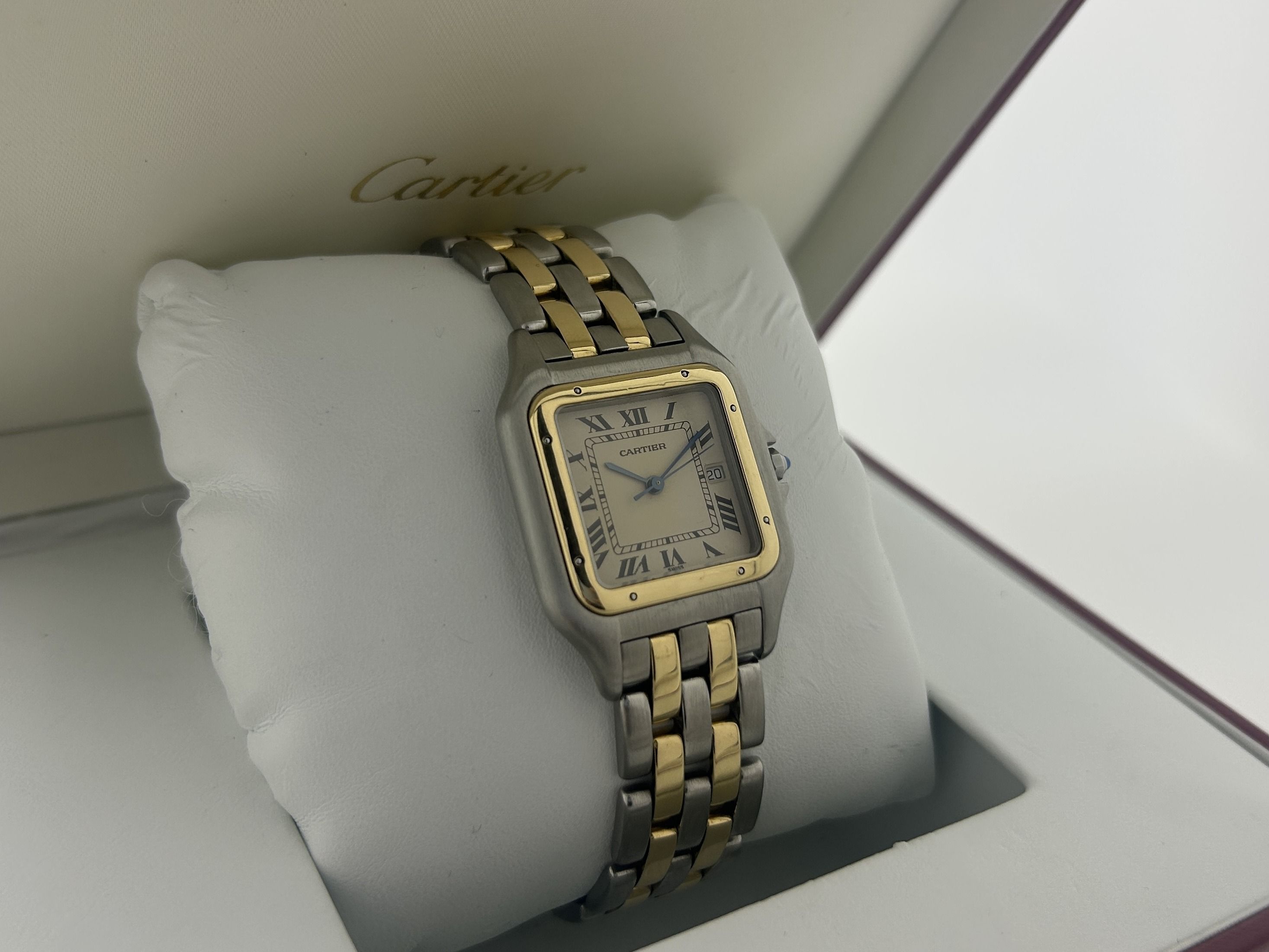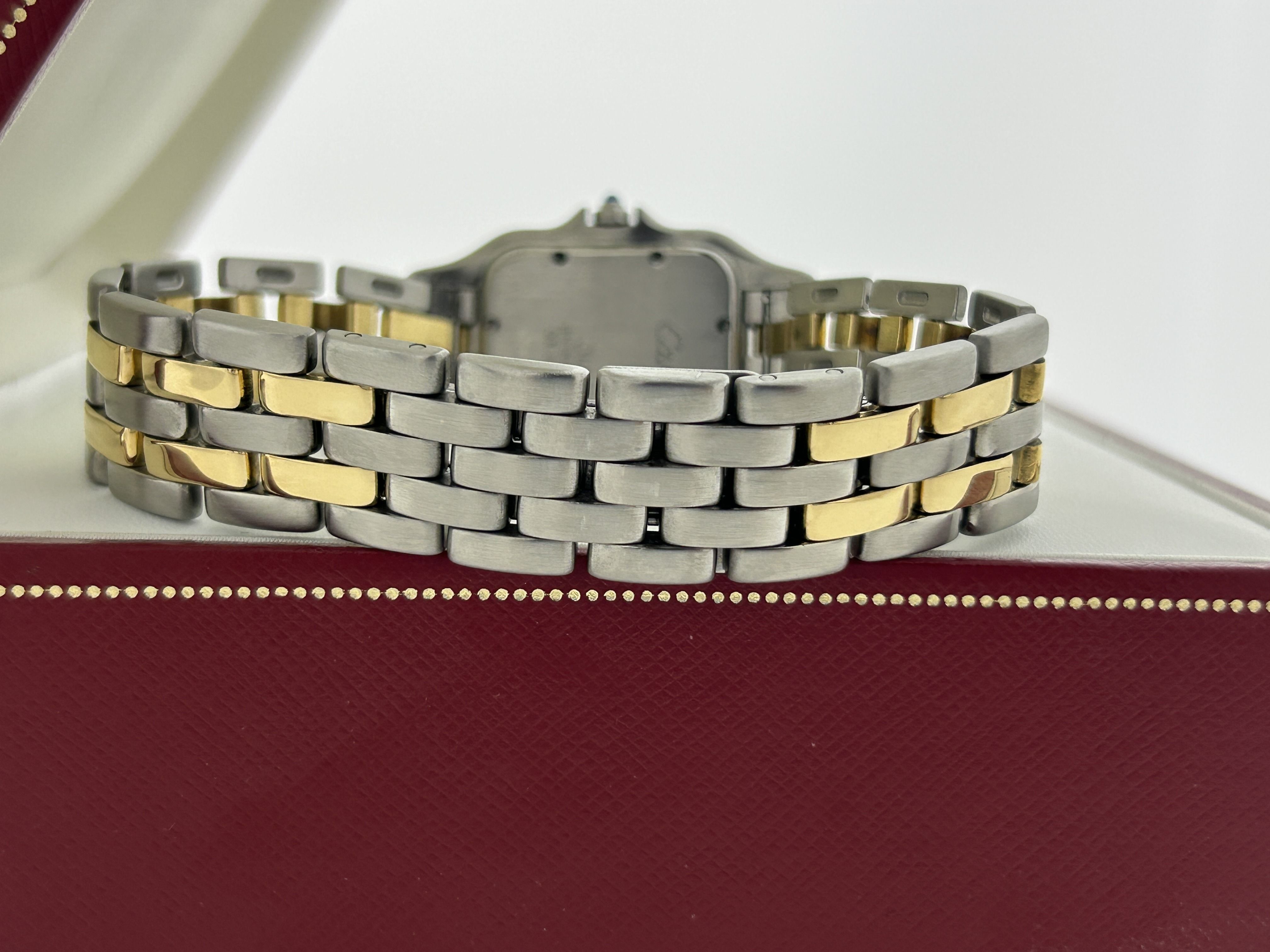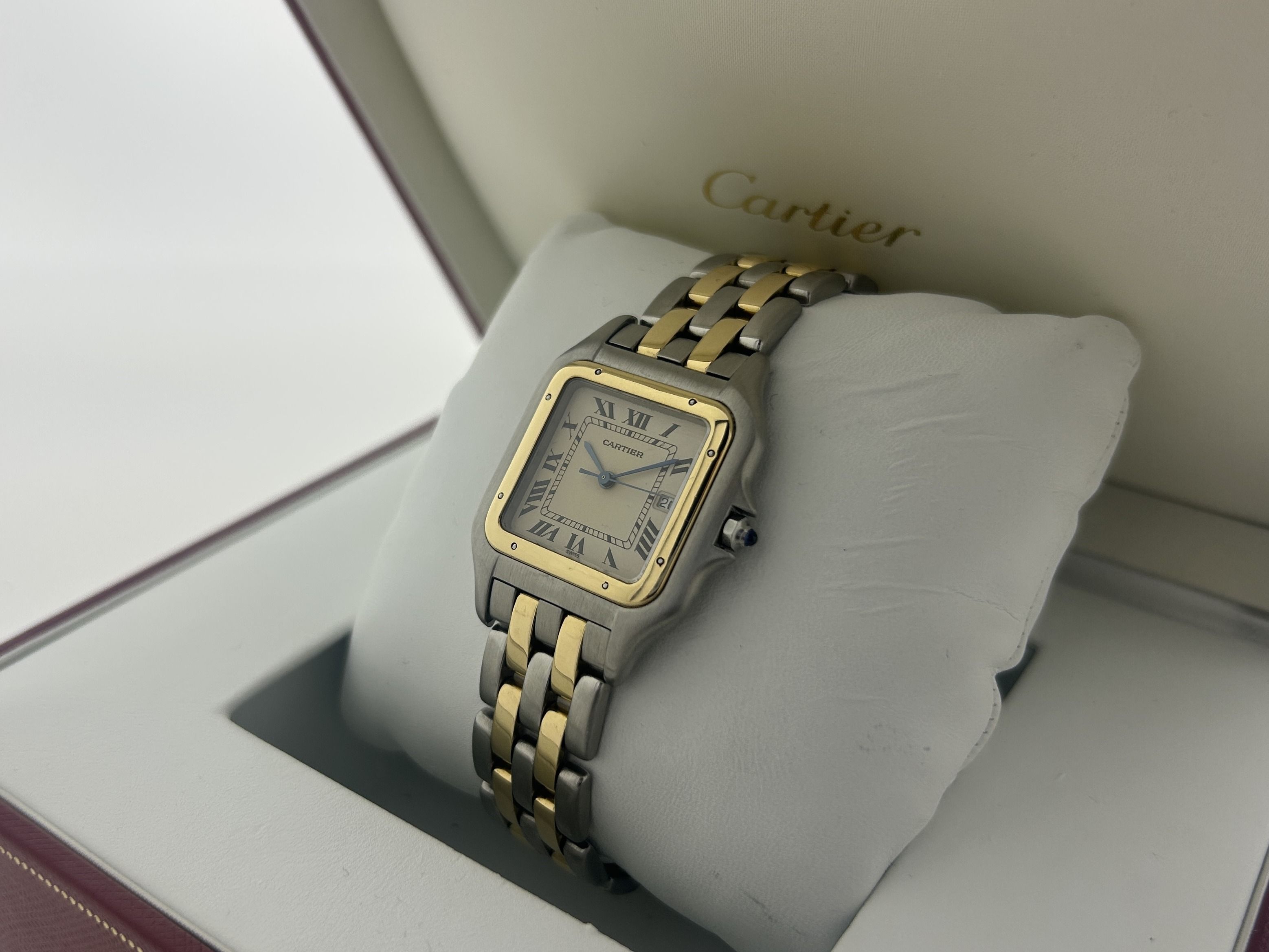 A gold/steel Cartier Panthère watch, ref. 839570. The Panthère is a large model with a steel 42 x 31mm case and a gold bezel. The watch has a gold/steel two row bracelet with a steel clasp. The Cartier Panthère has a silver colored dial with Roman numerals. The watch has been serviced recently and is in a good condition. The Cartier comes with its original box. The dial of the watch is slightly discolored.