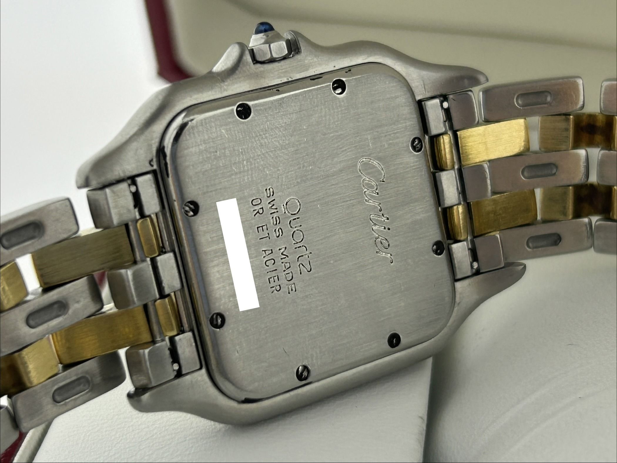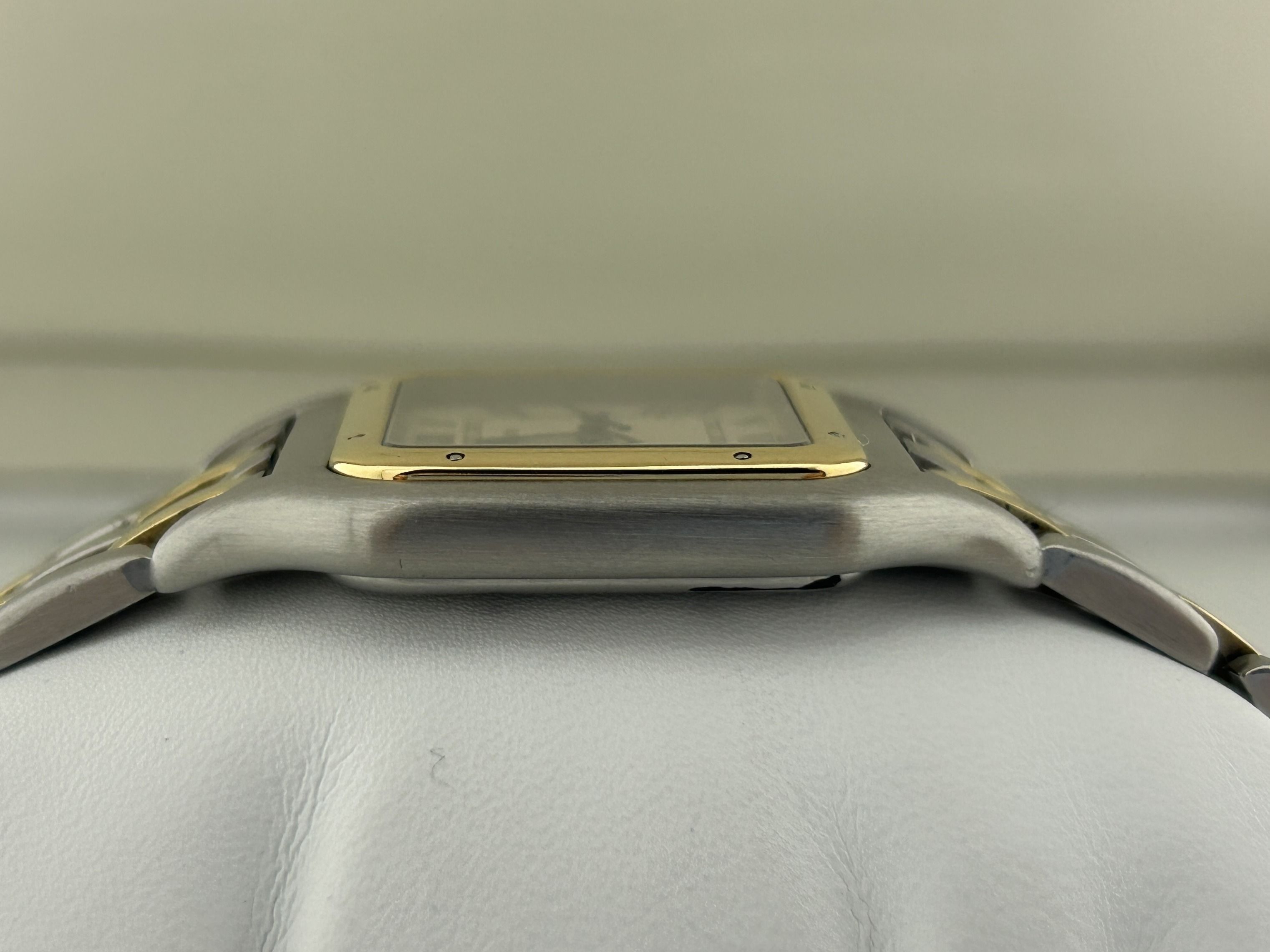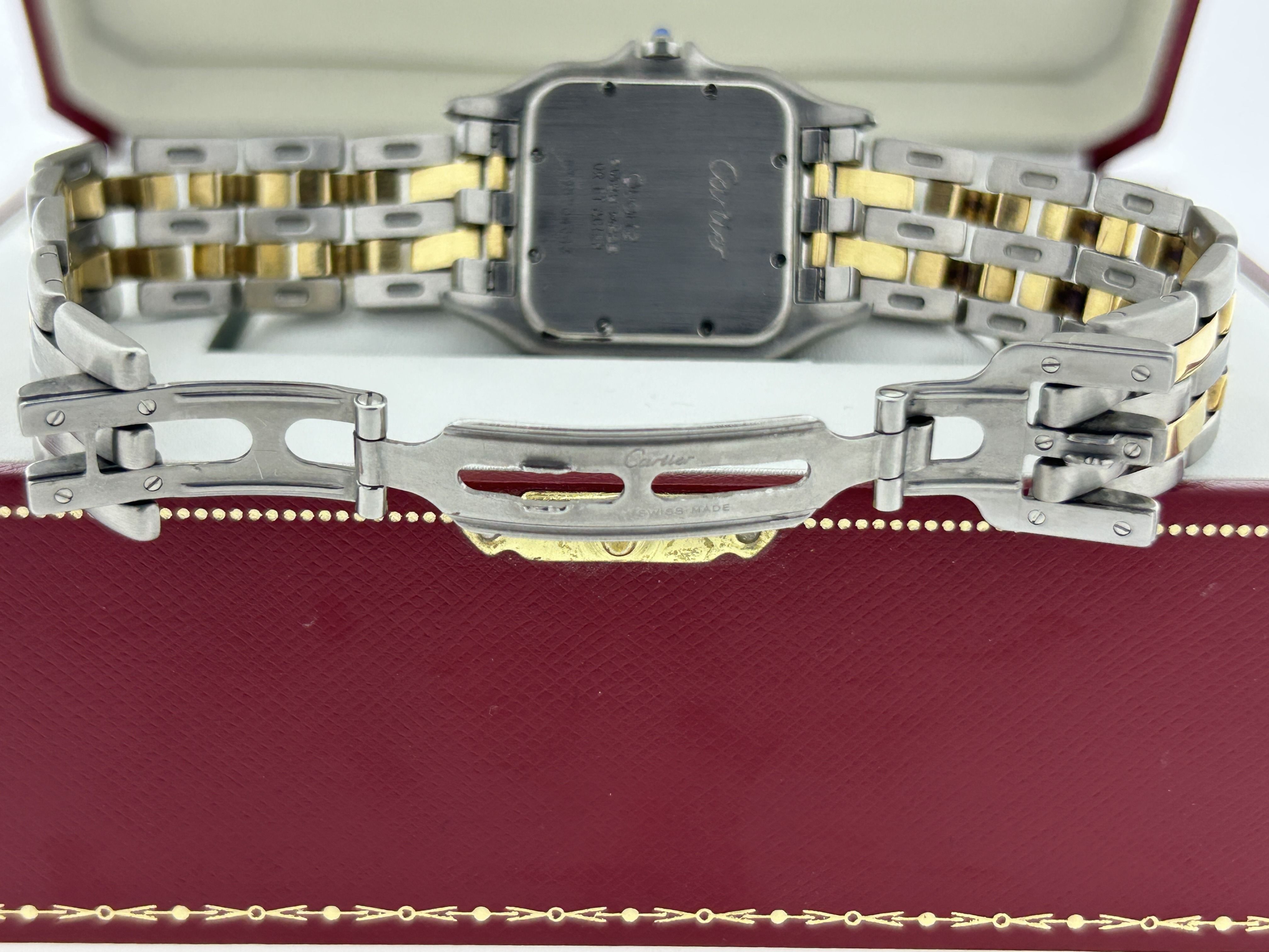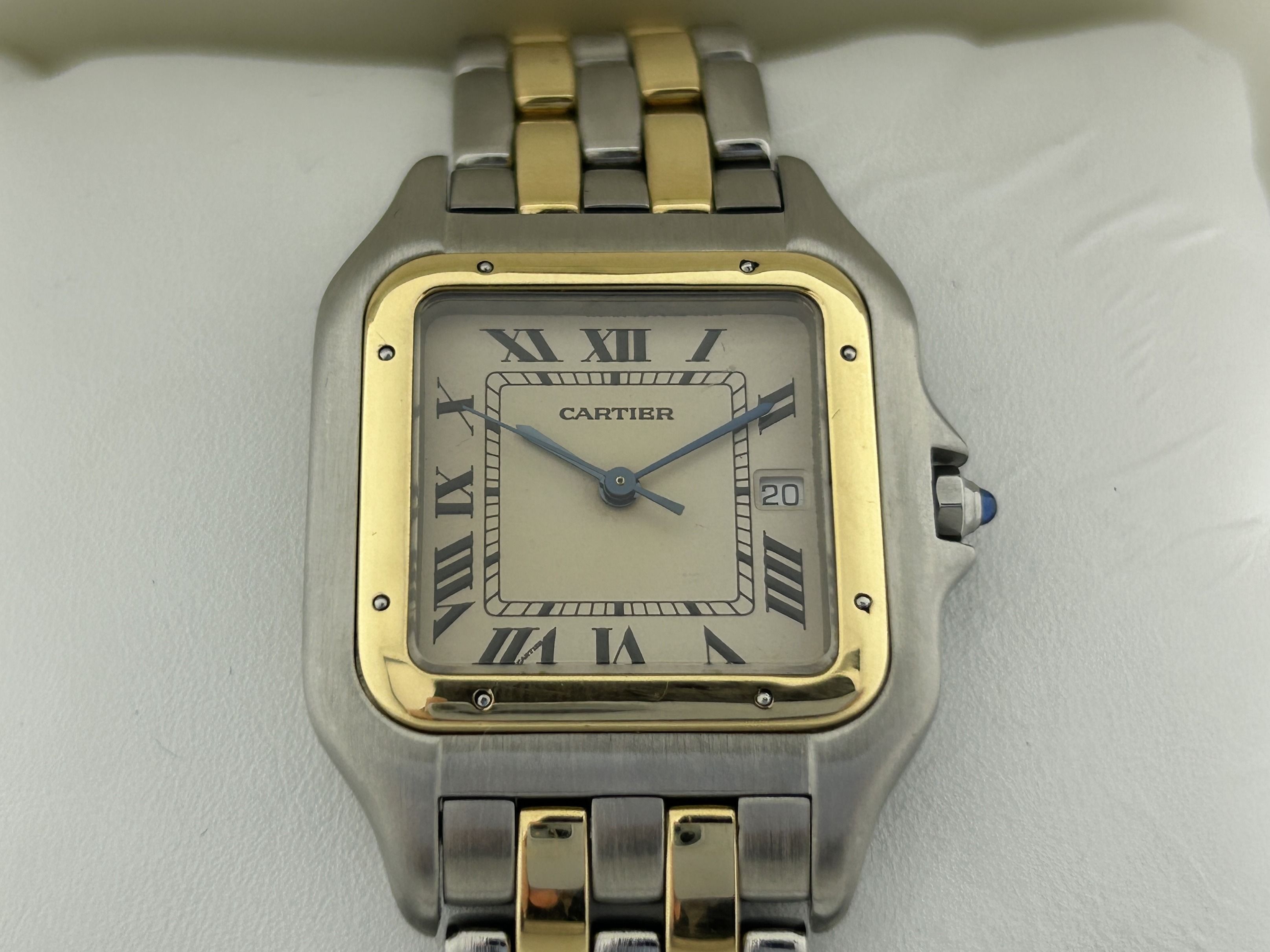 A gold/steel Cartier Panthère watch, ref. 839570. The Panthère is a large model with a steel 42 x 31mm case and a gold bezel. The watch has a gold/steel two row bracelet with a steel clasp. The Cartier Panthère has a silver colored dial with Roman numerals. The watch has been serviced recently and is in a good condition. The Cartier comes with its original box. The dial of the watch is slightly discolored.