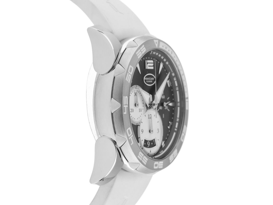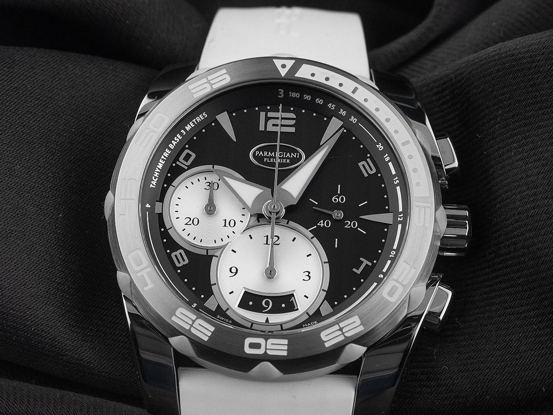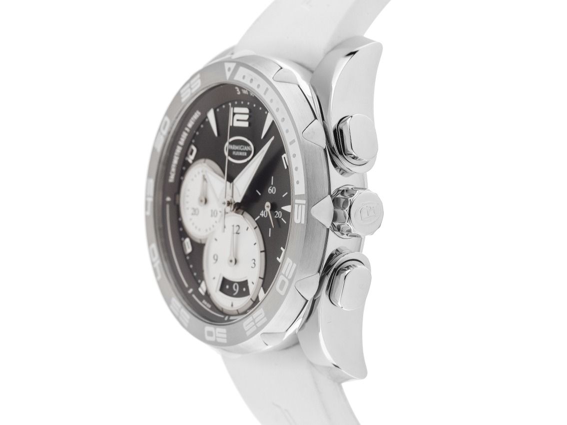 Gehäuse Edelstahl poliert, Gehäusedurchmesser ohne Krone 42mm, Gehäusehöhe 13,6mm. Lünette Edelstahl satiniert mit Kautschuk Einlagerungen. Armband Kautschuk weiß, Anstoßbreite 23mm, Sicherheitsfaltschließe Edelstahl mit Hersteller-Logo. Zifferblatt schwarz mit aufgesetzten Edelstahl Indexen, arabischen Ziffern und Edelstahl Zeigern. Uhrwerk Automatik, Chronograph, Kaliber 334 mit 68 Edelsteinen. Anzeige von Stunde und Minute über Zeiger aus der Mitte, kleine Sekunde mit Sekundenstopp zur sekundengenauen Einstellung der Uhrzeit bei 3 Uhr, Datumsanzeige mit Schnellverstellung bei 6 Uhr. Saphirglas kratzfest. Krone verschraubbar mit Hersteller-Logo. Boden Edelstahl 8-fach verschraubt und graviert. Gewicht der Uhr inklusive Armband 142g, Länge des Armbandes inklusive Gehäuse 190mm. Referenznummer: PFC528-0010300, Gehäusenummer: 42XXX, ID: P254375000226H-9900, Artikelnummer: 10000084861. Mit Gangkontrolle und kompletter äußerlichen Aufarbeitung von Februar 2026. Original Parmigiani Box mit Umkarton und Garantie Papiere von Dezember 2012 sowie Watchregister Auszug von Februar 2026, The Watch Register Zertifikat / ohne Eintrag (Internationale Datenbank für verlorene oder gestohlene Uhren), Full Set. Kapitalanlage mit Wertsteigerungspotential. Wie Neu. Lieferzeit sofort.