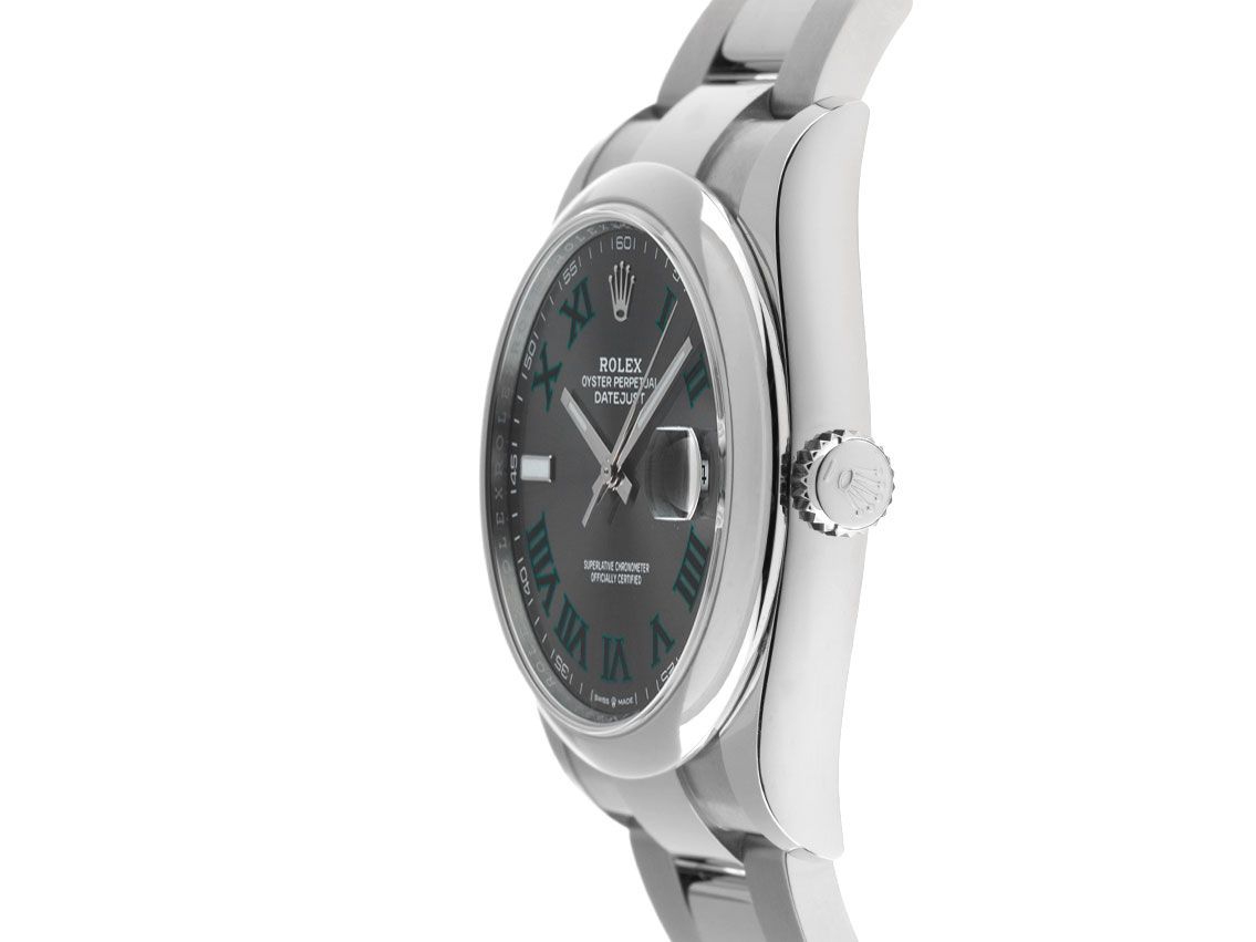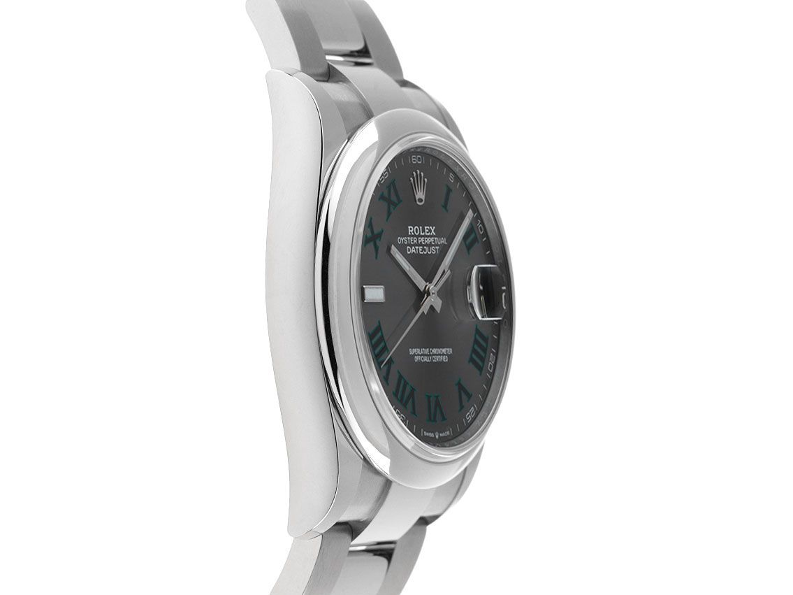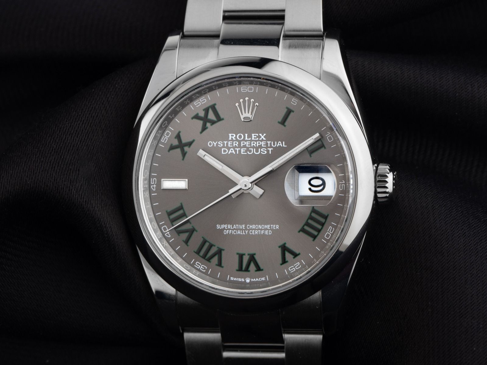 Gehäuse Edelstahl poliert und satiniert, Gehäusedurchmesser ohne Krone 36mm, Gehäusehöhe 11,6mm. Lünette Edelstahl glatt und poliert. Armband Oyster Edelstahl poliert und satiniert, Faltschließe Edelstahl mit Hersteller-Logo. Zifferblatt schiefergrau mit aufgesetzten weißgoldenem Index, dunkelgrünen römischen Ziffern und weißgoldenen Zeigern. Uhrwerk Automatik, Chronometer mit Zeugnis, Rolex Manufakturkaliber 3235 mit 31 Edelsteinen, ca. 70 Stunden Gangreserve. Anzeige von Stunde, Minute und Sekunde über Zeiger aus der Mitte mit Sekundenstopp zur sekundengenauen Einstellung der Uhrzeit, Datumsanzeige mit Schnellverstellung unter Glaslupe bei 3 Uhr. Saphirglas kratzfest. Krone verschraubbar mit Hersteller-Logo. Boden Edelstahl verschraubt. Gewicht der Uhr inklusive Armband 123g, Länge des Armbandes inklusive Gehäuse 170mm. Wasserdicht bis 10 ATM. Referenznummer: 126200, Gehäusenummer: 950R2XXX, ID: P2532170500226H-12900/7850, Artikelnummer: 10000084848. Original Rolex Box mit Umkarton und Garantie Papiere von November 2021, neue Rolex Garantie Karte ohne Ländercode sowie Beschreibung, Ledermäppchen, Rolex Chronometer-Siegel, Tag und Watchregister Auszug von Februar 2026, The Watch Register Zertifikat / ohne Eintrag (Internationale Datenbank für verlorene oder gestohlene Uhren), Full Set. Wie Neu. Lieferzeit sofort.