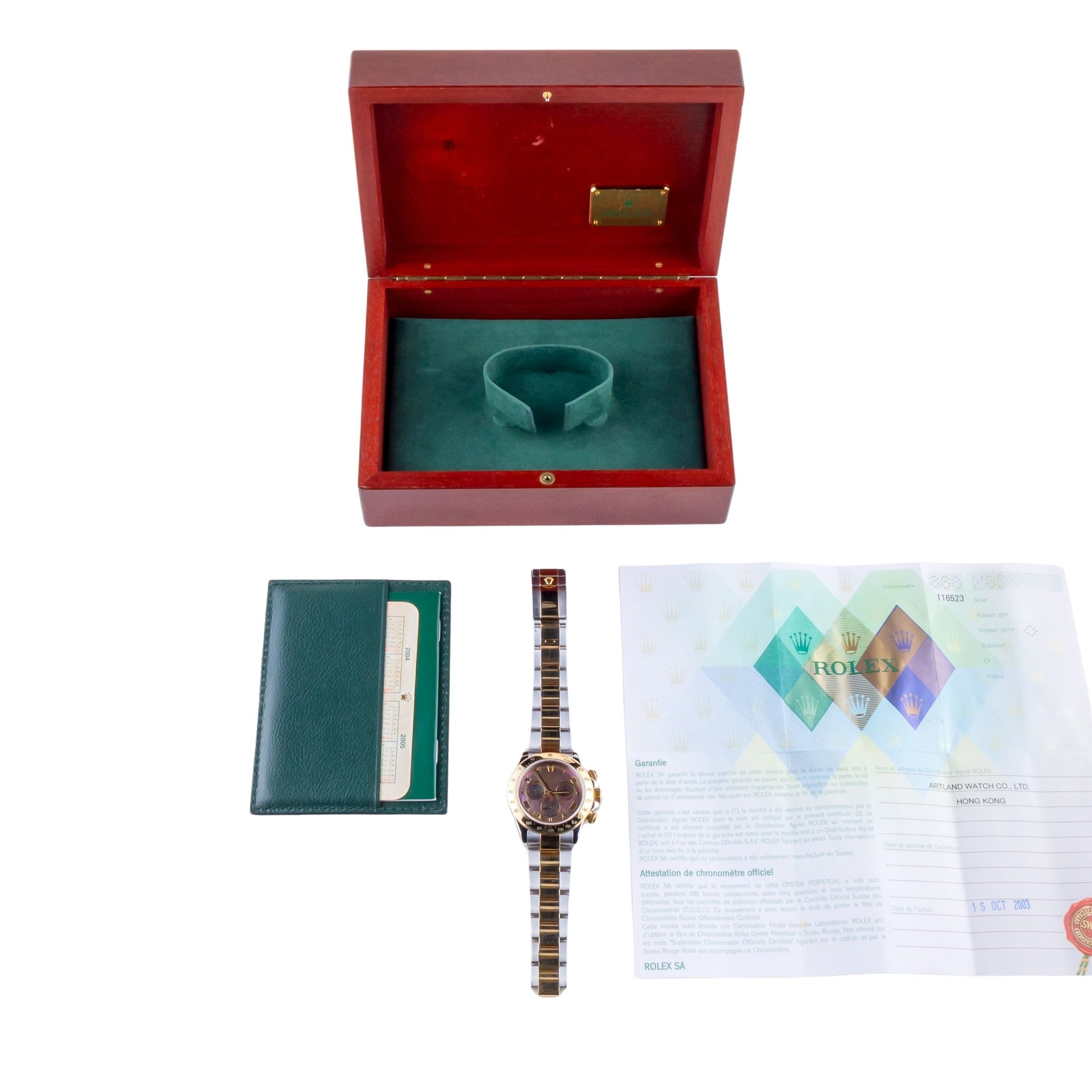 Rolex Daytona reference 116523 from 2003 including full set. The Rolex Daytona reference 116523 measures a 40mm gold/stainless steel case, features a gold/stainless steel Oyster bracelet and 18k yellow gold bezel. The Rolex Daytona 116523 is powered by an in-house Caliber 4130 movement that features a chronograph function, allowing you to time your activities with accuracy and ease.