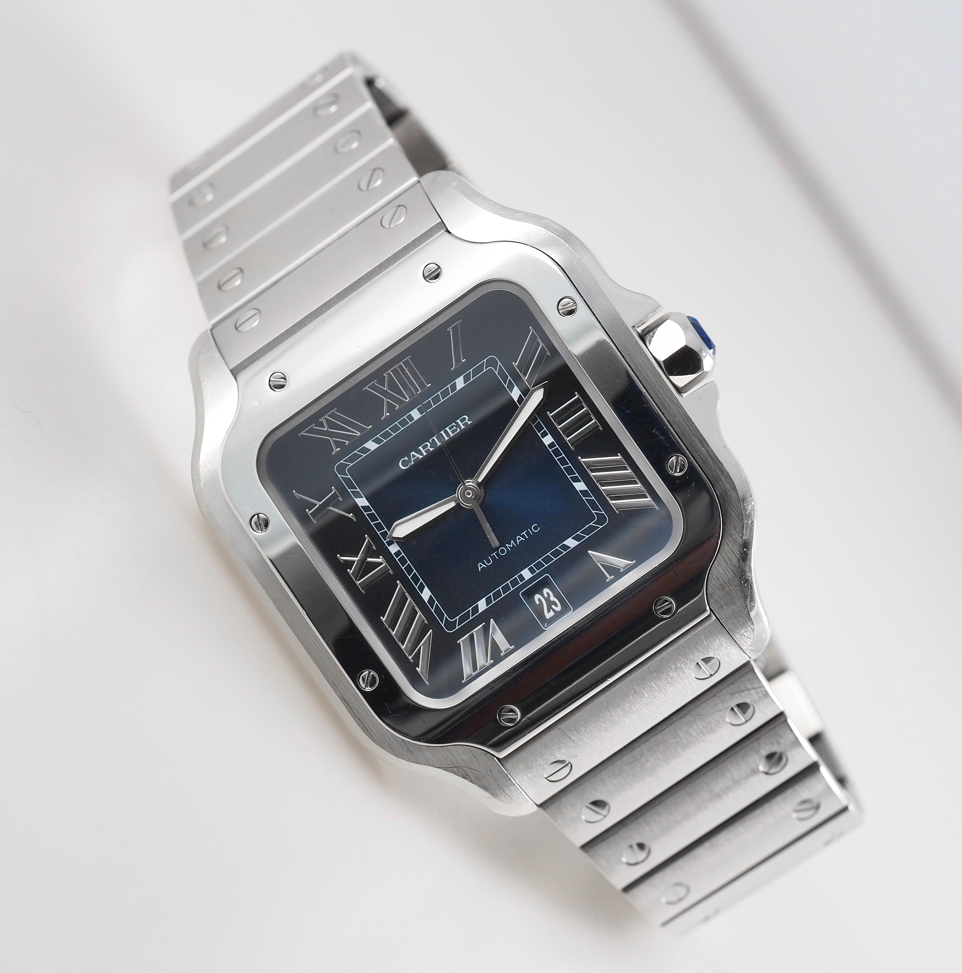 The watch features the high-shine bezel and sapphire crystal showing the stunning Blue roman Cartier dial.