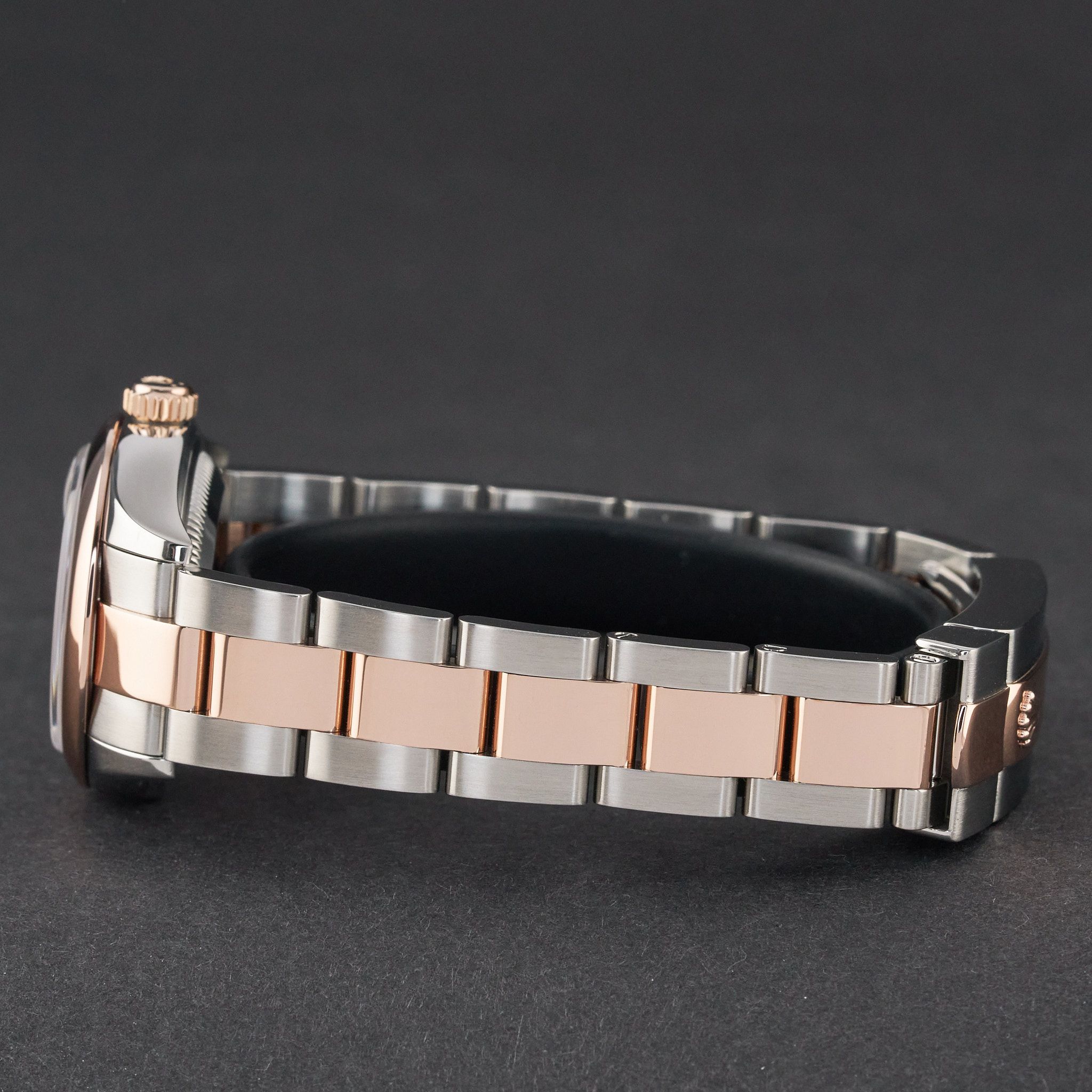 This Rolex Lady-Datejust 279161 features a White Roman dial and is crafted from 18K rose gold and stainless steel, with a production year of 2008.