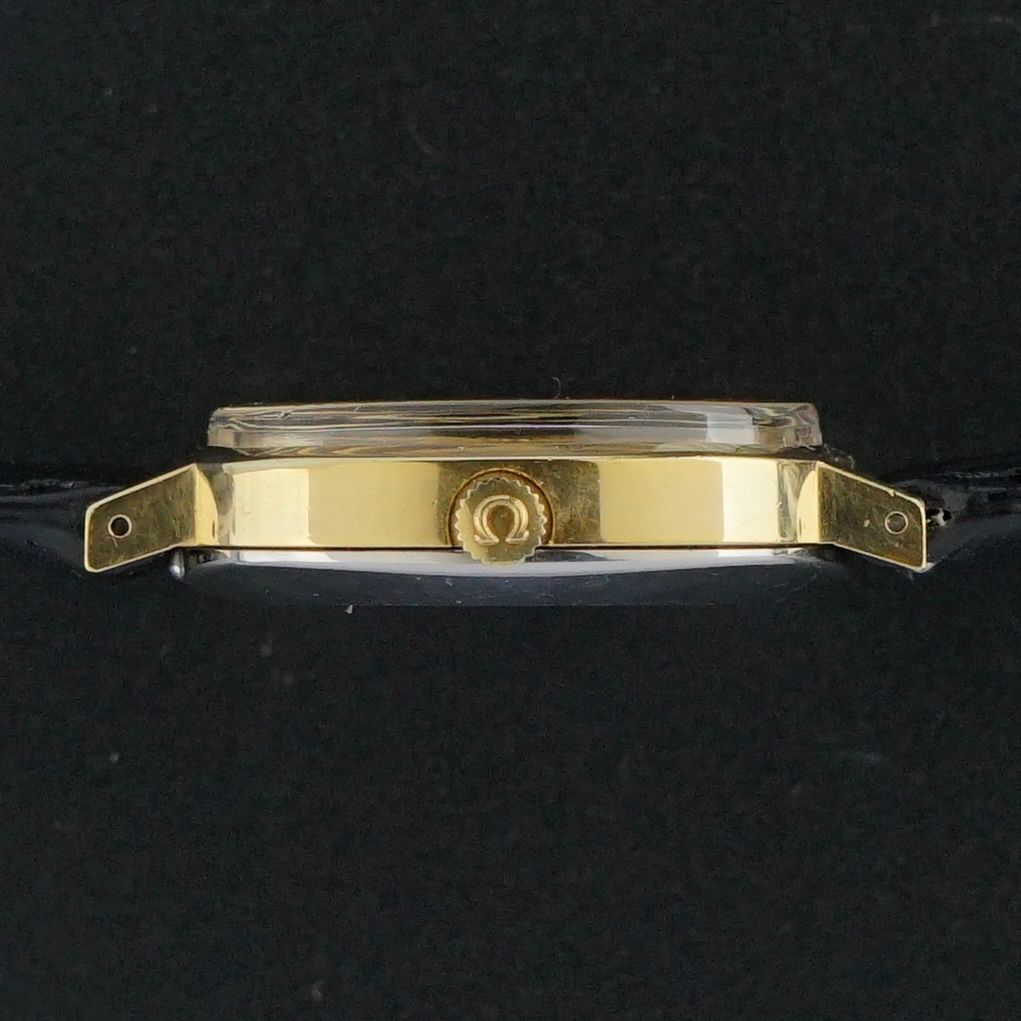A beautiful vintage Omega De Ville produced in 1973, featuring a distinctive case design and a horizontally brushed golden colored dial finish that gives the watch a refined, striking look. The dial is fitted with black hour and minute hands, complemented by sandwiched hour markers that add depth and character. A golden seconds hand and applied golden Omega logo enhance the warm tones of the dial, while the date window at 3 o’clock provides practical functionality.