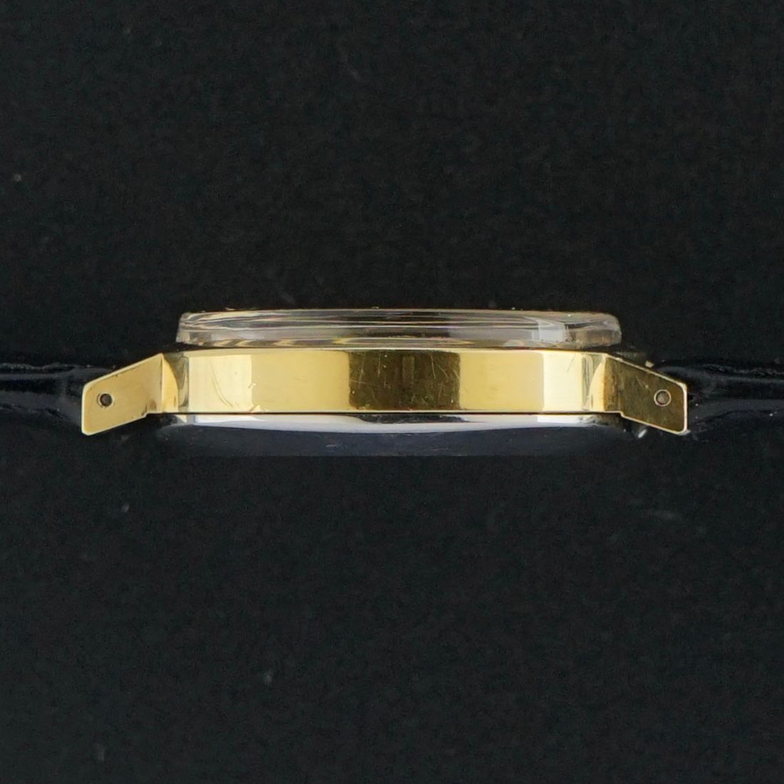 The watch is paired with a top grain leather strap with a crocodile motif and a light glossy finish, perfectly matching its elegant appearance. The overall condition of this piece is great, making it an excellent dress watch with true 1970s charm.