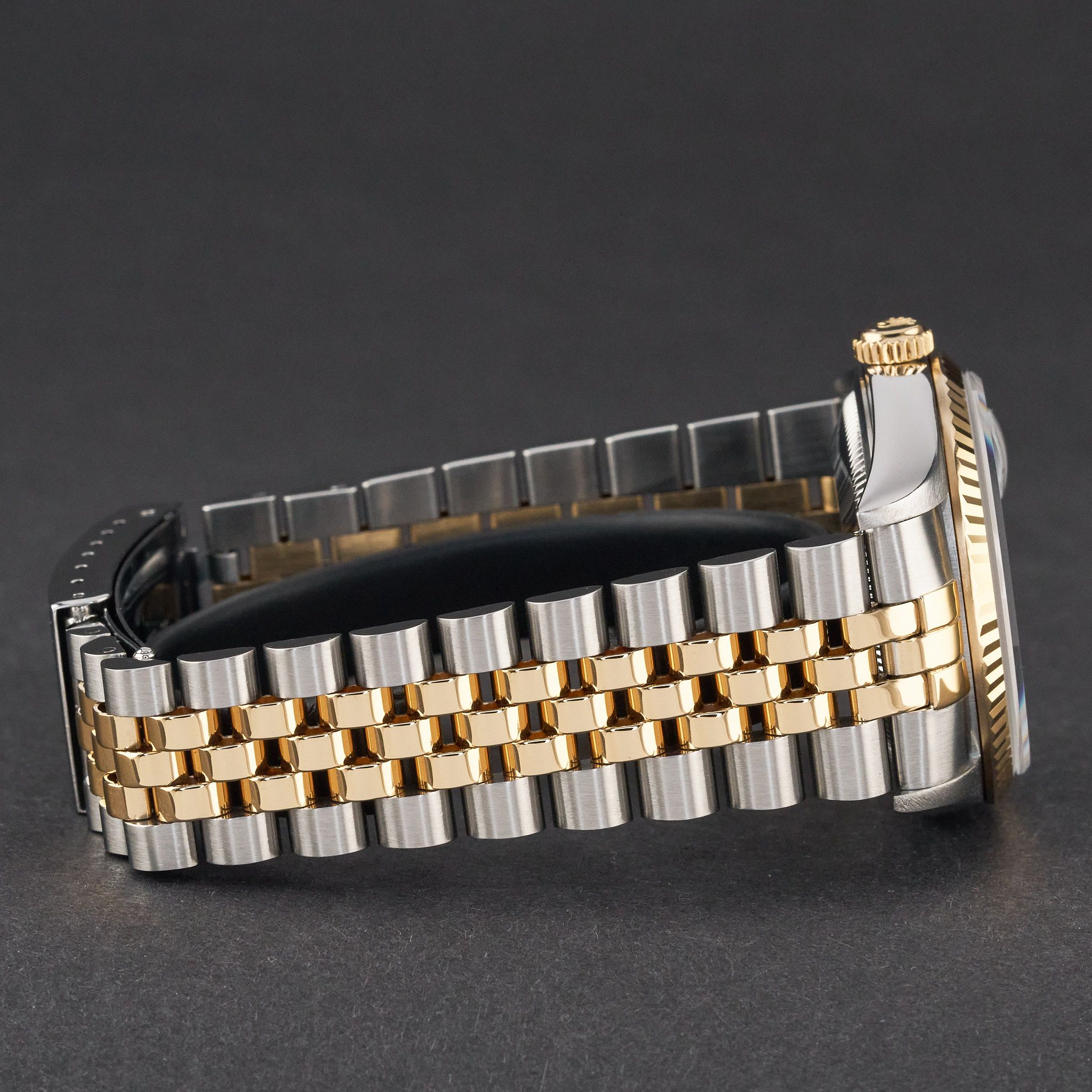 This Rolex Datejust 16233 features a Black dial and is crafted from 18K yellow gold and stainless steel, with a production year of 2000.