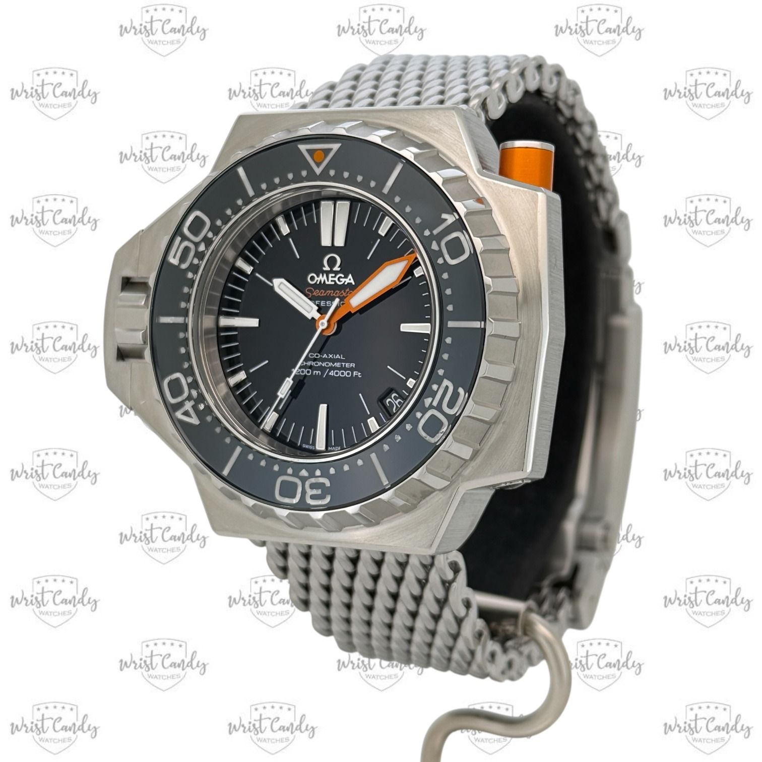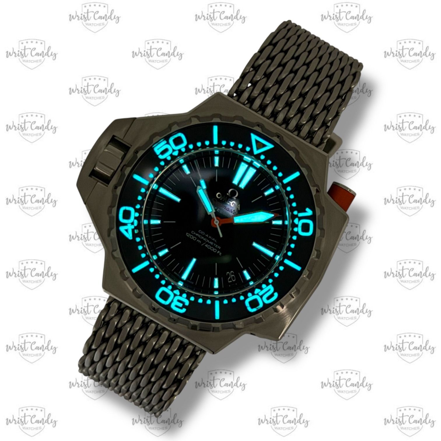band • rubber + mesh band (beide uiteraard origineel Omega) op microverstelbare vouwsluiting t.w.v. € 740,-