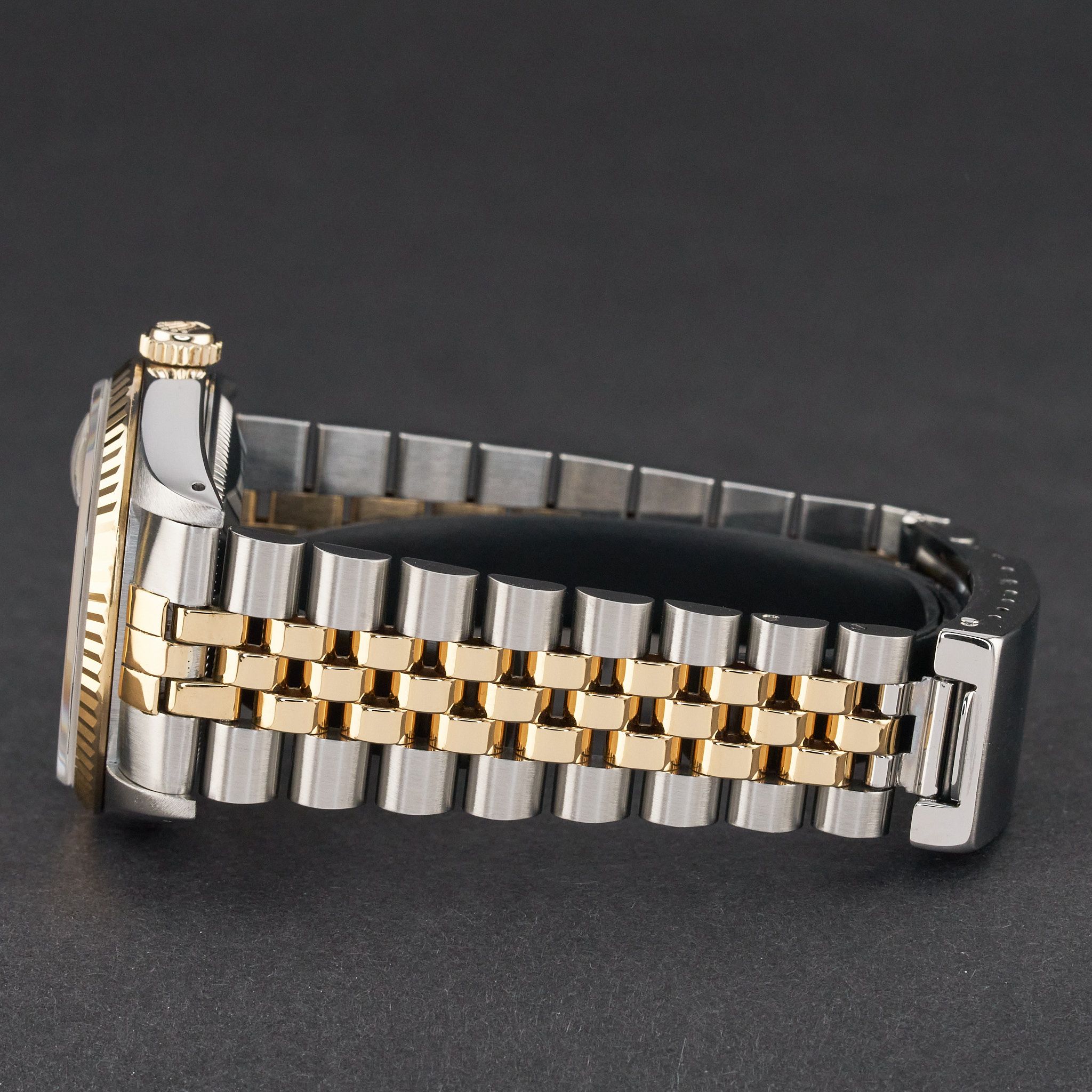 This Rolex Datejust 16233 features a Champagne small diamond dial and is crafted from 18K yellow gold and stainless steel, with a production year of 1988.