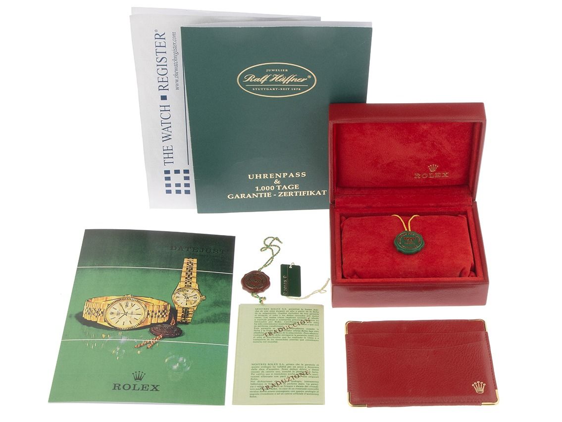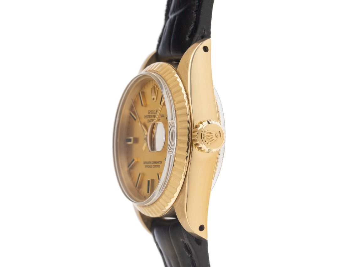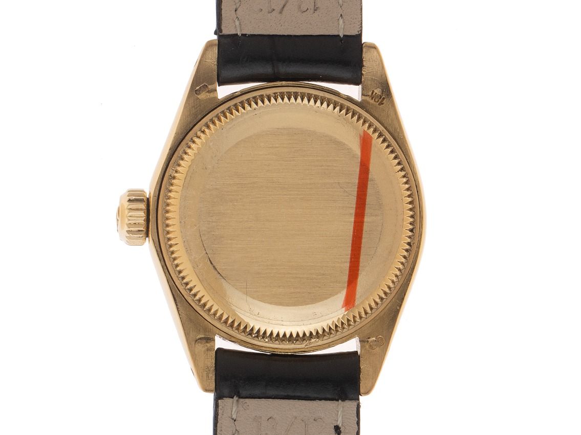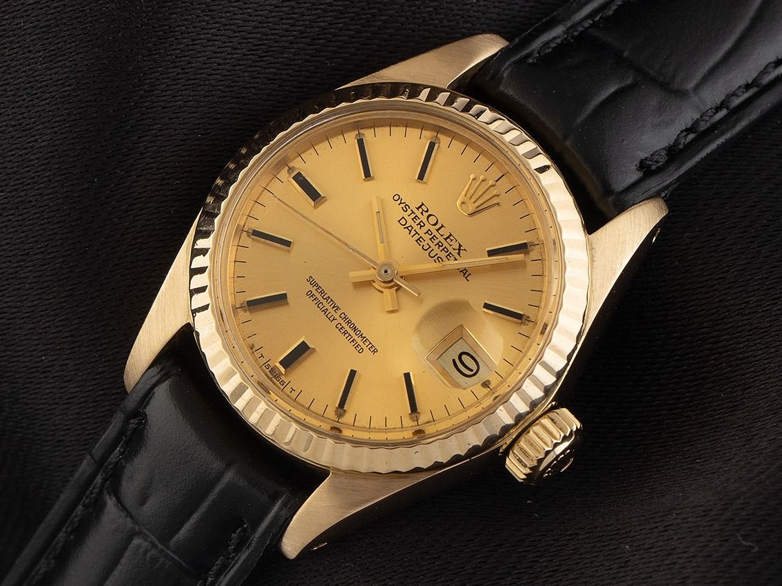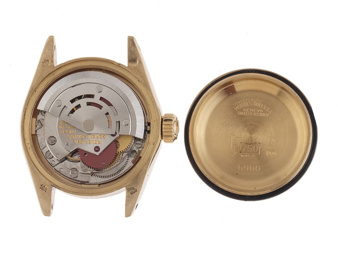 Gehäuse 18kt Gelbgold poliert und satiniert, Gehäusedurchmesser ohne Krone 26mm, Gehäusehöhe 11,2mm. Lünette 18kt Gelbgold geriffelt und poliert. Armband Leder schwarz, Anstoßbreite 13mm, Stiftschließe vergoldet. Zifferblatt champagnerfarben mit aufgesetzten gelbgoldenen Indexen und gelbgoldenen Zeigern. Uhrwerk Automatik, Chronometer, Rolex Manufakturkaliber 2030 mit 28 Edelsteinen. Anzeige von Stunde, Minute und Sekunde über Zeiger aus der Mitte mit Sekundenstopp zur sekundengenauen Einstellung der Uhrzeit, Datumsanzeige unter Glaslupe bei 3 Uhr, open 6/9 (offene 6 und 9 in der Datumsanzeige). Plexiglas. Krone verschraubbar mit Hersteller-Logo. Boden 18kt Gelbgold verschraubt. Gewicht der Uhr inklusive Armband 35g. Referenznummer: 6917, Gehäusenummer: 5922XXX, Baujahr: 1979, ID: P255460000226H-6200, Artikelnummer: 10000084876. Mit Gangkontrolle und kompletter äußerlicher Aufarbeitung von Februar 2026. Original Rolex Box und Beschreibung, Übersetzungsheft, Ledermäppchen, Rolex Chronometer-Siegel, Tag und Watchregister Auszug von Januar 2026, The Watch Register Zertifikat / ohne Eintrag (Internationale Datenbank für verlorene oder gestohlene Uhren). Kapitalanlage mit Wertsteigerungspotential, sehr seltenes Sammlerstück. Sehr guter Zustand. Lieferzeit sofort.