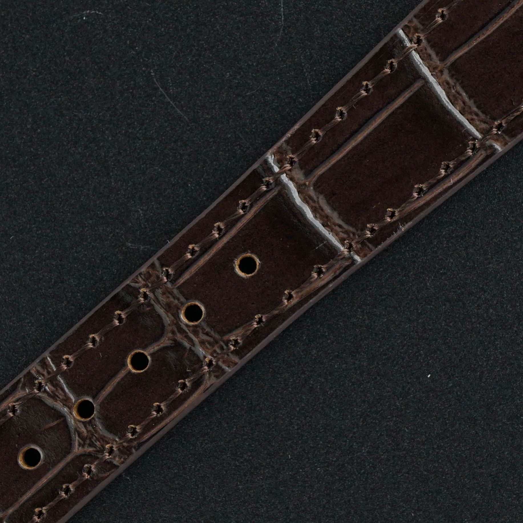 Strap: A brown hand-made premium leather strap with a crocodile motif. (Fits a 13 to 21cm wrist)