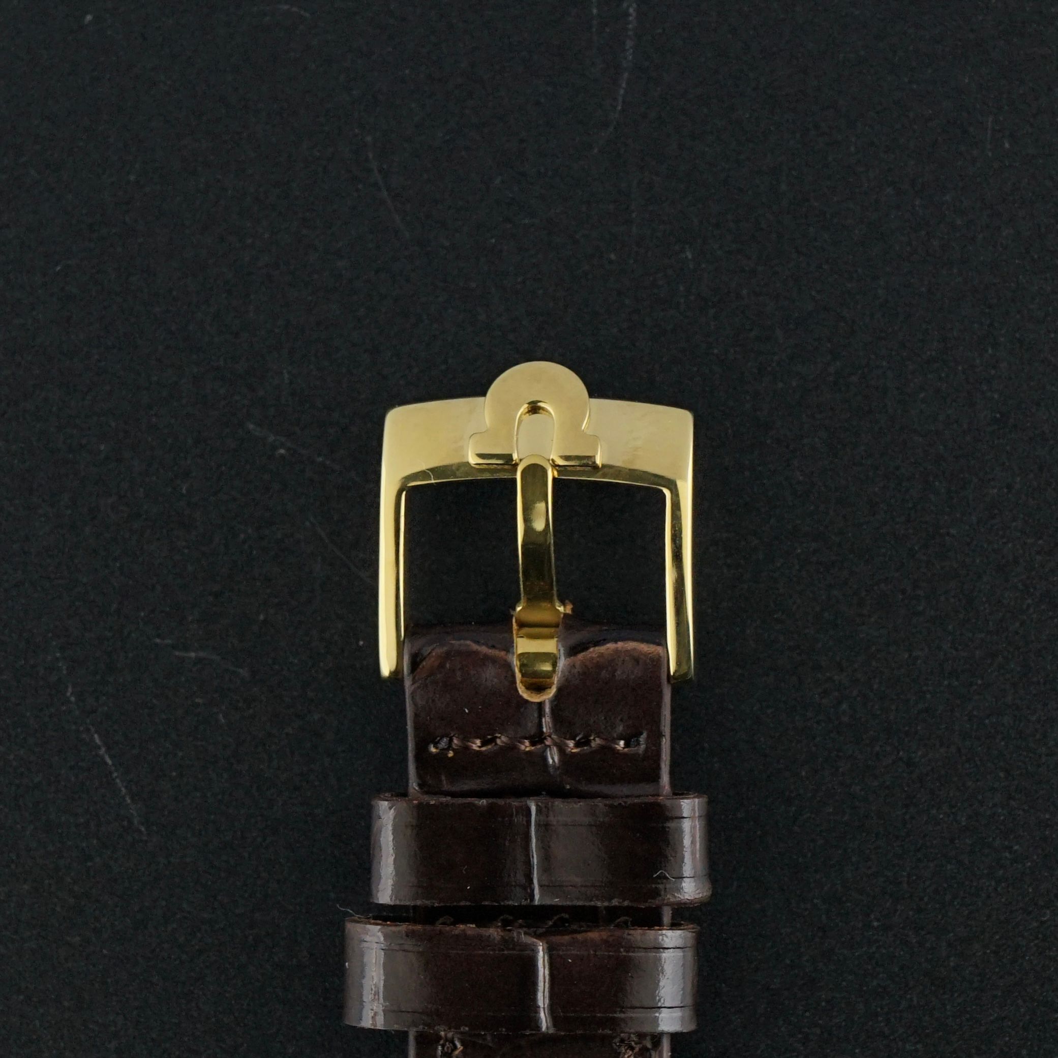 We have paired the watch with a brown handmade premium leather strap with a crocodile motif and a light glossy finish, perfectly complementing the tone of the case. The original plexiglass shows a small scratch near the edge around the 5 o’clock position, which could be replaced if desired, though it has been left as is to maintain originality.