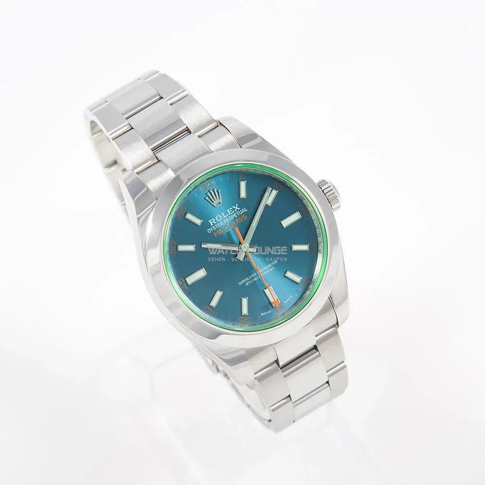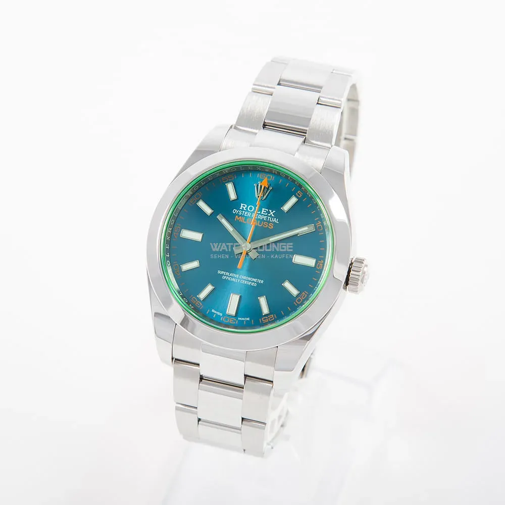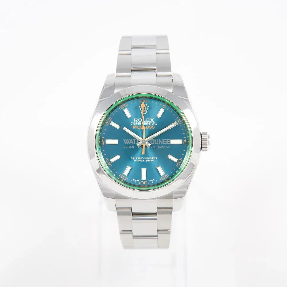 Original Rolex Milgauss with blue dial and green glass.