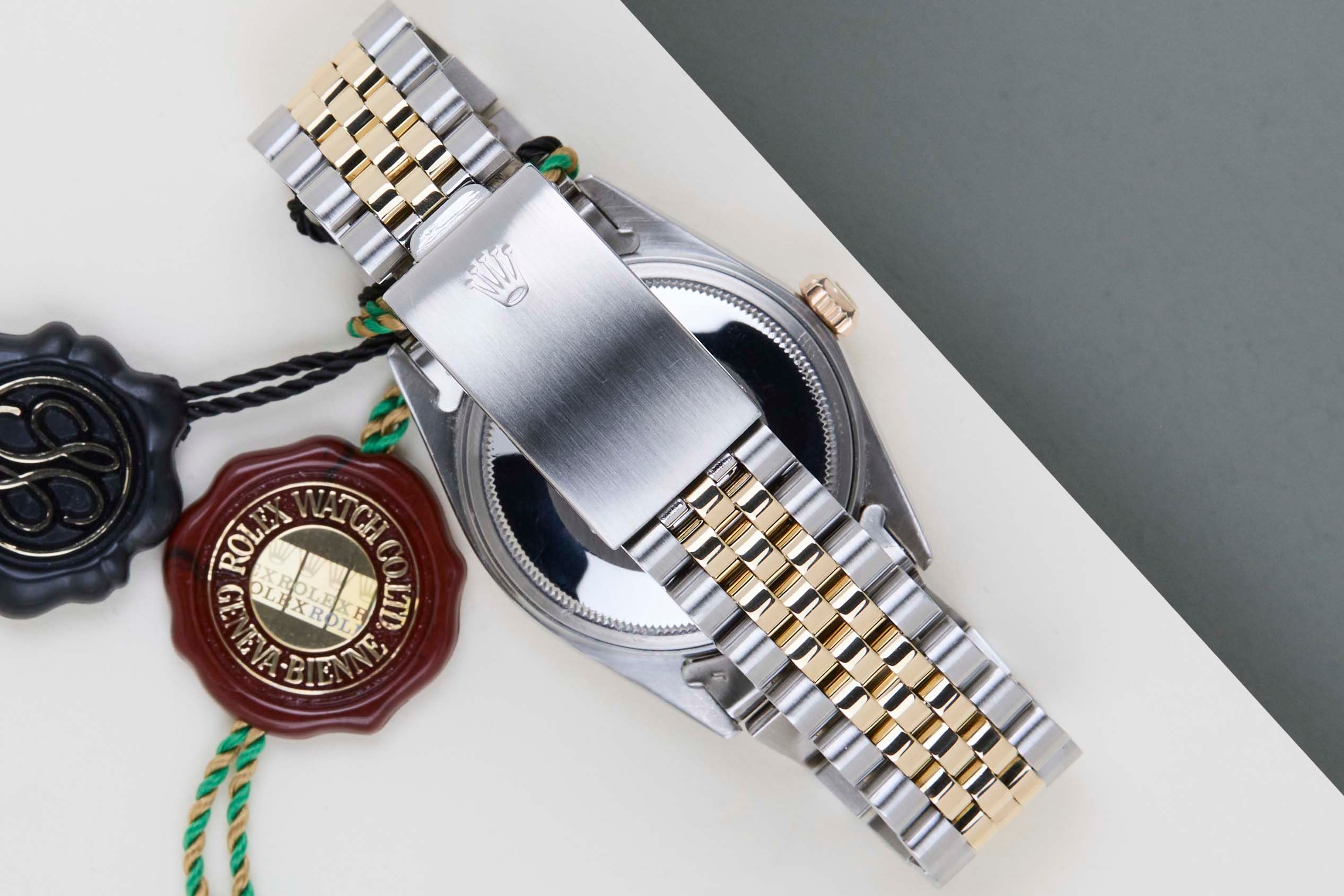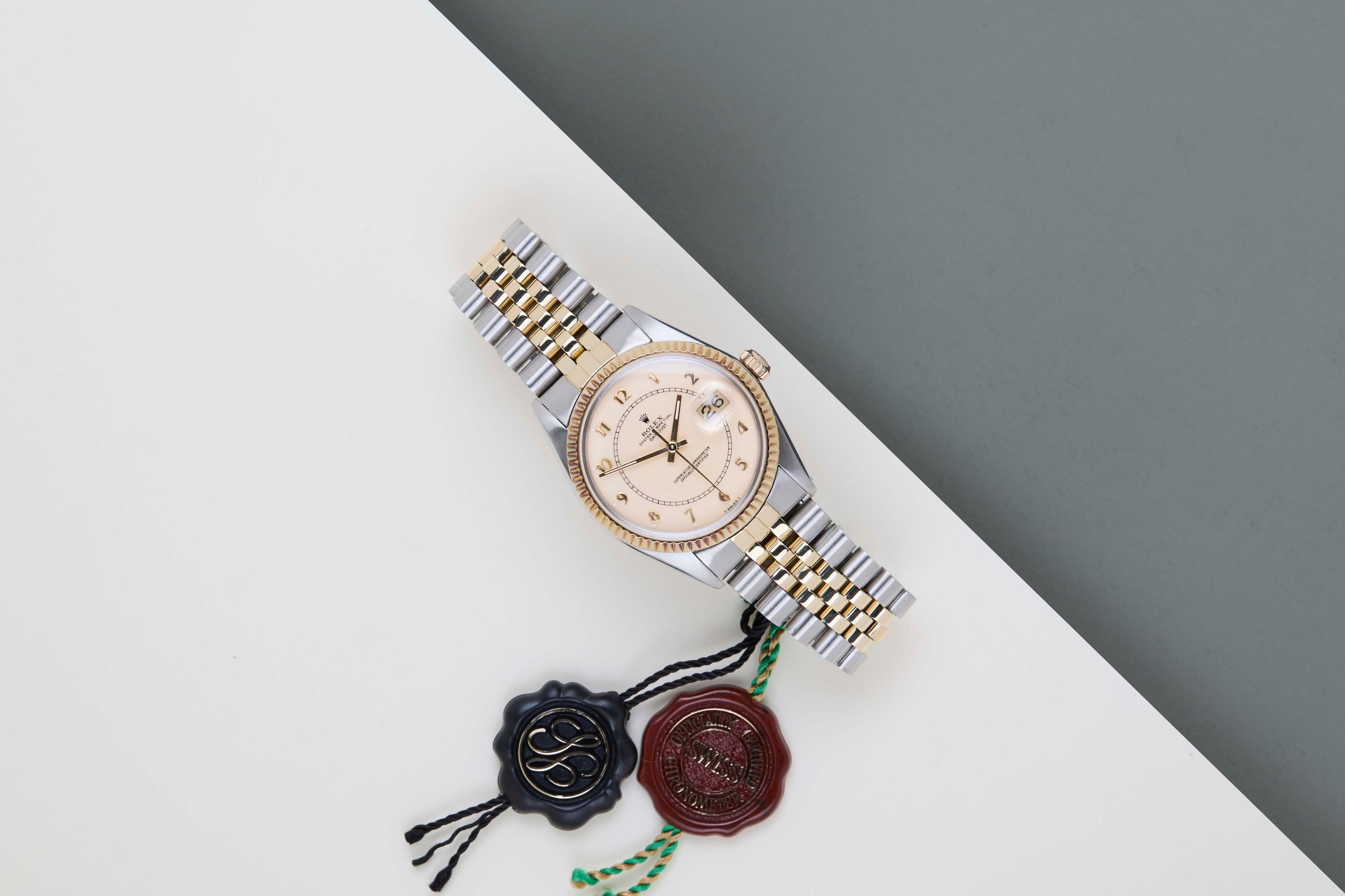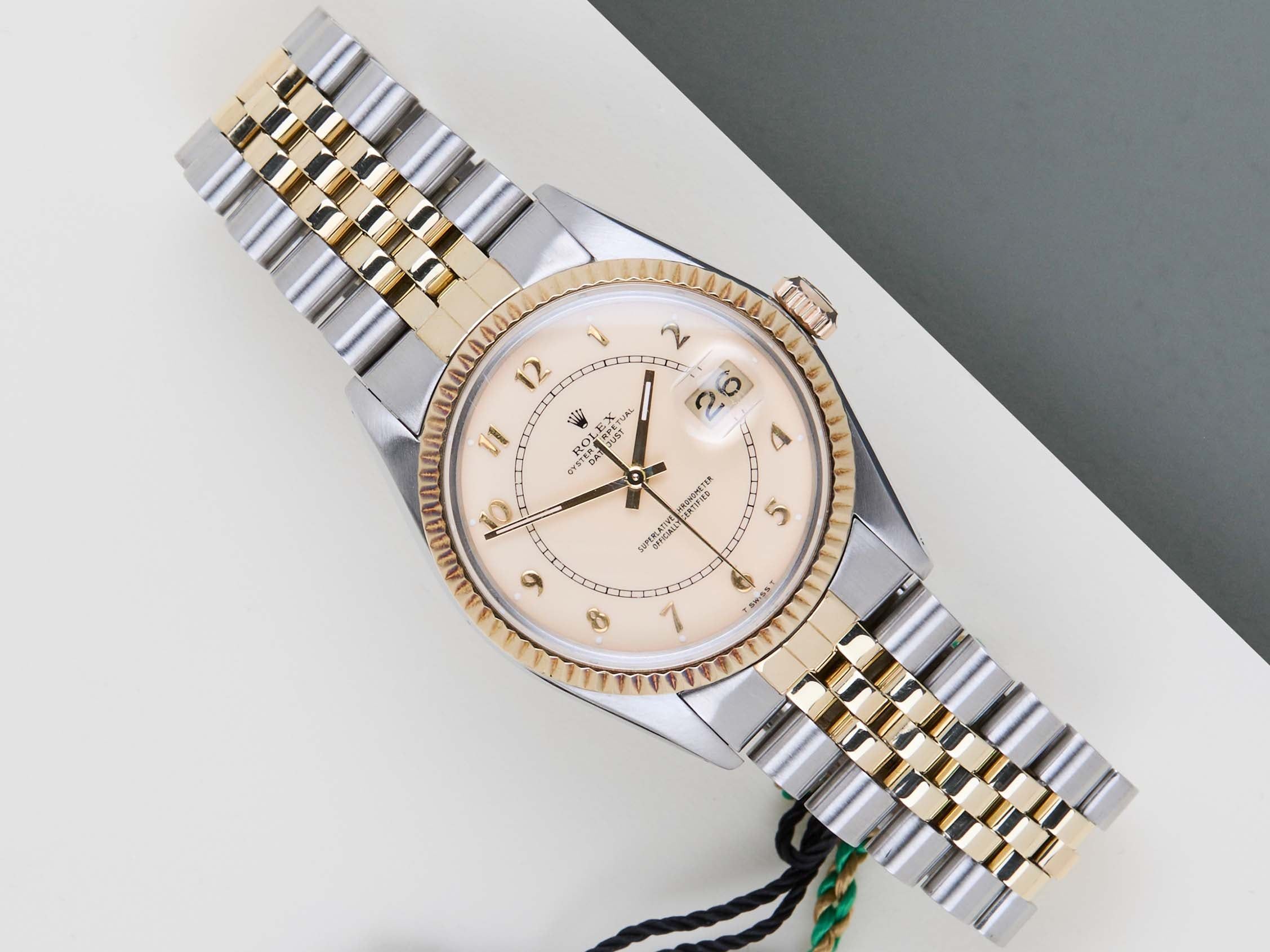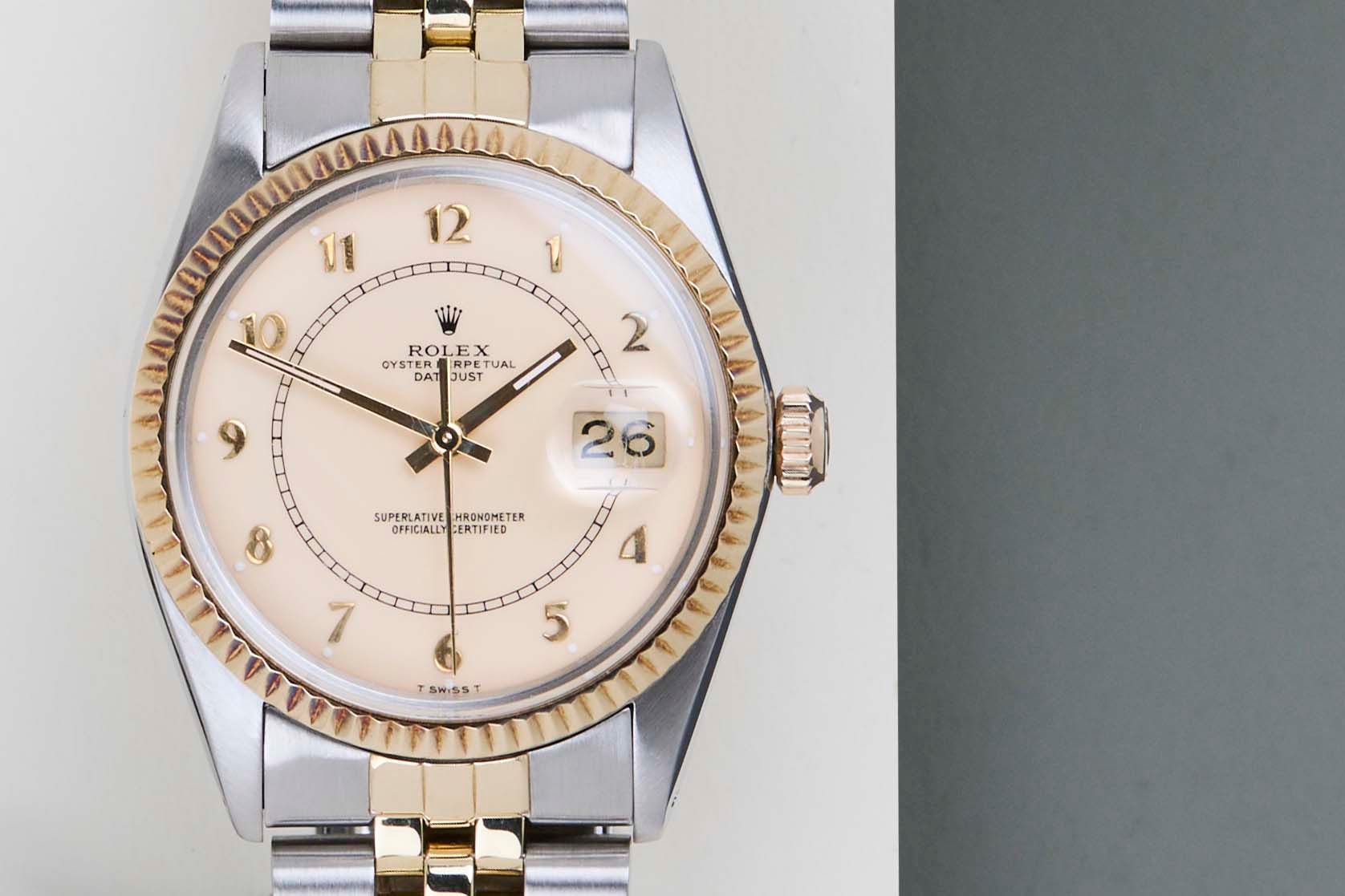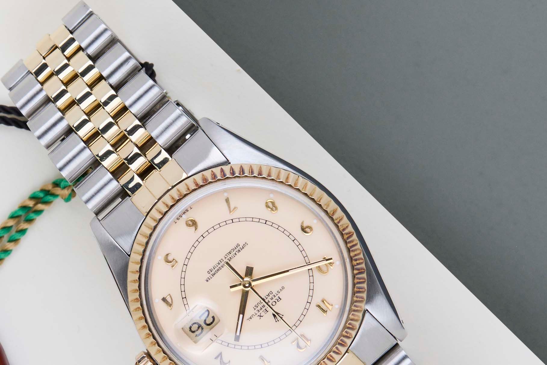 Full Set | Endlinks 455 Rolex introduced the original Datejust in 1945 to celebrate the company's 40th anniversary. Due to the various case sizes and materials, the Datejust has been ingrained in Rolex's history and remains incredibly popular for 75 years.This Rolex Datejust 'Creme Boiler Gauge Dial' was sold for the first time in 1981.It is made from a combination of 18ct. Yellow Gold and stainless steel and is fitted with a Jubilee bracelet. This Rolex Datejust 36 is in Mint condition and comes with the original Rolex Warranty Papers and Box. Furthermore, the watch has been serviced by our watchmaker, and therefore it comes with one year Steiner Warranty.