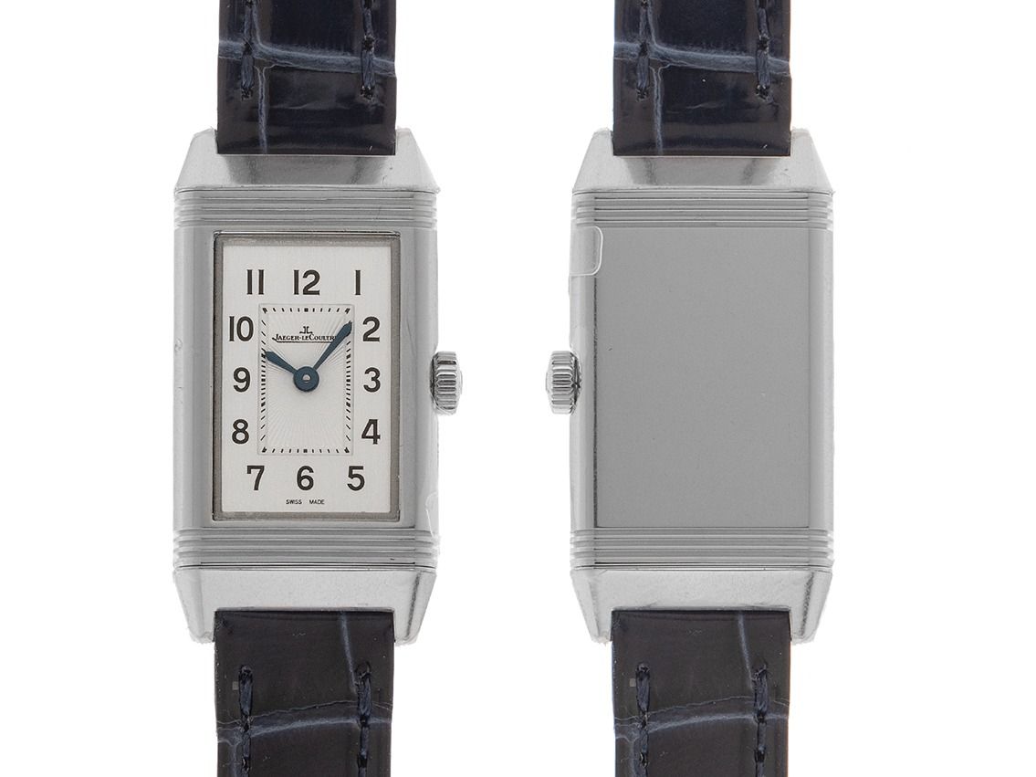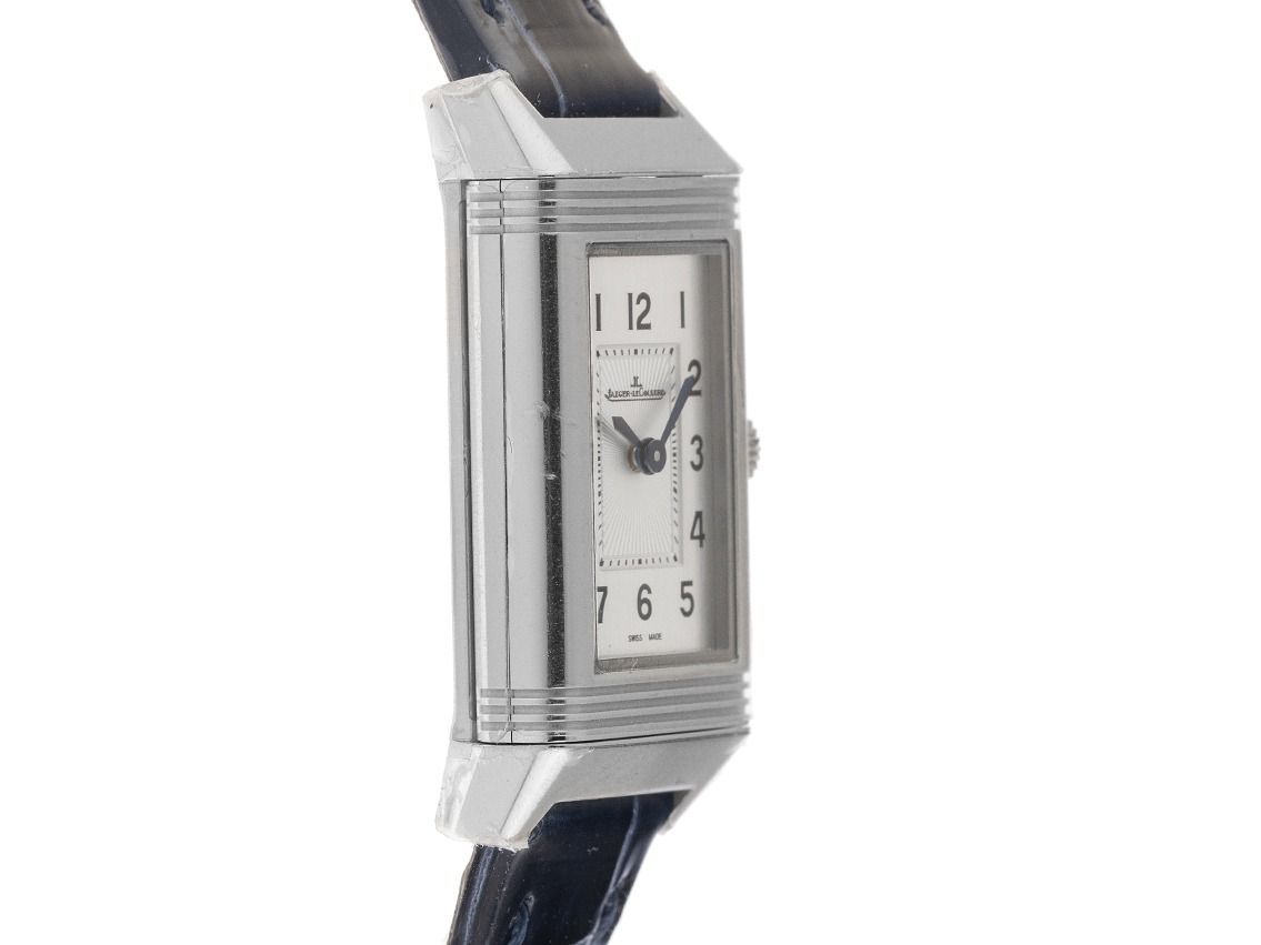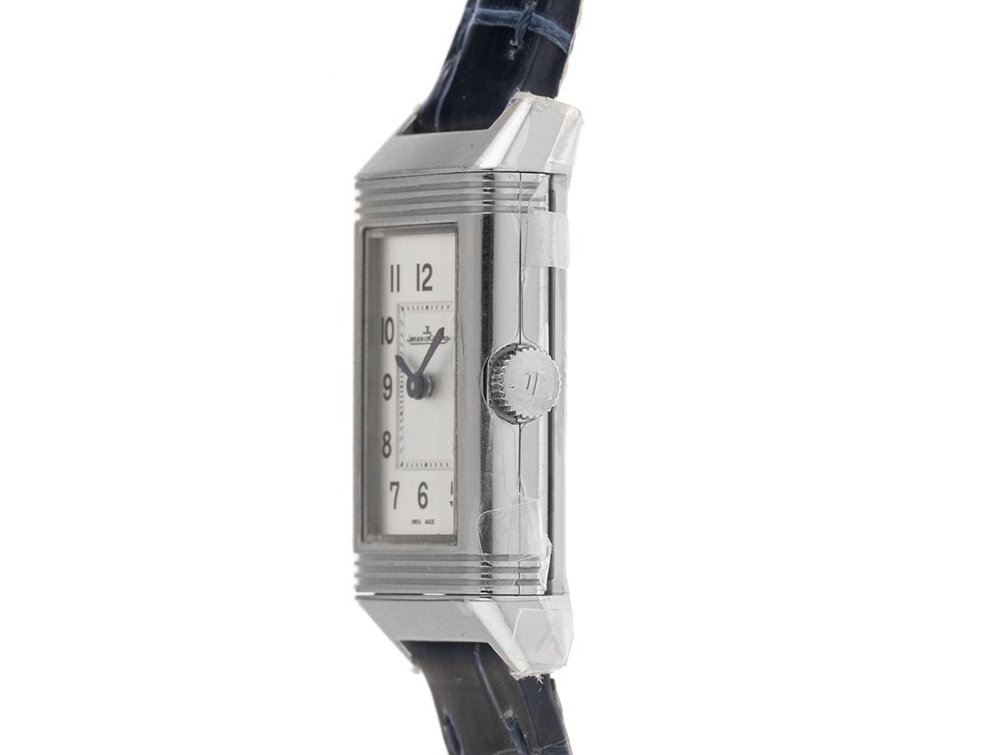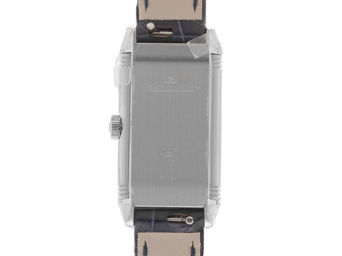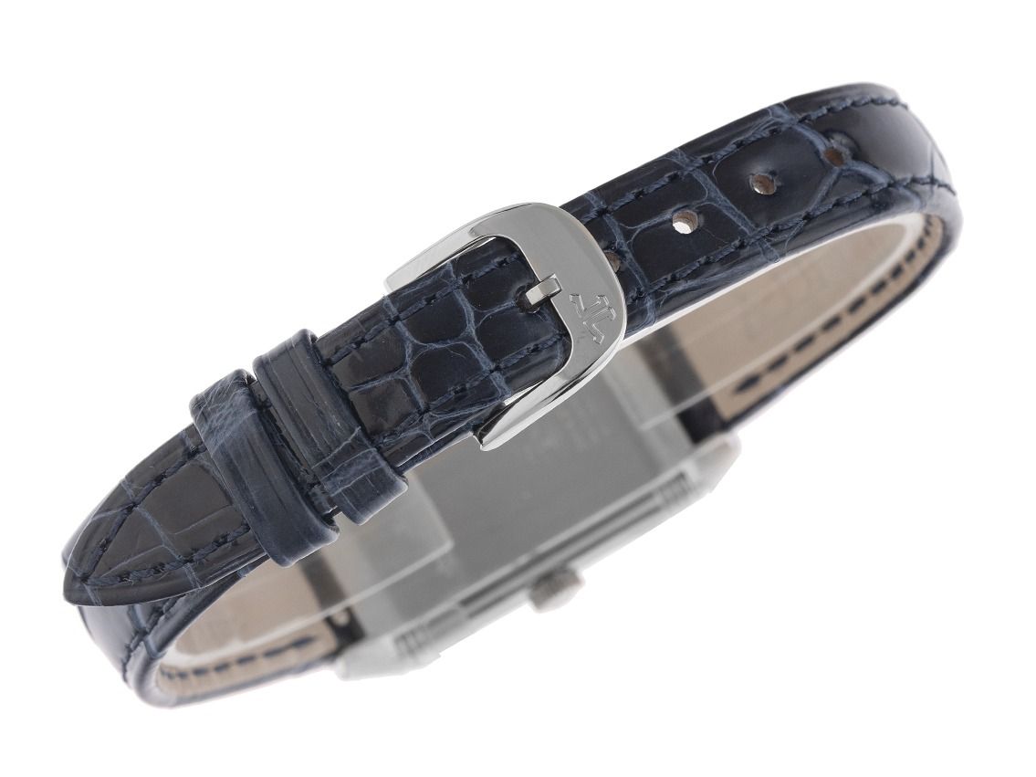 Gehäuse Edelstahl poliert rechteckig, Gehäusemaße ohne Krone (L x B x H) 32,5 x 16,3 x 6,95mm, mit 180° Wendegehäuse. Jaeger-LeCoultre Armband Leder blau mit Ziernaht, Anstoßbreite 11mm, Jaeger-leCoultre Stiftschließe Edelstahl mit Hersteller-Logo. Zifferblatt silberfarben, vertikal gebürstet mit schwarzen arabischen Ziffern und gebläuten Zeigern. Uhrwerk quarzgesteuert, Jaeger-leCoultre Manufakturkaliber 567 mit 4 Edelsteinen. Anzeige von Stunde und Minute über Zeiger aus der Mitte. Saphirglas kratzfest. Krone mit Hersteller-Logo. Boden Edelstahl. Gewicht der Uhr inklusive Armband 21g. Wasserdicht bis 3 ATM. Referenznummer: Q3878520, ID: ST116084960326H-5850, Artikelnummer: 10000084963. Original Jaeger-leCoultre Box mit Umkarton und Garantie Papiere von Februar 2026, Full Set. Ungetragen. Lieferzeit sofort.