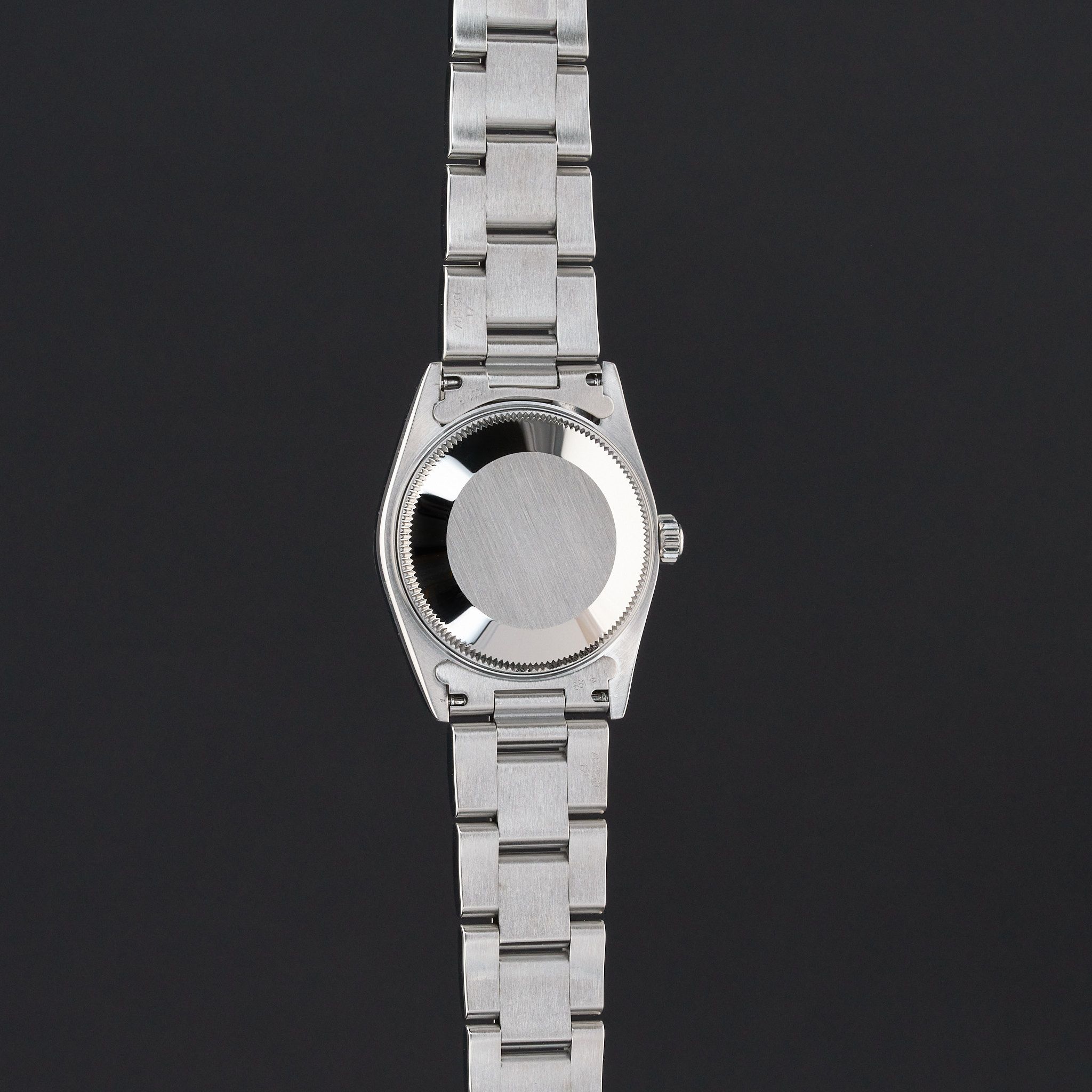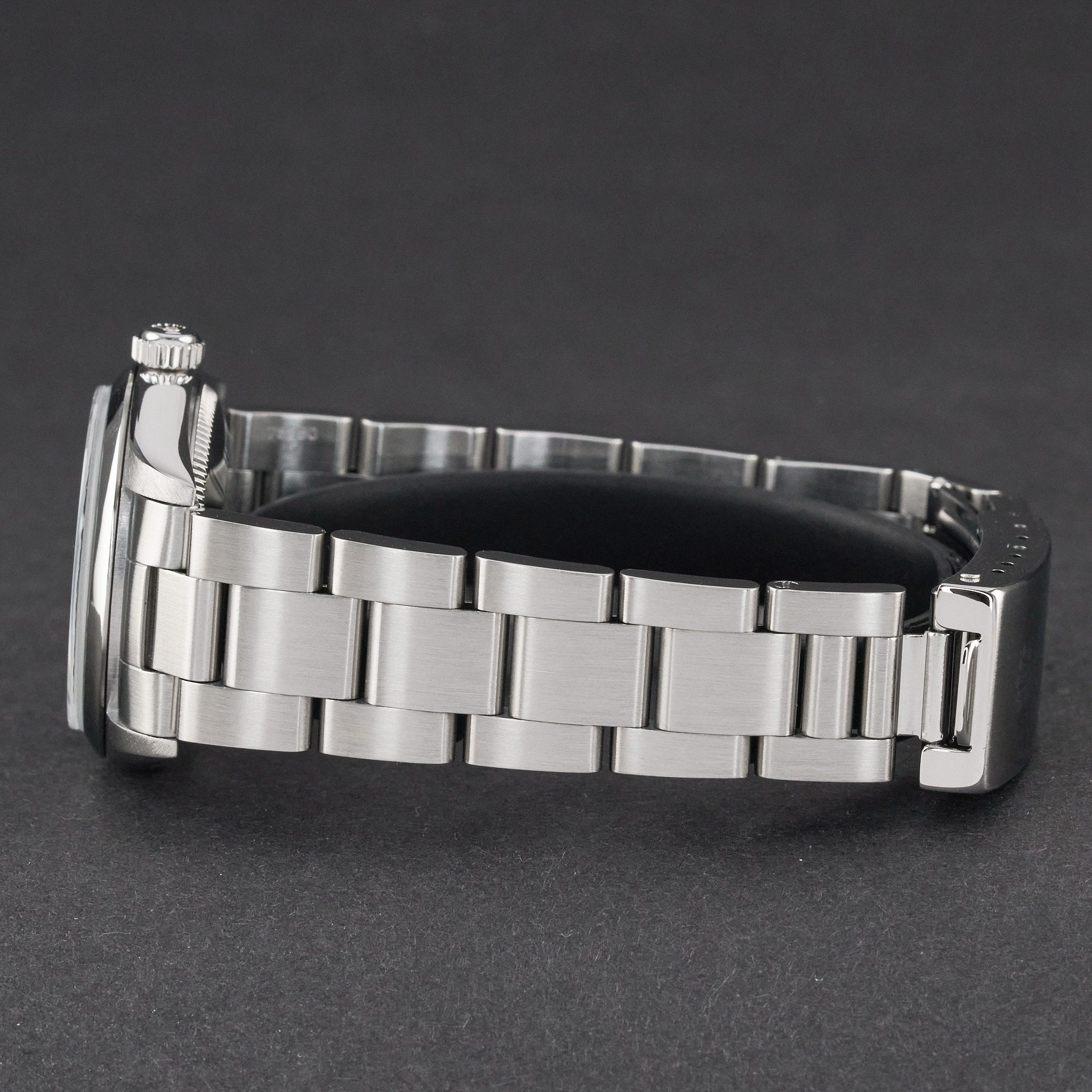 This Rolex Oyster Perpetual 67480 features a Black Arabic dial and is crafted from stainless steel, with a production year of 1998.