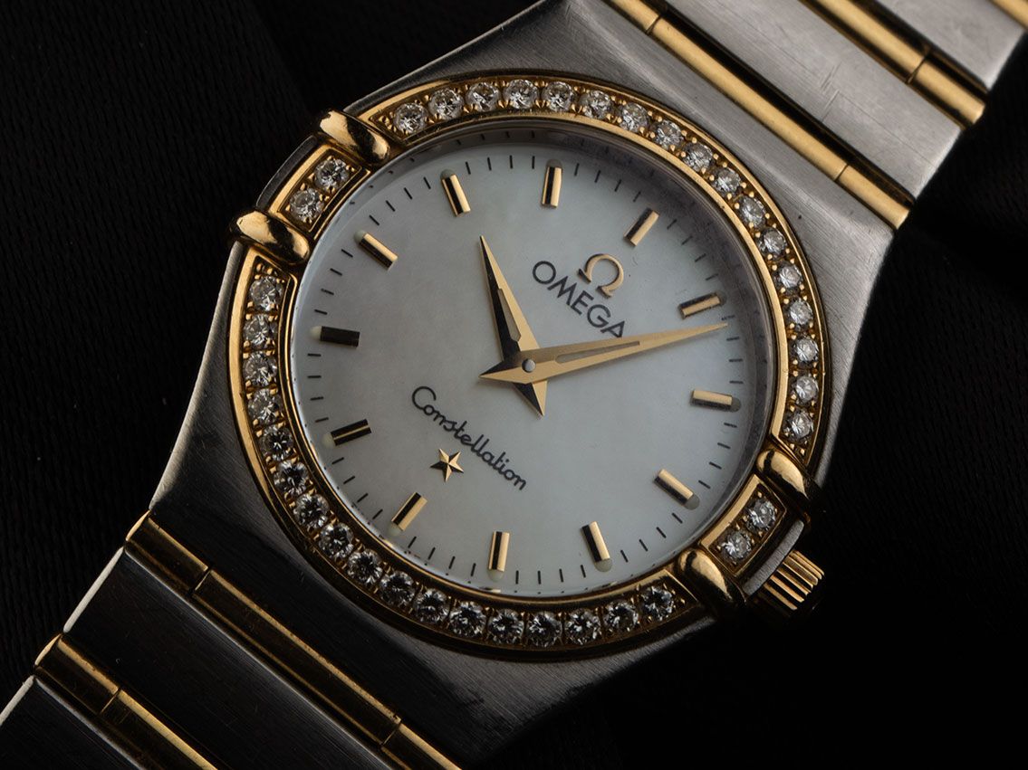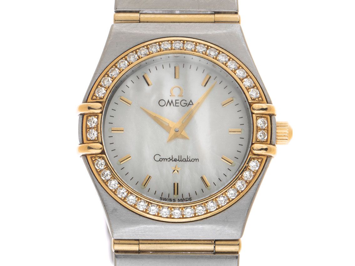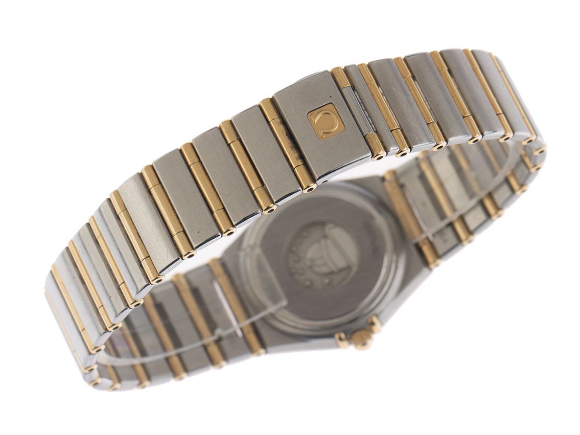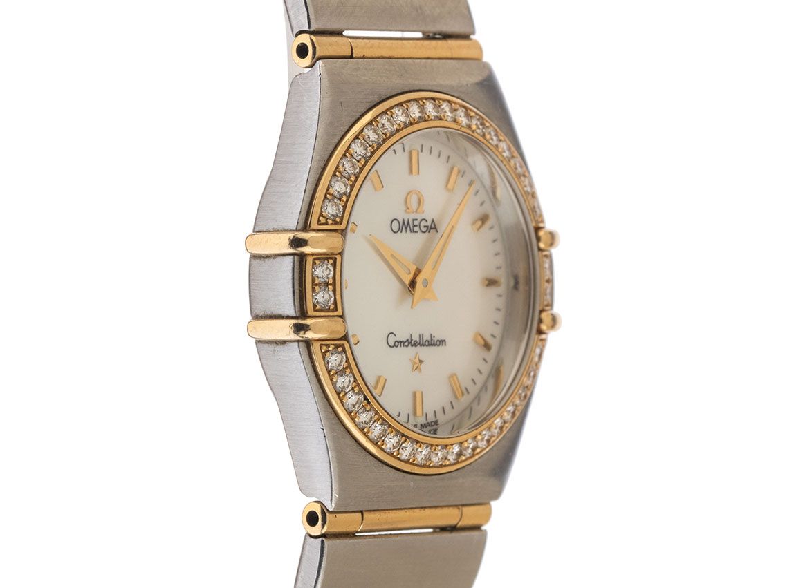 Omega Constellation Stahl 18kt Gelbgold Diamanten Perlmutt Quarz Armband Stahl 18kt Gelbgold Gehäuse Edelstahl satiniert, Gehäusedurchmesser ohne Krone 25mm, Gehäusehöhe 7,2mm. Lünette 18kt Gelbgold poliert mit Diamanten besetzt. Armband Edelstahl / 18kt Gelbgold poliert und satiniert, verdeckte Sicherheitsfaltschließe Edelstahl mit Hersteller-Logo. Zifferblatt Perlmutt hell mit aufgesetzten gelbgoldenen Indexen und gelbgoldenen Zeigern. Uhrwerk quarzgesteuert, Omega Kaliber. Anzeige von Stunde und Minute über Zeiger aus der Mitte. Saphirglas kratzfest. Krone geriffelt mit Hersteller-Logo. Boden Edelstahl graviert. Gewicht der Uhr inklusive Armband 60g, Länge des Armbandes inklusive Gehäuse 170mm. Referenznummer: 12777000, Gehäusenummer: 56742XXX, ID: P262918000326HW-4800, Artikelnummer: 10000085016. Original Omega Box mit Umkarton und Garantie Papiere von September 2001 sowie Beschreibung und Watchregister Auszug von März 2026, The Watch Register Zertifikat / ohne Eintrag (Internationale Datenbank für verlorene oder gestohlene Uhren), Full Set. Original unpoliert, kann auf Wunsch kostenlos aufgearbeitet werden. Lieferzeit sofort.