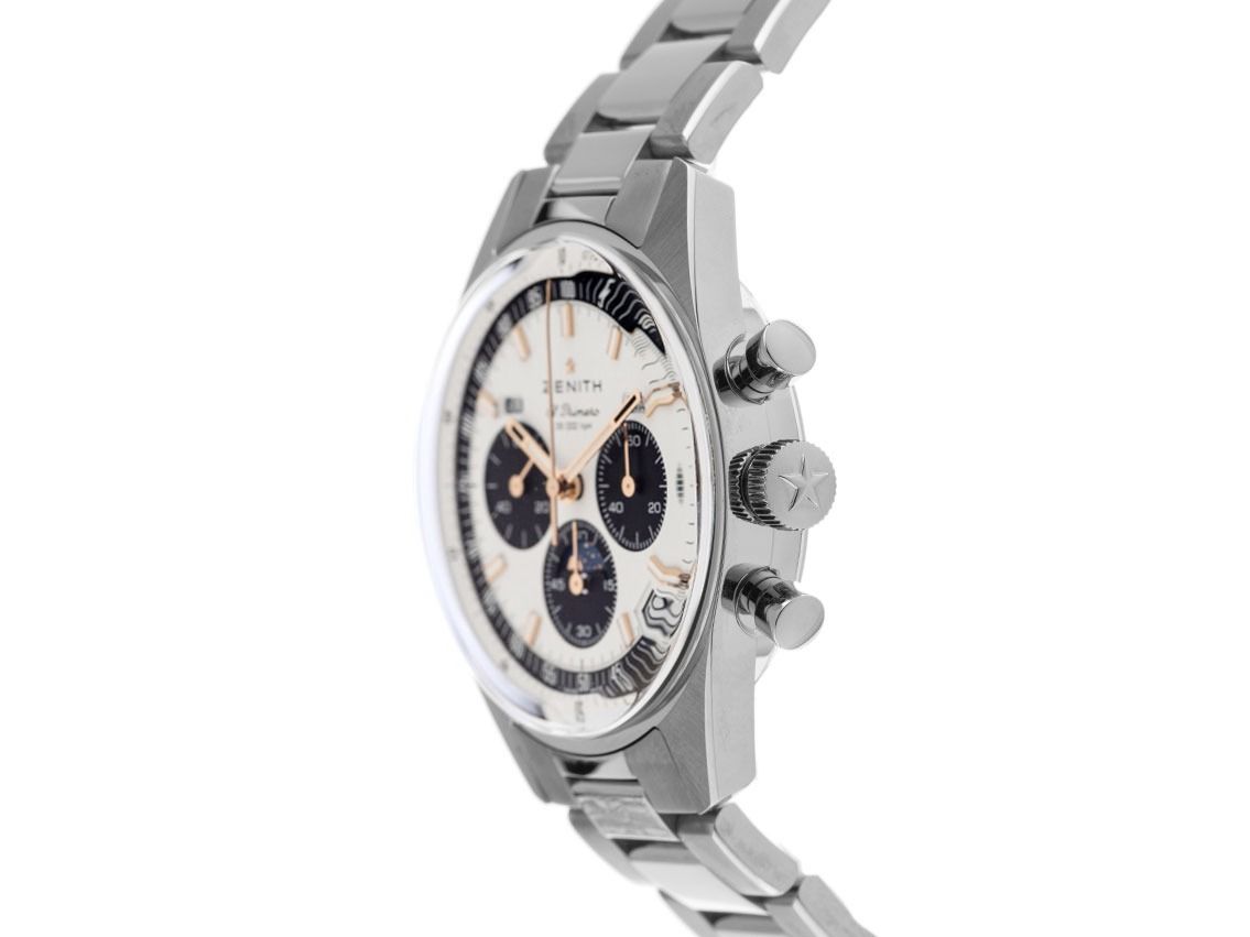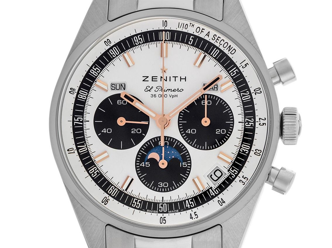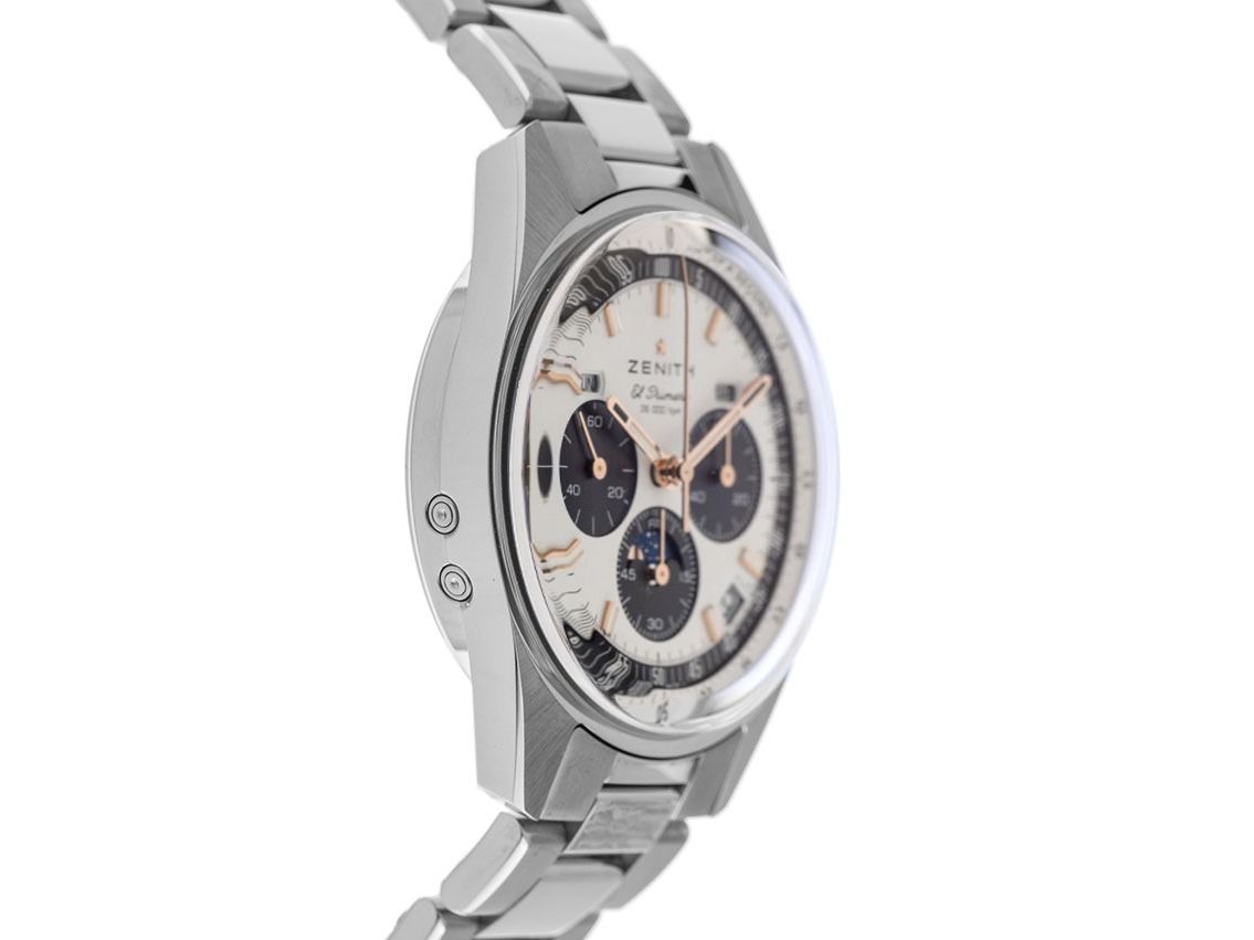 Gehäuse Edelstahl poliert und satiniert, Gehäusedurchmesser ohne Krone 38mm, Gehäusehöhe 14,3mm. Lünette Edelstahl glatt und poliert mit Unterglas 1/10 Sekunden-Skala. Armband Edelstahl poliert und satiniert, Sicherheitsfaltschließe Edelstahl mit Hersteller-Logo. Zifferblatt weiß mit aufgesetzten polierten roségoldenen Indexen und polierten roségoldenen Leuchtzeigern. Uhrwerk Automatik, Chronograph, Chronometer mit Zeugnis, Zenith Manufakturkaliber El Primero mit 35 Edelsteinen, Gangreserve ca. 60 Stunden. Anzeige von Stunde und Minute über Zeiger aus der Mitte, kleine Sekunde mit Sekundenstopp zur sekundengenauen Einstellung der Uhrzeit bei 9 Uhr, Datumsanzeige mit Schnellverstellung zwischen 4 und 5 Uhr, Wochentagsanzeige auf englisch zwischen 10 und 11 Uhr, Monatsanzeige in englisch zwischen 1 und 2 Uhr, Mondphaseanzeige bei 6 Uhr. Saphirglas kratzfest und gewölbt und beidseitig entspiegelt. Krone geriffelt mit Hersteller-Logo. Boden Edelstahl verschraubt und graviert mit Saphirglas Sichtfenster. Gewicht der Uhr inklusive Armband 135g, Länge des Armbandes inklusive Gehäuse 200mm. Wasserdicht bis 5 ATM. Referenznummer: 03.3400.3610/38.M3200, ID: ST1160197260326H-15100, Artikelnummer: 10000085026. Original Zenith Box mit Umkarton und Garantie Papiere von 2026, Full Set. Ungetragen. Lieferzeit sofort.