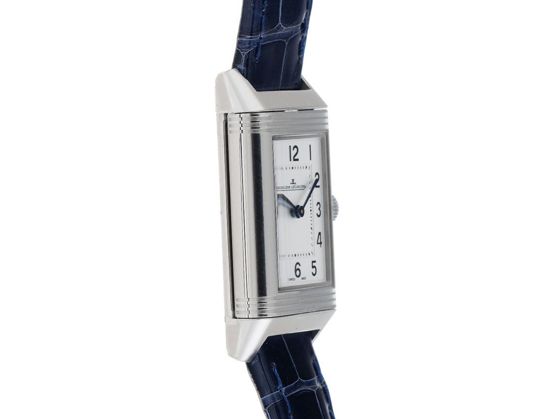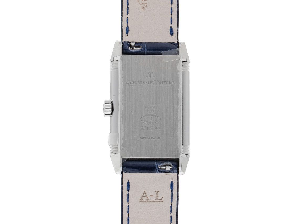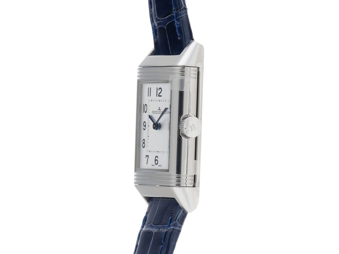 Gehäuse Edelstahl poliert, rechteckig, Gehäusemaße ohne Krone (L x B x H) 35,78 x 21 x 7,4mm mit 180° drehbarem Wendegehäuse. Jaeger-leCoultre Armband Krokoleder dunkelblau mit Ziernaht, Anstoßbreite 15mm, Jaeger-leCoultre Stiftschließe Edelstahl mit Hersteller-Logo. Zifferblatt silbergrau mit schwarzen arabischen Ziffern und gebläuten Zeigern. Uhrwerk quarzgesteuert, Kaliber Jaeger-leCoultre 657 mit 4 Edelsteinen. Anzeige von Stunde und Minute über Zeiger aus der Mitte. Saphirglas kratzfest. Krone mit Hersteller-Logo. Boden Edelstahl graviert. Gewicht der Uhr inklusive Armband 31g. Wasserdicht bis 3 ATM. Referenznummer: Q2618540, ID: ST1160109040326H-7500, Artikelnummer: 10000085033. Original Jaeger-leCoultre Box und Garantie Papiere von Februar 2026, Full Set. Ungetragen. Lieferzeit sofort.