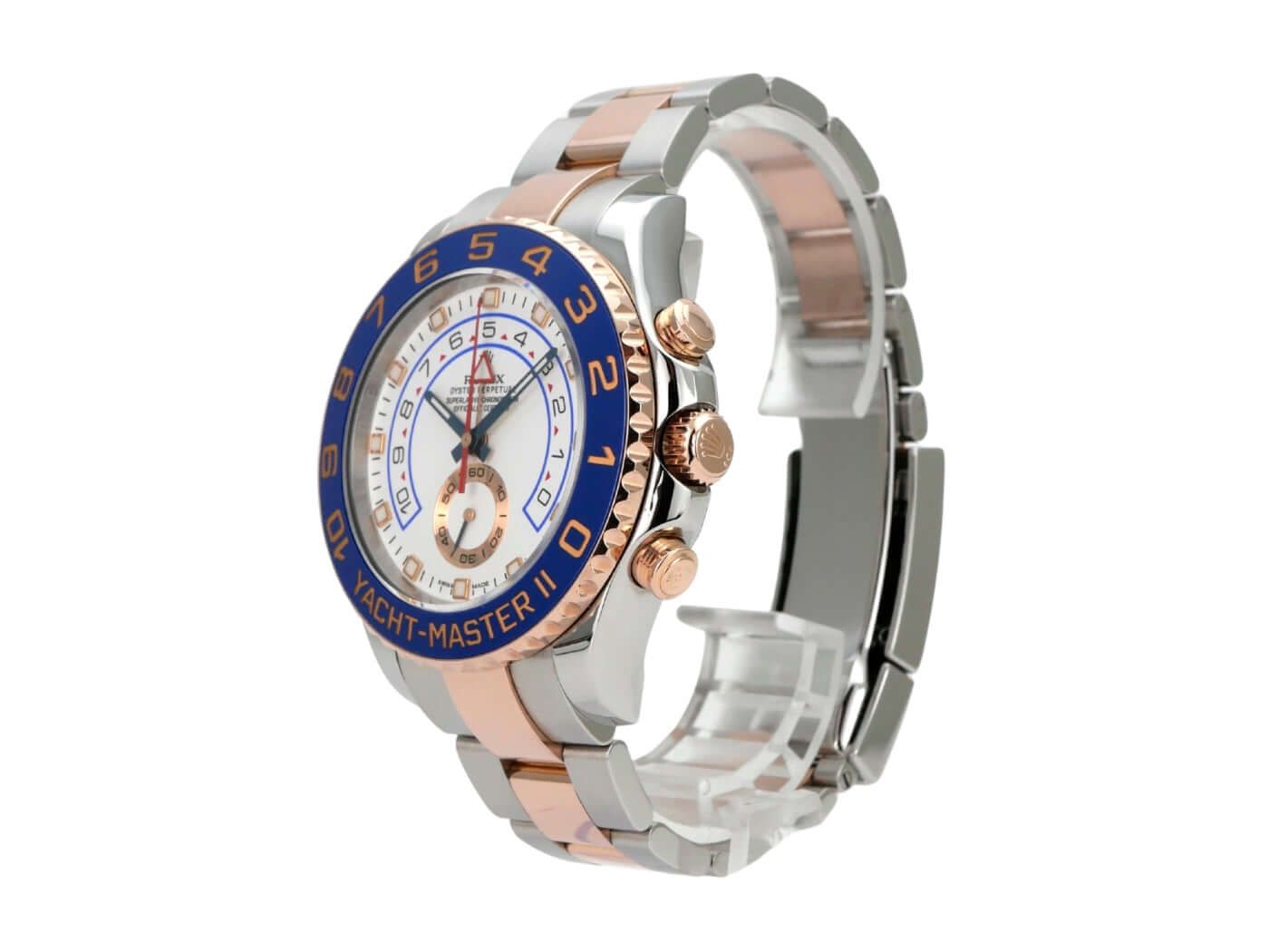 Rolex Yacht-Master II Ref. 116681 Stainless Steel / Everose Gold from 2017Case made of polished and satin-finished stainless steel and 18 kt Everose gold, case diameter 44 mm, bezel made of polished 18 kt Everose gold with blue ceramic number disc, bezel rotatable 90 degrees in both directions, Oyster bracelet made of polished and satin-finished stainless steel and 18 kt Everose gold with folding clasp, white dial with Everose gold indices, triangular hour marker at the 12 o’clock position, luminous hands, automatic movement, Rolex manufacture caliber 4161 with 42 jewels, frequency 28,800 A/h, chronometer, small seconds at 6 o’clock, scratch-resistant sapphire crystal, screwed stainless steel case back, water-resistant up to 10 bar.Pre-owned watch, very good condition, complete with box and papers, delivered in Italy in 2017, serviced by Rolex in 2024.