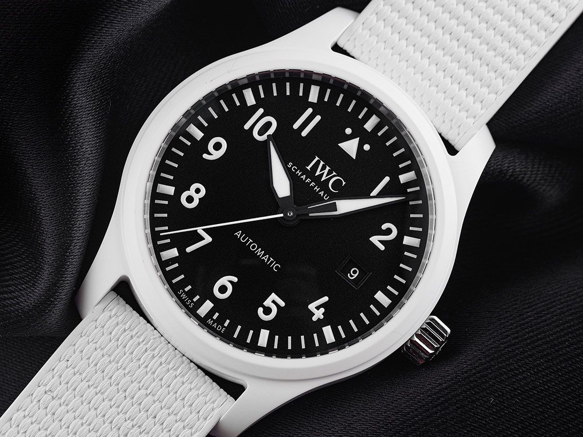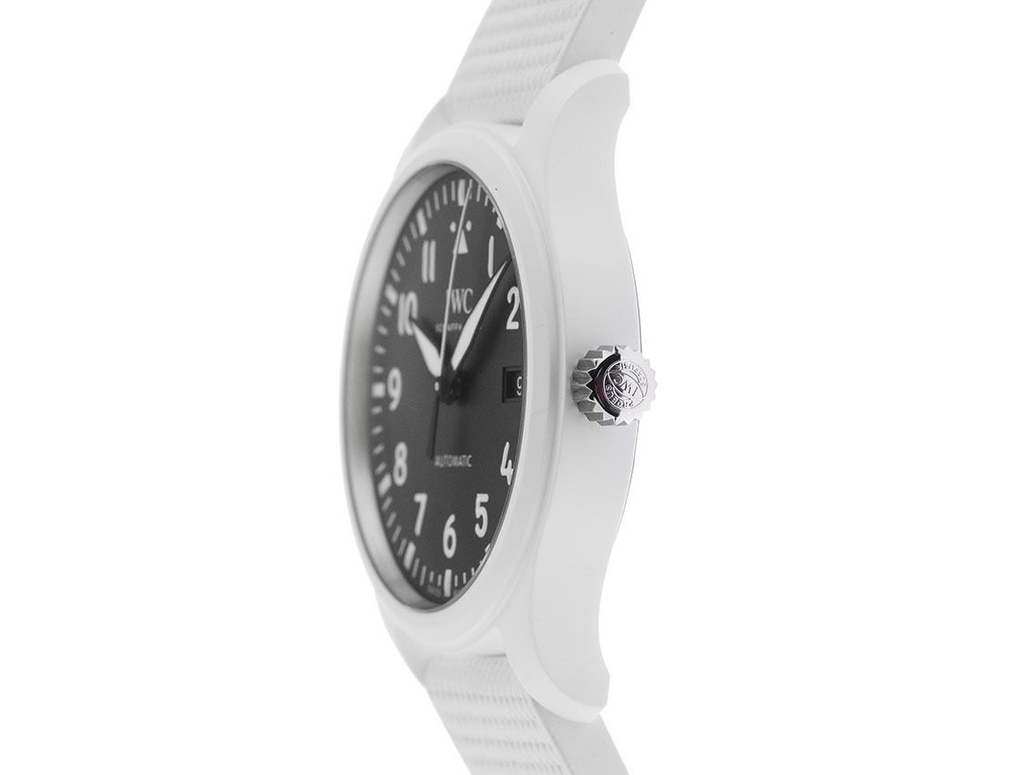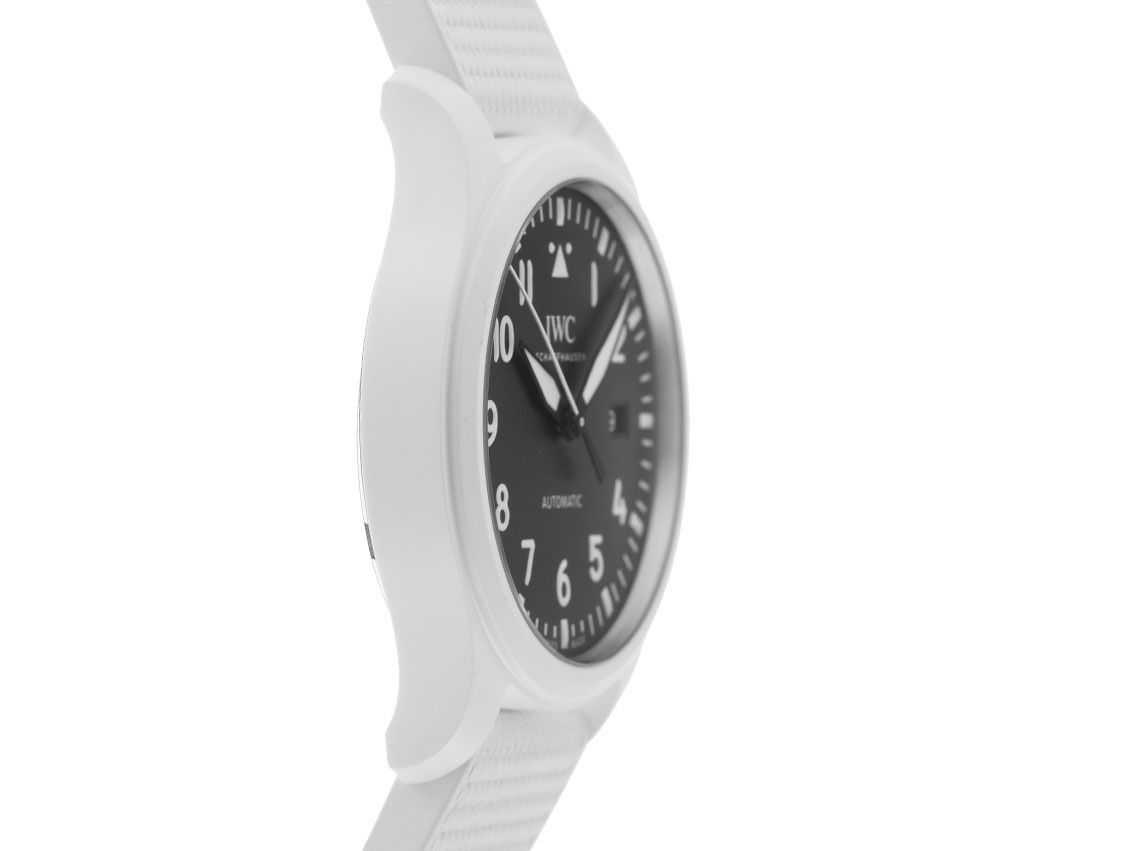 Gehäuse Keramik weiß satiniert, Gehäusedurchmesser ohne Krone 41mm, Gehäusehöhe 11,4mm. Lünette Keramik weiß glatt und satiniert. Armband Kautschuk weiß, Anstoßbreite 20mm, Stiftschließe Edelstahl mit Hersteller-Logo. Zifferblatt schwarz mit weißen arabischen Leuchtziffern, Leuchtindexen und schwarzen Leuchtzeigern. Uhrwerk Automatik, Chronograph, Kaliber IWC 32112 mit 21 Edelsteinen, Gangreserve ca. 120 Stunden. Anzeige von Stunde, Minute und Sekunde über Zeiger aus der Mitte mit Sekundenstopp zur sekundengenauen Einstellung der Uhrzeit bei 6 Uhr, Datumsanzeige mit Schnellverstellung bei 3 Uhr. Saphirglas kratzfest und gewölbt. Krone verschraubbar mit Hersteller-Logo. Boden Edelstahl verschraubt und mit Top Gun Logo graviert. Gewicht der Uhr inklusive Armband 87g. Referenznummer: IW328104, ID: ST1160130280326H-9000, Artikelnummer: 10000085049. Original IWC Schaffhausen Box mit Umkarton und Garantie Papiere von Februar 2026 sowie Beschreibung, Full Set. Ungetragen. Lieferzeit sofort.