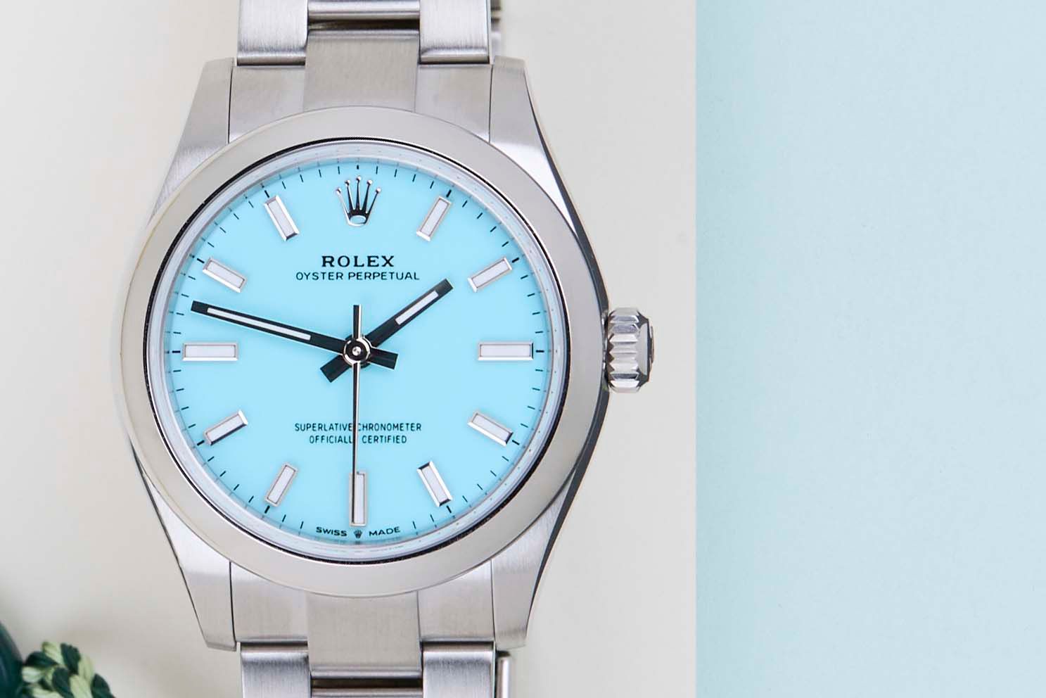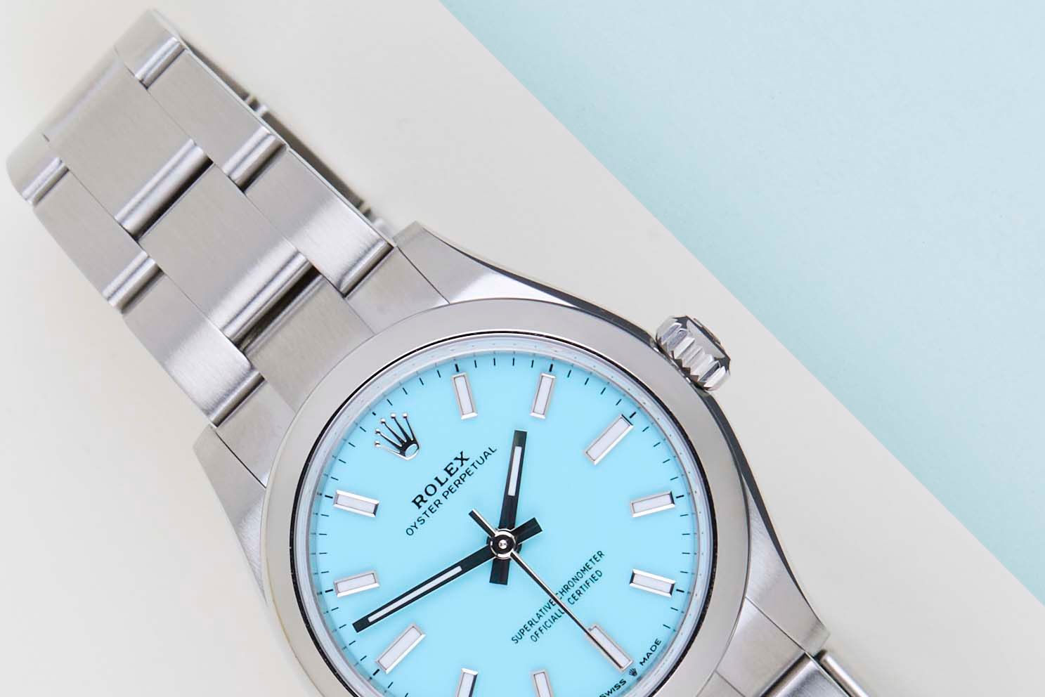 New & Unworn | Full Set | International Rolex Warranty Until March 2031.The Rolex Oyster Perpetual was first introduced by Rolex in the 1930s. It is characterized by its water-resistant Oyster case and self-winding Perpetual movement. The Rolex Oyster Perpetual a simple, yet elegant timepiece that is suitable for both casual and formal wear.This Rolex Oyster Perpetual 31 'Tiffany Blue Dial' was sold for the first time in March 2026.The watch is fully made out of stainless steel. Rolex uses 904L in its steel watches, which is an extremely resistant and highly polishable superalloy.This Rolex Oyster Perpetual 31 is in New & Unworn condition and comes with the original Rolex Warranty Card and box. Furthermore, the watch still has International Rolex Warranty until March 2031.