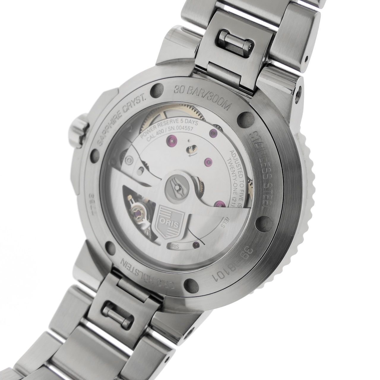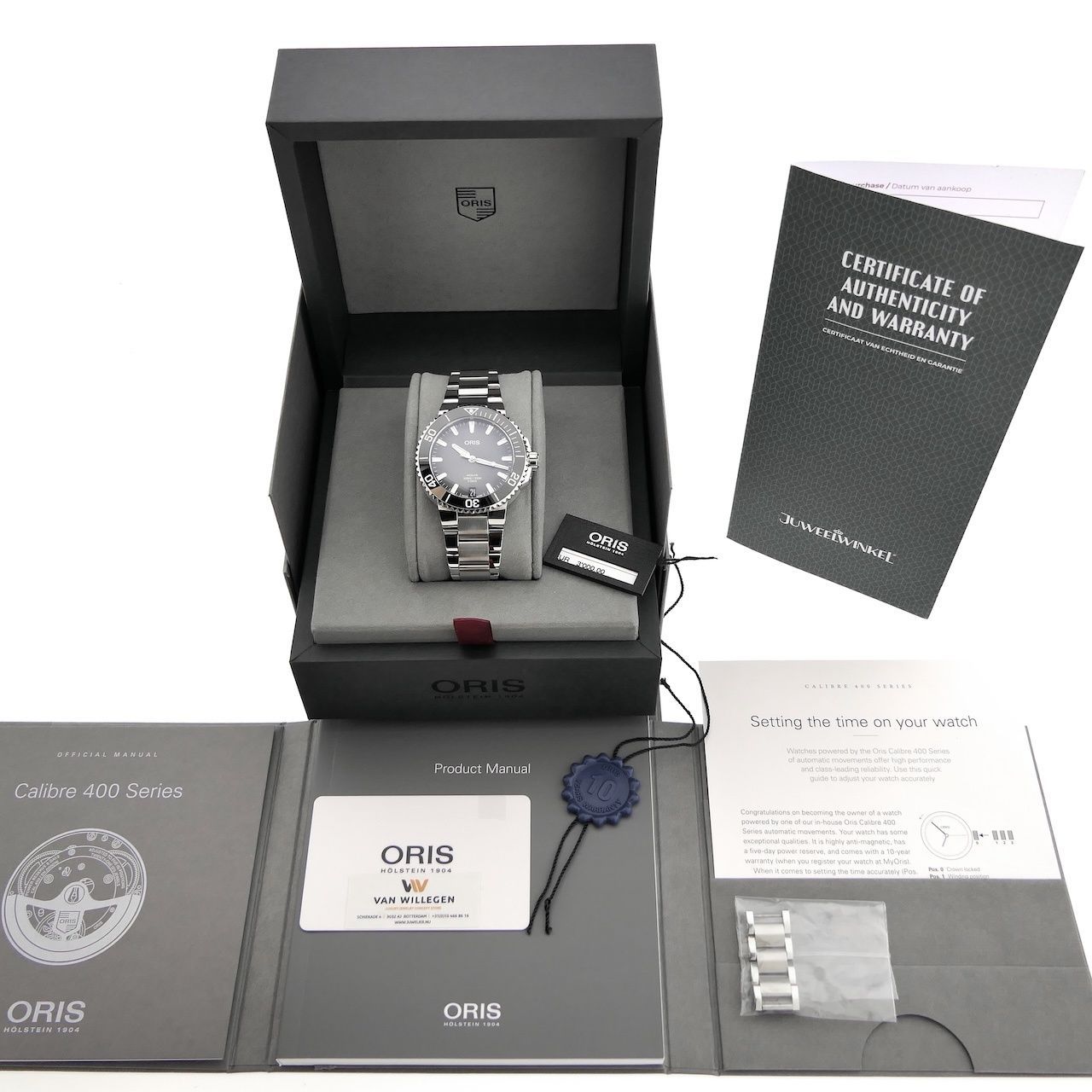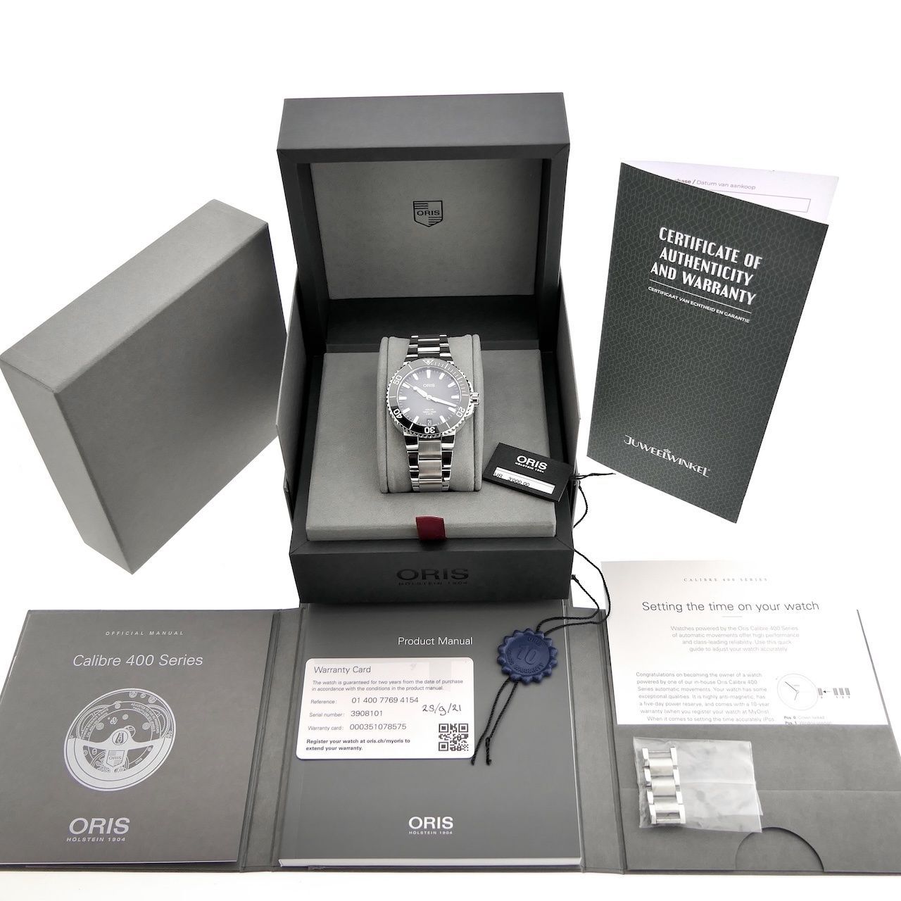 Oris Aquis Calibre 400: with this, Oris is seriously making inroads into the mid-range segment! A beautifully finished and high-quality men's diving watch, 41.5mm in diameter, a perfect size, and internally a magnificent Manufacture movement with an impressive 120 hours (5 days) of power reserve. No one can match that in this price range. The vignetted dial makes this beautiful watch a true feast for the wrist. This watch is in very good condition and comes as a full set from 2020 with a current retail price of €3500. This watch is equipped with an Oris Swiss Made automatic calibre 400 movement. The movement has a date, 120 hours of power reserve, and runs perfectly and accurately within the factory/chronometer specifications with a measured amplitude of 315 degrees and +2 sec./24h deviation. Just as it should be. This watch is fitted with a beautiful steel Oris strap, also in very good condition. The strap features a double folding clasp with an integrated diver's extension (+2cm). The strap fits wrists up to approximately 20cm and can be extended by an additional 2cm. We can, of course, custom-make/deliver the strap. This watch comes as it was when it was new in 2020: Oris boxes, manual, warranty card, Oris papers, extra links, hangtags, and the remaining Oris warranty of over 5 years!