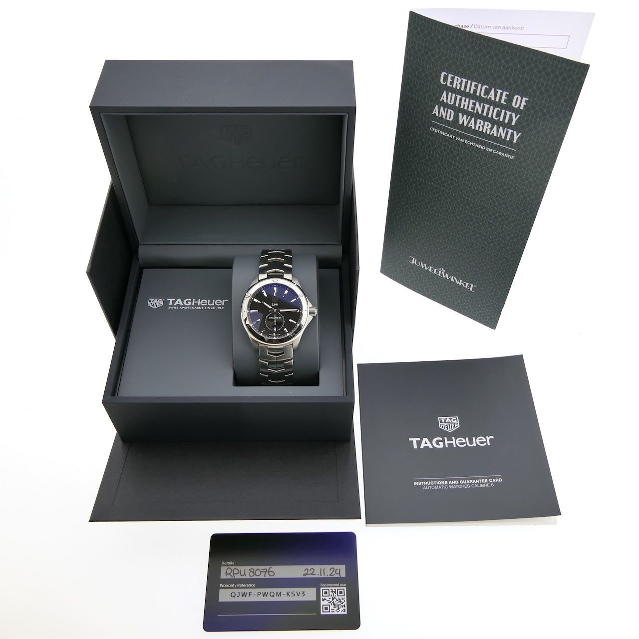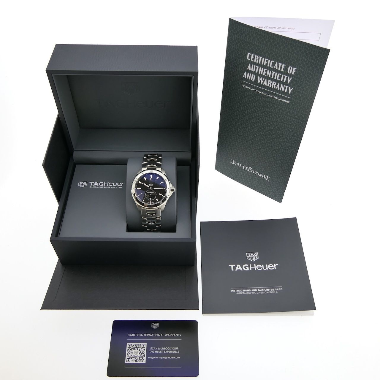 A beautiful, brand-new TAG Heuer Link Automatic with reference number WAT2110 what a pleasant, comfortable, and high-quality watch! This is a model from the latest TAG Heuer Link line. The black tapestry dial is stunning and truly completes this watch. With a 40mm diameter, it's perfect and very comfortable for almost any man. The retail price is €3550, so this offer is a great start. This watch is new, unworn, and comes as a beautiful full set from 11-2024. Inside, we see the renowned TAG Heuer Calibre 6 automatic movement. The TAG Heuer Calibre 6 offers a combination of reliability, style, and functionality, making it a popular choice for both watch enthusiasts and those seeking a versatile and durable timepiece. This movement features a date and a small seconds hand. This calibre forms the core of TAG Heuer Aquaracer watches, and thanks to its precision and reliability, it has an excellent reputation. We measured the movement and found an amplitude of 290 degrees and a deviation of max. +4 sec./24h, which is excellent. The TAG Heuer Link steel bracelet is also new (naturally) and fits links up to approximately 20cm wrists. The bracelet features a convenient folding clasp. The Link bracelet, like this one, is praised for its excellent wearing comfort and unique design. We can, of course, make/supply the bracelet to size. This watch comes as a full set, as it was when it was released in stores on November 2024, including: TAG Heuer box, outer box, TAG Heuer warranty card, booklet with our in-house warranty report, and a 1-year warranty (the TAG Heuer factory warranty is 2-5 years, depending on activation).