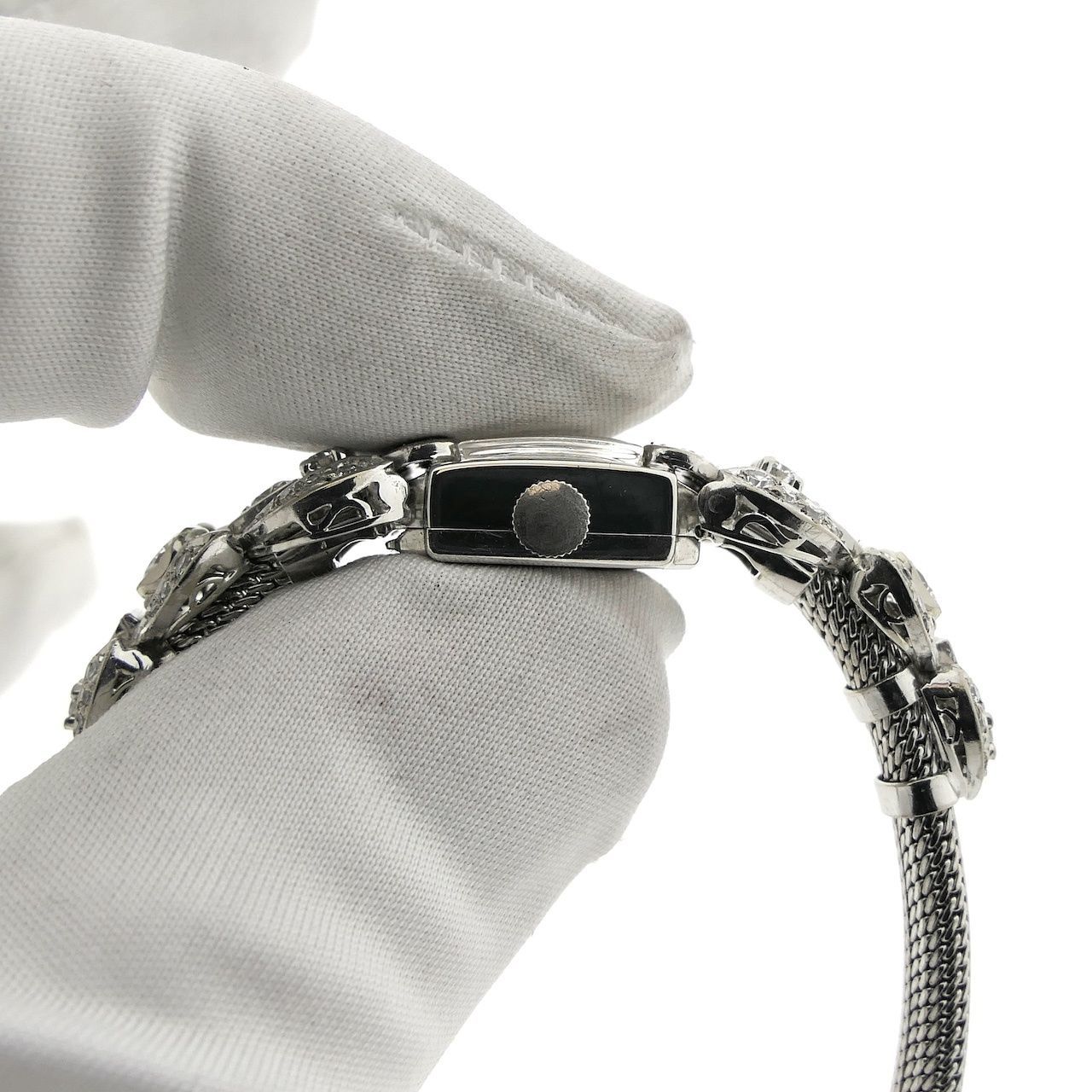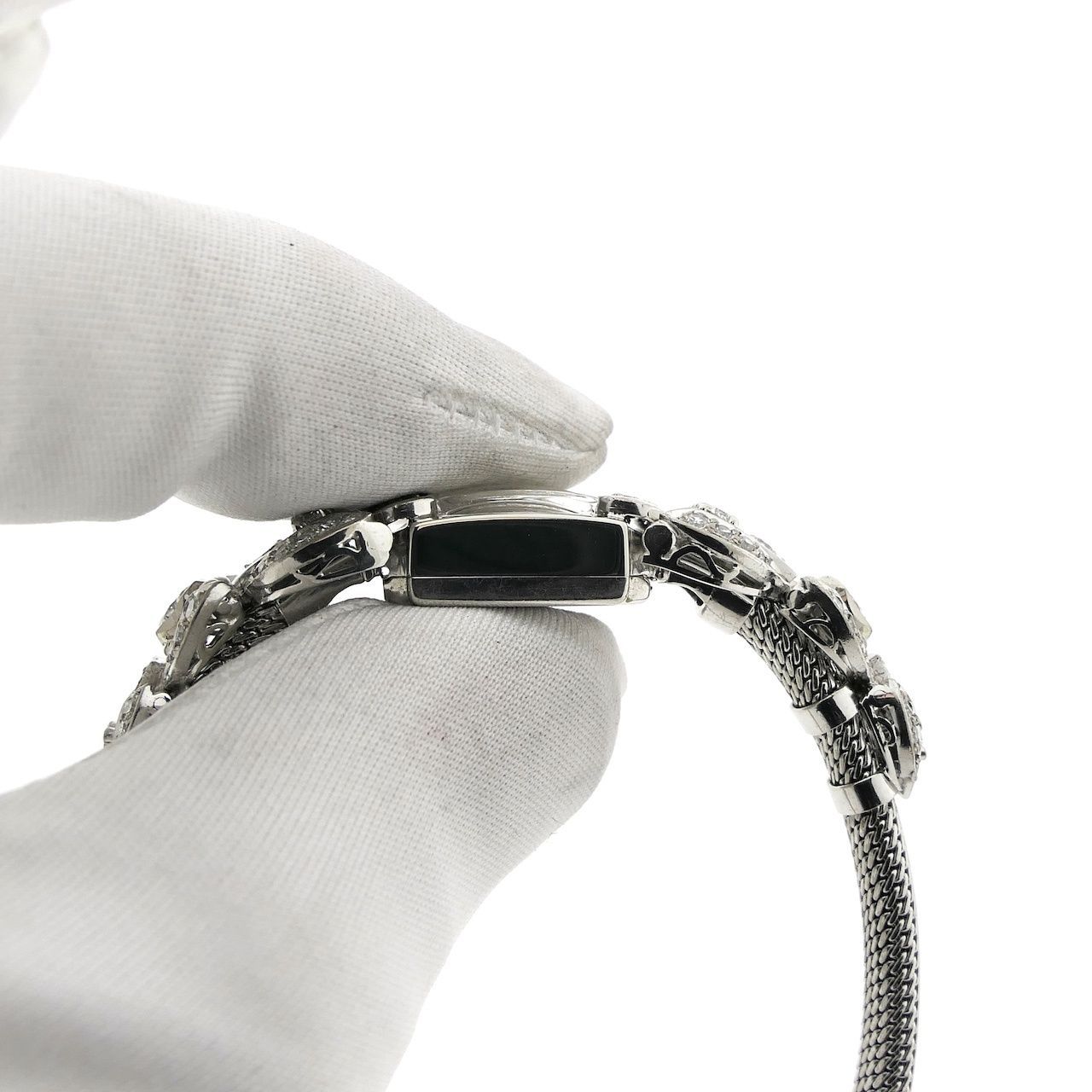 What a gem! This unique Herva Geneva cocktail watch in 14k white gold features a highly refined woven 14k white gold Milanese bracelet. The high quality and craftsmanship are immediately apparent; this unique watch is exquisitely crafted and can be worn as a watch or simply as a bracelet, with no time to speak of. This exclusive piece of jewelry is primarily worn for special occasions and galas, and is also known as a "cocktail watch." It's truly striking, and one of a kind! Weighing over 29.75 grams, it's a substantial bracelet and striking piece of jewelry set with 33 diamonds, totaling 1.90 carats. This type of watch, also known as a "cocktail watch," was primarily worn for elegant occasions and galas. The excellent condition is striking. The refined 14k... The white gold Milanese (or woven) strap is in beautiful condition, very comfortable to wear, and shows minimal signs of wear. It features a beautiful clasp and fits wrists of approximately 16 to 17 cm. We can custom-make/deliver this piece of jewelry. This watch features a high-quality Swiss manual movement and runs perfectly. It comes in a luxury box with a warranty certificate and a 1-year warranty.