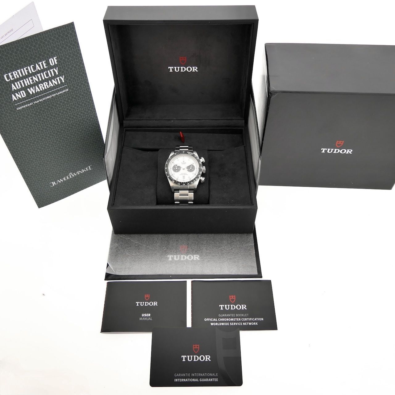 Beautiful Tudor Black Bay Chronograph 79360N-0002 in mint condition. With a METAS-certified automatic movement and a 70-hour power reserve, this is top value for money, and of course, Tudor is Rolex's daughter brand. Nice and unobtrusive, yet strikingly beautiful. This isn't the "Poor Man's Daytona," but definitely the Daytona for smart people. With its 41mm case, it's a great men's watch, presentable but not too large. This watch comes as a beautiful full set in mint condition from 2021. The current retail price is €5670, so you're buying with a nice head. Tudor is, of course, a wonderful brand that lets go of the Rolex tradition a bit more, allowing you to walk around with peace of mind, and with a chronograph like this for a fraction of Rolex prices. It's no coincidence that their slogan is "Born to Dare," and we're convinced! Fortunately, this watch is equipped with all the modern technology and a brand-new Tudor MT5813 manufacture movement that runs perfectly and has a 70-hour power reserve. The movement runs perfectly and is very accurate. We measure an amplitude of 296 degrees and a deviation of max. 1 sec/24 hours. The chronograph section has a high-quality column wheel mechanism and no fewer than 47 jewels to keep everything running smoothly. This watch comes with the original steel Tudor "Rivet" bracelet. All links are included, up to approximately 20cm wrists. The steel bracelet is beautifully finished and brings the watch into perfect balance. This is absolutely the right choice for this watch. Of course, we can custom-make/supply this bracelet. This watch comes as a beautiful full set, including the original box, Tudor booklet, extra link, and Tudor warranty card. In addition, our warranty report with a 1-year warranty. Tudor... Who dares?