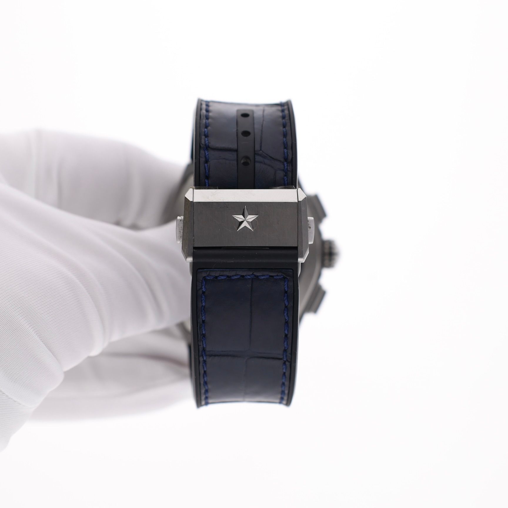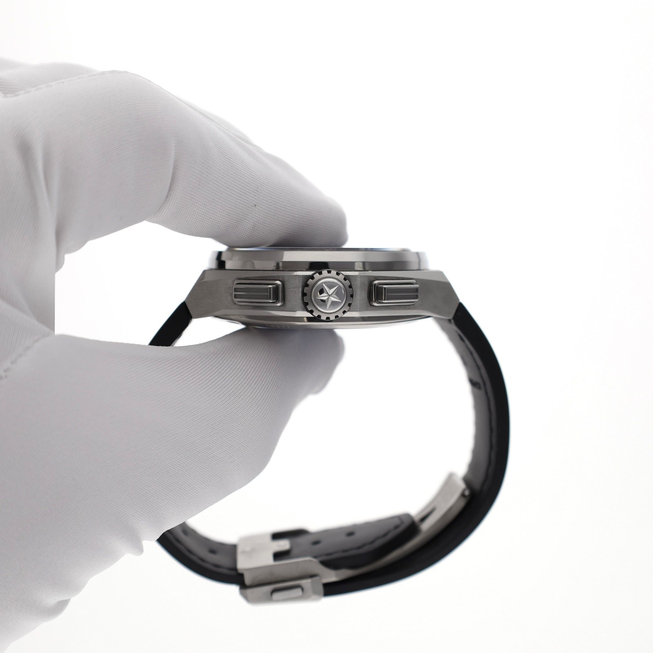 The Zenith Defy El Primero 21 is a striking example of modern haute horlogerie, combining avant-garde design with one of the most advanced chronograph movements ever produced. With its lightweight 44mm titanium case and openwork skeleton dial, this timepiece offers exceptional performance, transparency, and an unmistakably modern look. At the heart of the watch is the El Primero Caliber 9004, a revolutionary high-frequency chronograph that can measure time to 1/100th of a second (the central chronograph hand rotates very quickly at 1x per second), setting a new benchmark in mechanical watchmaking. This beautiful movement runs perfectly and is visible through the transparent caseback. The movement runs excellently and is very accurate! The El Primero 9004 features two independent escapements: one for the time display (36,000 vibrations per hour) and one for the chronograph (360,000 vibrations per hour). This innovative architecture allows the central chronograph hand to make one full rotation per second, resulting in unprecedented precision for a fully mechanical wristwatch. This watch comes on the beautiful hybrid (leather/rubber) Zenith strap. The strap fits wrists of up to approximately 21cm. The strap is in excellent condition.