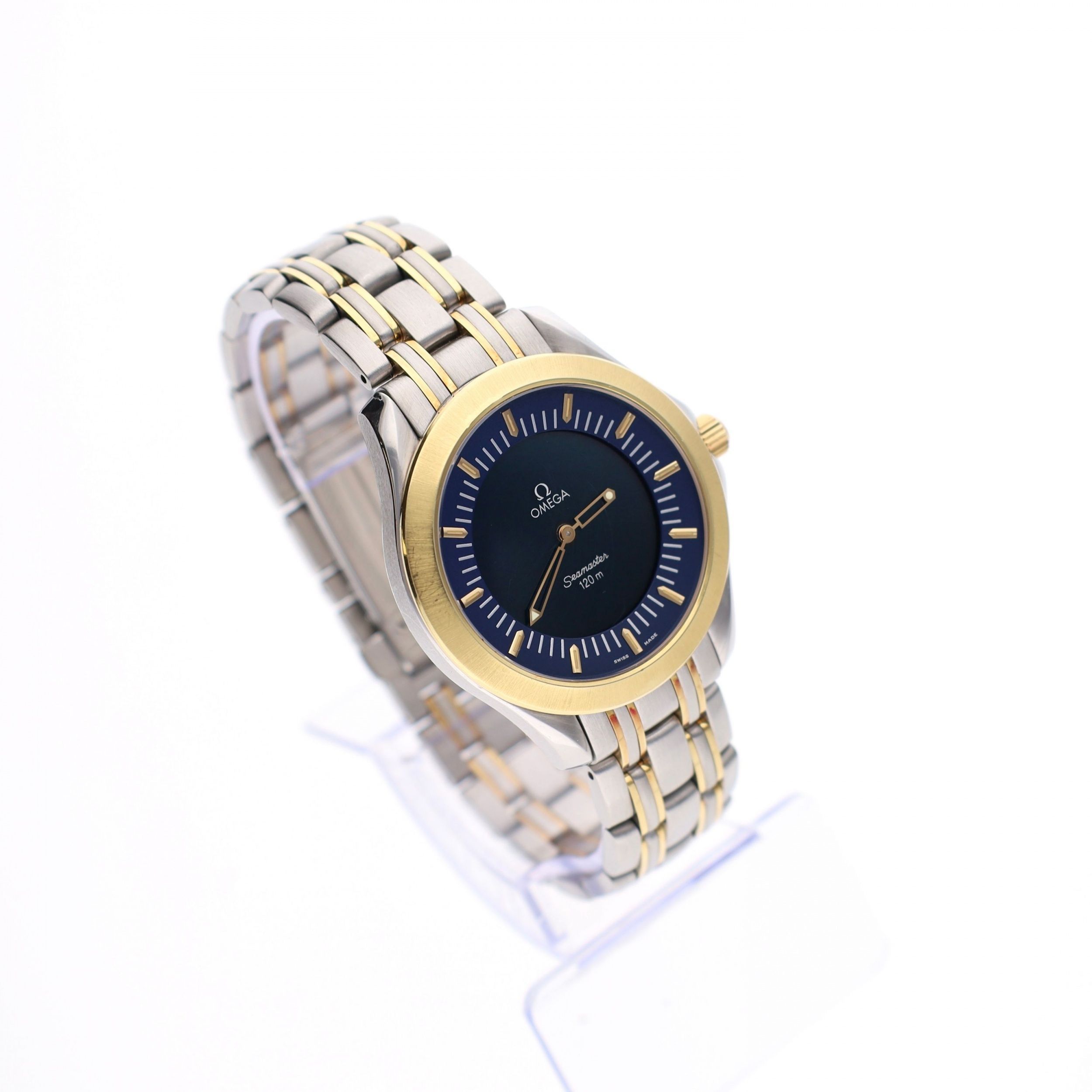 This vintage Omega Seamaster 120 Multifunction is a robust sports watch from the mid-1990s. It combines classic Seamaster DNA with practical everyday functionality in a rare edition and is in very good condition. The stainless steel case has a diameter of approximately 38 mm. The deep blue dial features luminescent hands and hour markers for optimal readability, complemented by an 18-karat gold bezel that is both functional and provides a sporty look. What sets this model apart is the multifunctional quartz movement. This provides reliable timekeeping with additional practical indicators. As we would expect from Omega, the timepiece is accurate, durable, and built to last. Key details: Brand: Omega Model: Seamaster 120 Multifunction Reference: 2321.81.00 Year: Circa 1996 Case material: Stainless steel Dial: Blue Movement: Quartz, multifunction Strap: Gold/steel, in very good condition and suitable for wrists up to 20 cm An authentic vintage Omega with a bold design, proven reliability, and enduring appeal. Delivered in our luxury box including warranty report and a 1-year warranty.