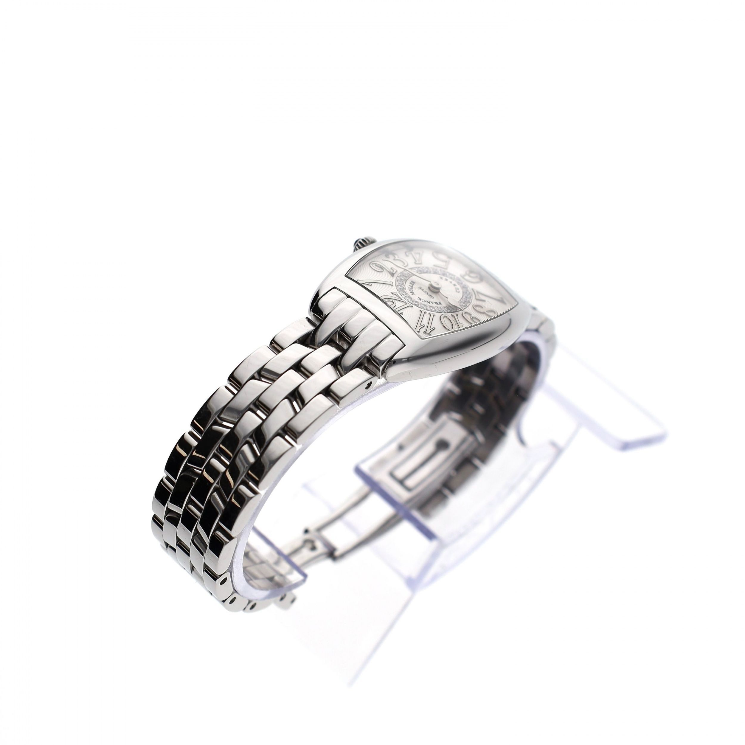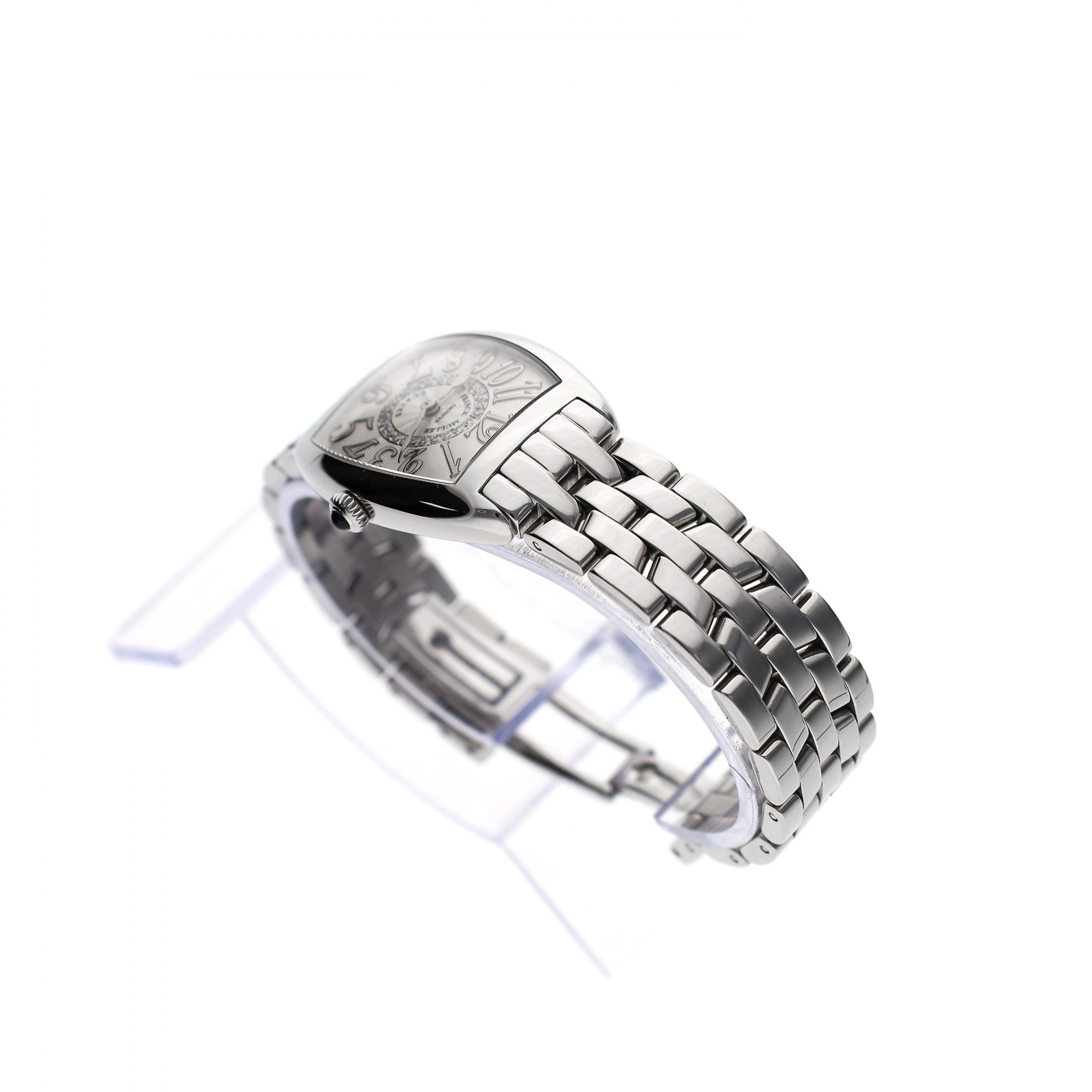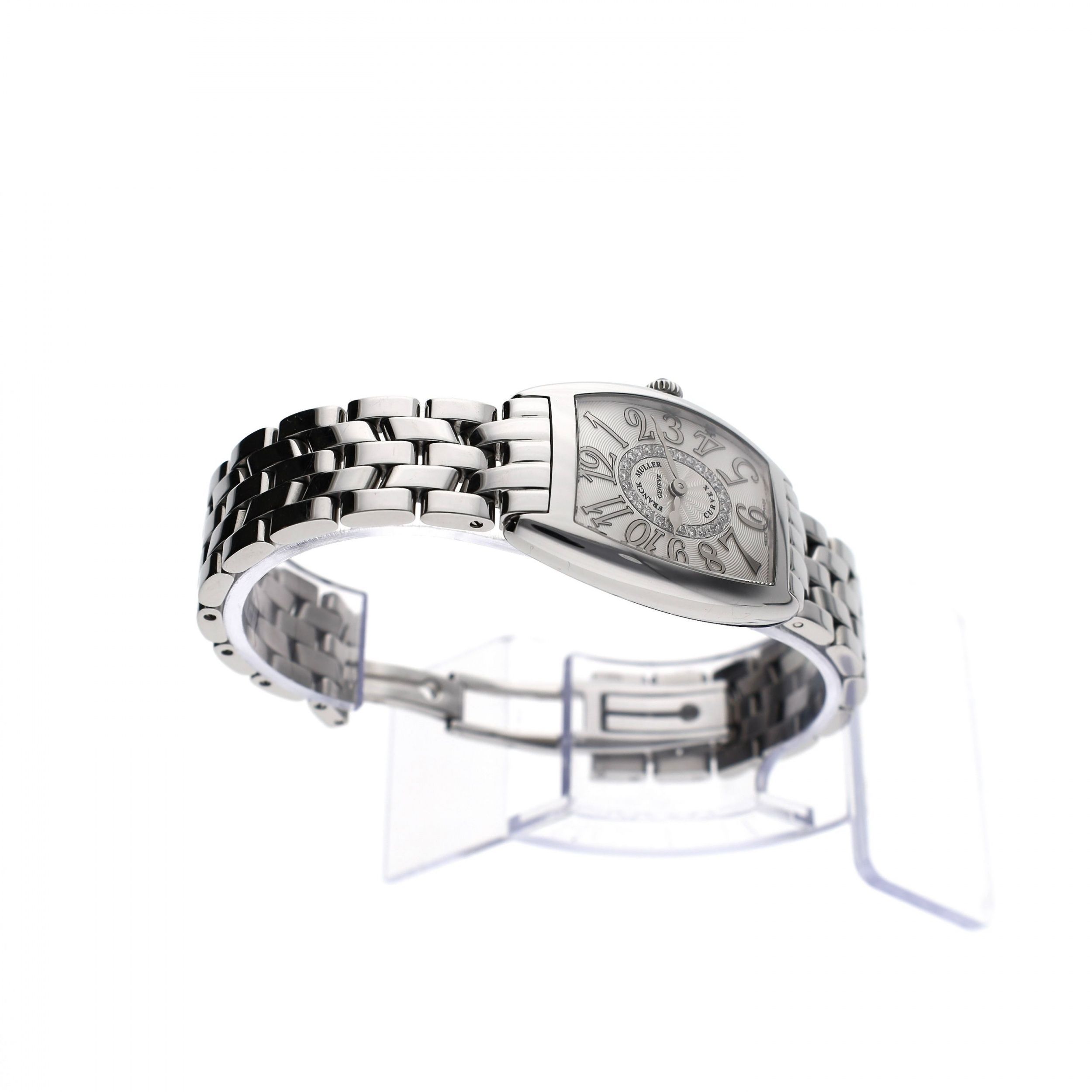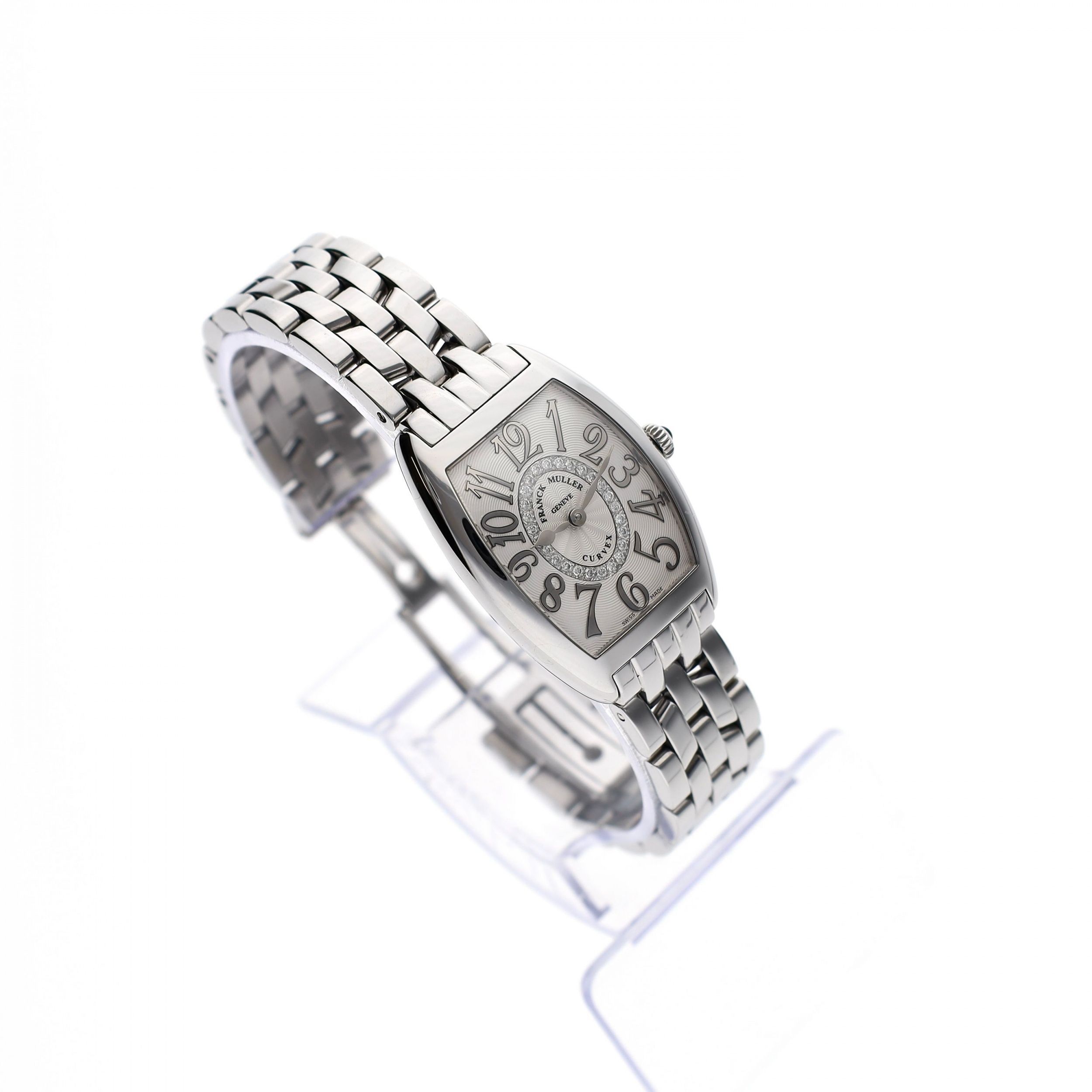 The Franck Müller Cintrée Curvex 1752QZCD1R is a ladies' watch featuring the distinctive tonneau-shaped case from the Cintrée Curvex collection. The polished stainless steel case measures 35 x 25 mm and sits comfortably on the wrist. The silver-colored dial is adorned with diamond hour markers and the characteristic Arabic numerals of Franck Müller. The curved case and dial follow the shape of the wrist. The watch is equipped with a quartz movement for precise and low-maintenance timekeeping. It comes on a stainless steel bracelet, suitable for a wrist circumference of up to approximately 16.5 cm. Specifications • Brand: Franck Müller • Model: Cintrée Curvex • Reference: 1752QZCD1R • Case: stainless steel, polished • Dimensions: 35 x 25 mm • Dial: silver with diamond hour markers • Movement: quartz • Bracelet: stainless steel, up to approx. 16.5 cm wrist circumference • Condition: fully inspected and authenticated, in neat pre-owned condition Delivered in our luxury box with warranty report and 1 year warranty.