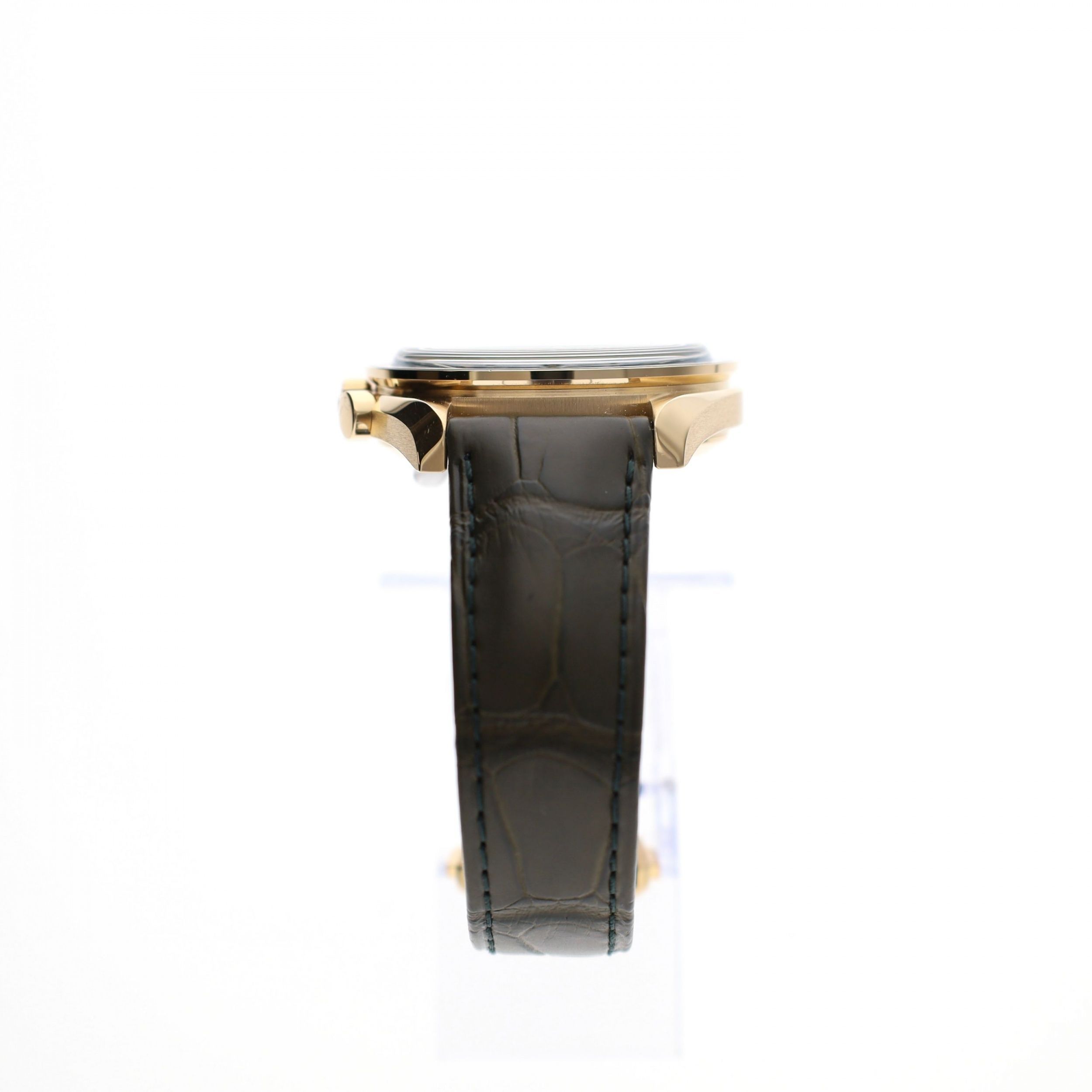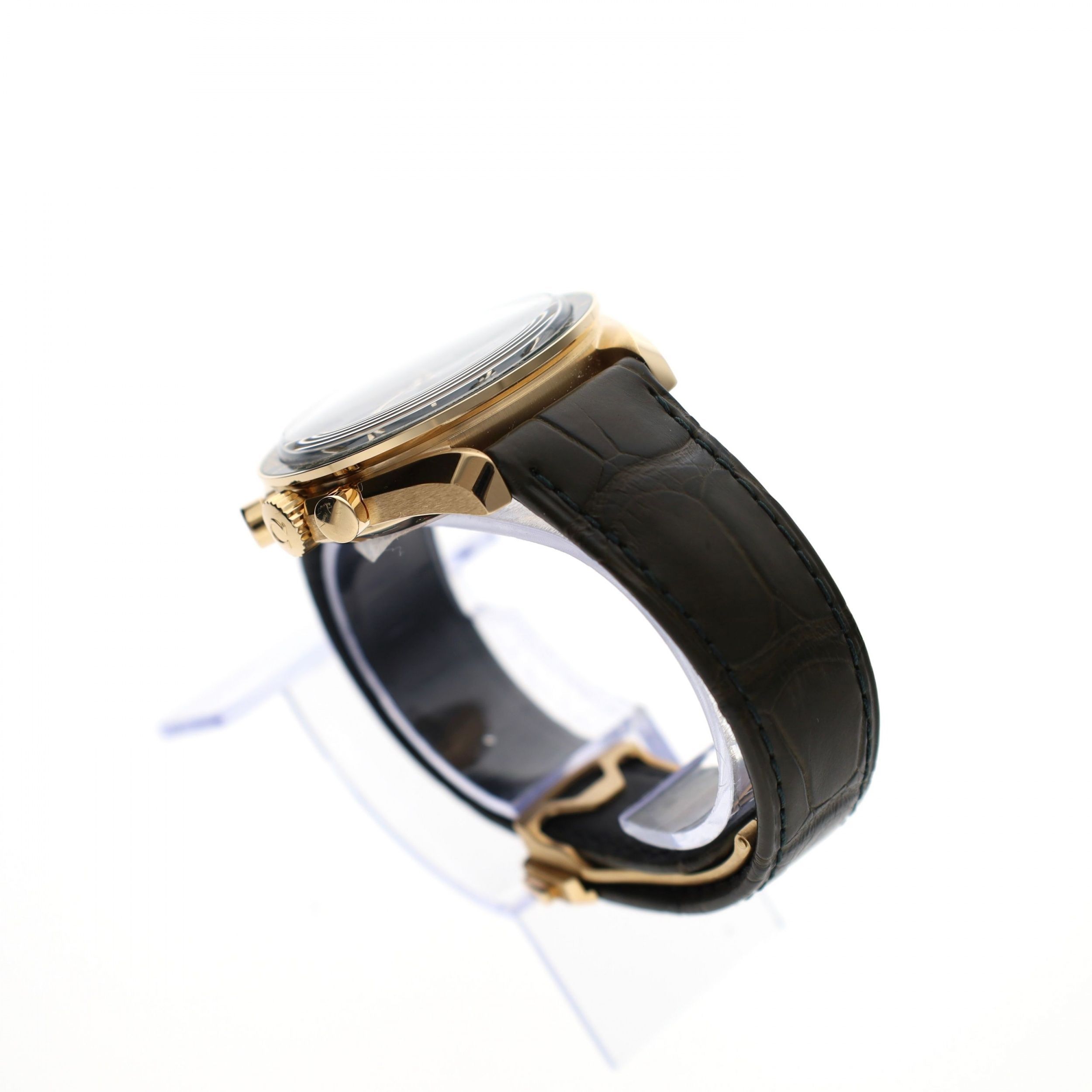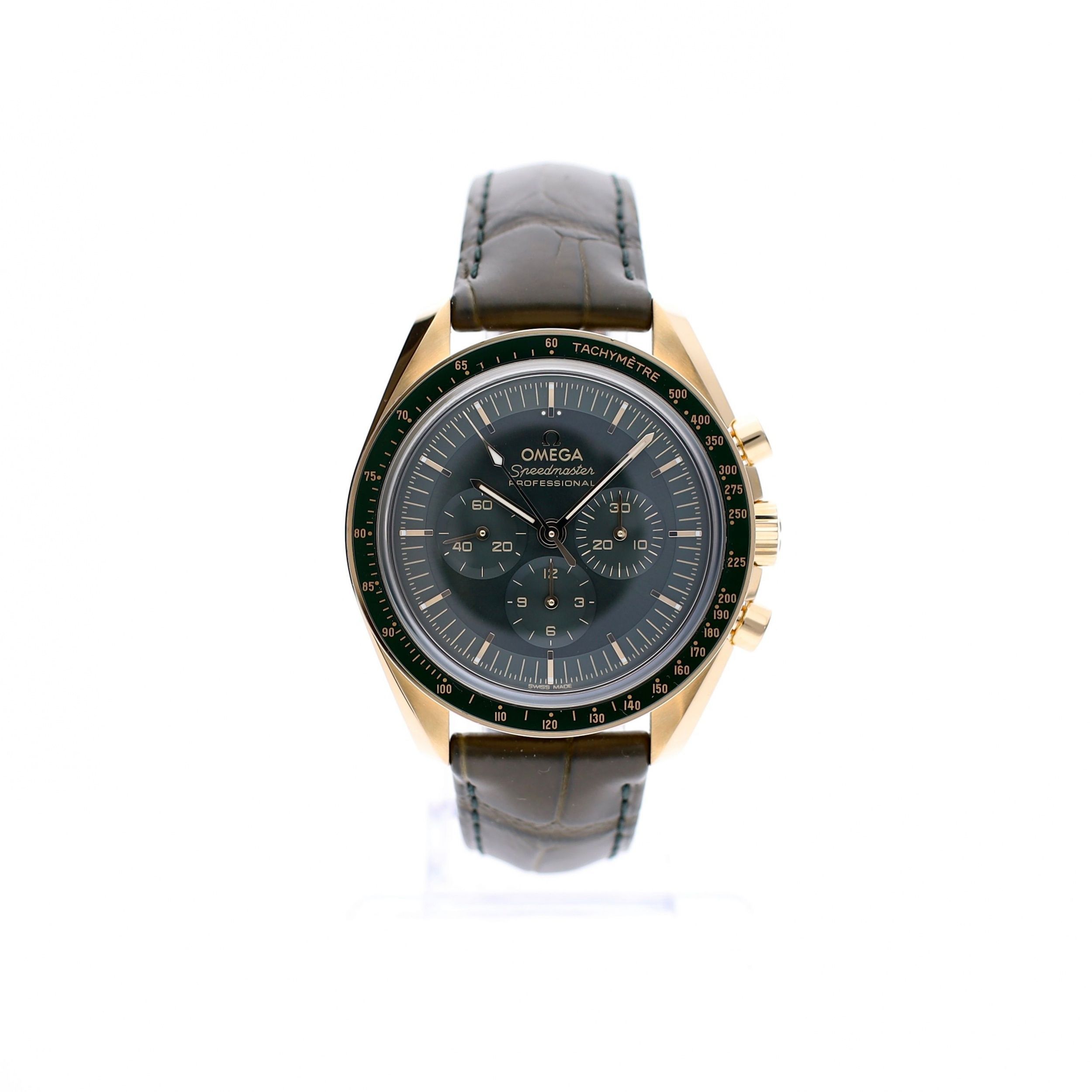 The Omega Speedmaster Moonwatch Professional with reference number 310.63.42.50.10.001 is a modern rendition of the iconic Speedmaster model, crafted in Moonshine 18-carat yellow gold. This material has been developed by Omega as a contemporary variant of traditional yellow gold, known for its warm color and lasting shine. With a case diameter of 42mm, this model remains true to the classic proportions of the Speedmaster Moonwatch. The deep green sun-brushed dial with matching subdials forms a striking yet elegant contrast with the Moonshine gold case. Inside, it houses the Omega Co-Axial Master Chronometer caliber 3861, a modern manual-winding movement known for its high precision, antimagnetic properties, and chronometer certification. This movement represents the latest generation of the classic Speedmaster caliber. This piece from 2025 is in near-new condition and has been worn only a few times. The case shows minimal signs of use, and the movement functions as expected from a Master Chronometer. The combination of Moonshine gold and the green dial makes this one of the most distinctive contemporary versions of the Speedmaster. The watch has a case diameter of 42mm and is worn on a green leather strap with a Moonshine gold folding clasp. This size makes the watch particularly suitable for men, but it can also be well-worn as a unisex piece for those who appreciate a larger watch. This watch is delivered as a complete full set from 2025, including the original box and papers. Additionally, it comes with an in-house warranty report and 1-year warranty. All components on and off the watch are original. The original retail price of this model is approximately €33,500, making this piece a particularly interesting opportunity for enthusiasts of the Speedmaster in a precious metal execution.