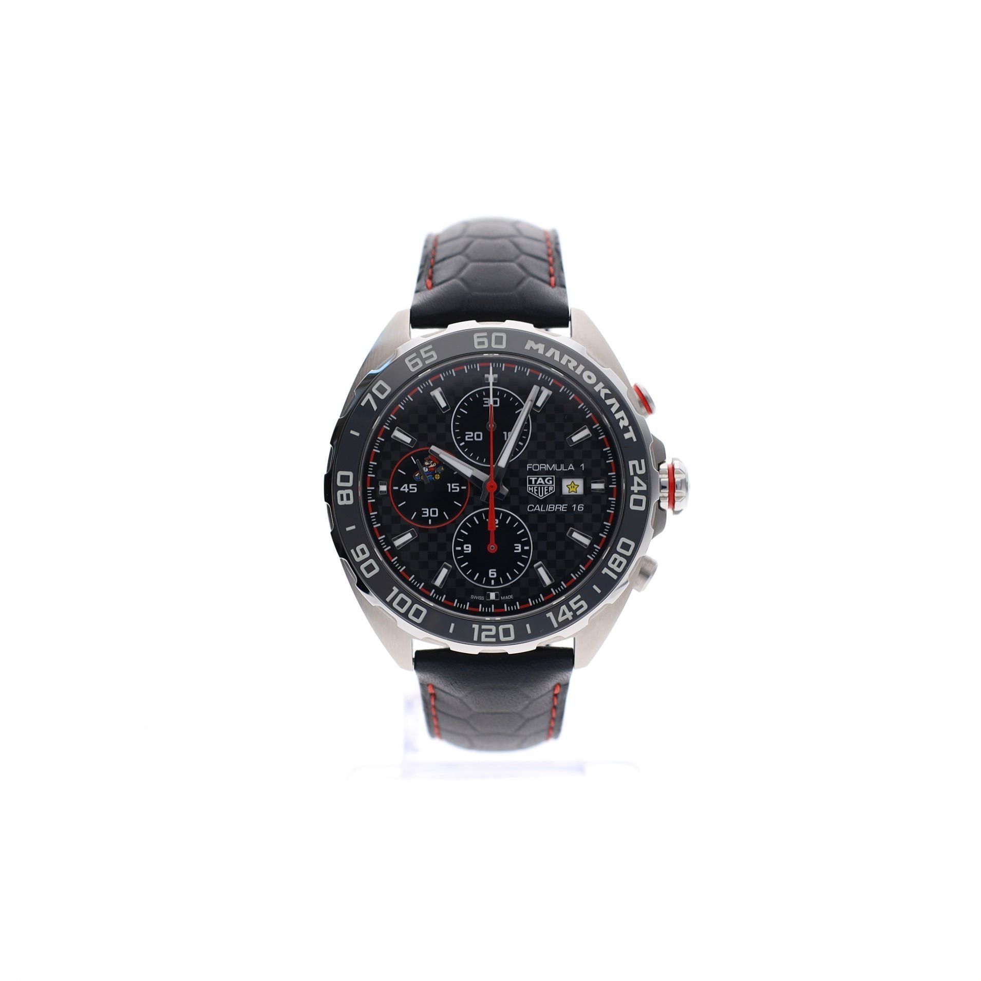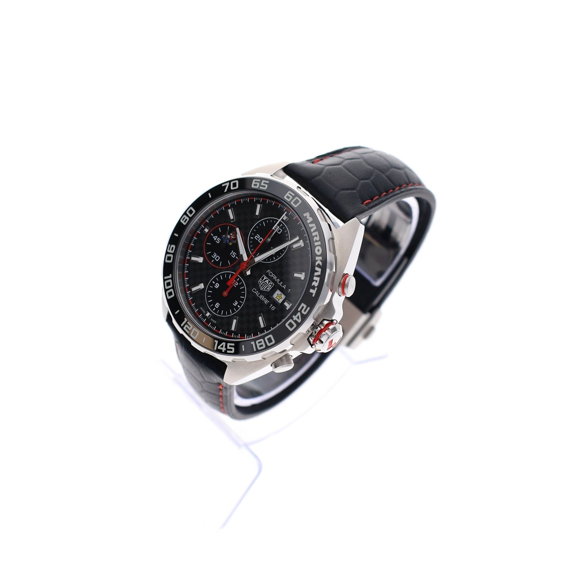 Let's have some fun with this striking collaboration; The TAG Heuer Formula 1 Chronograph x Mario Kart CAZ201E.FC6517 is a limited edition (3000 pieces) that is instantly recognizable to both watch enthusiasts and fans of the iconic Mario Kart video game. This model features a 44mm case and combines the sporty character of the Formula 1 collection with subtle references to Mario Kart. The playful details on the chronograph subdials include iconic elements from the gaming world, while the bezel and red accents enhance the dynamic racing character. At its heart, it runs on the automatic TAG Heuer Caliber 16, a reliable chronograph movement known for its robustness and sporty performance. The chronograph function and date display make this watch practical for everyday use. This piece from 2022 is in unworn (new) condition and comes as a complete full set, including the original (large) box, travel case, and documents. Additionally, you'll receive our warranty report and 1 year of warranty. A striking and collectible limited edition that combines sporty watchmaking with the iconic world of Mario Kart. Perfect for the enthusiast looking to wear something unique and not take things too seriously.
