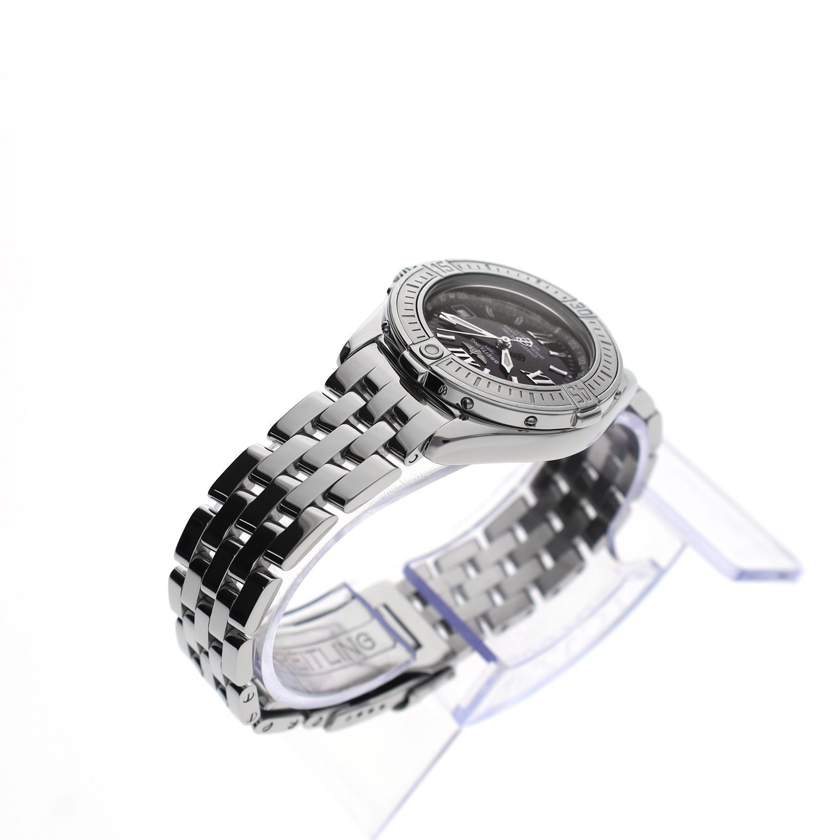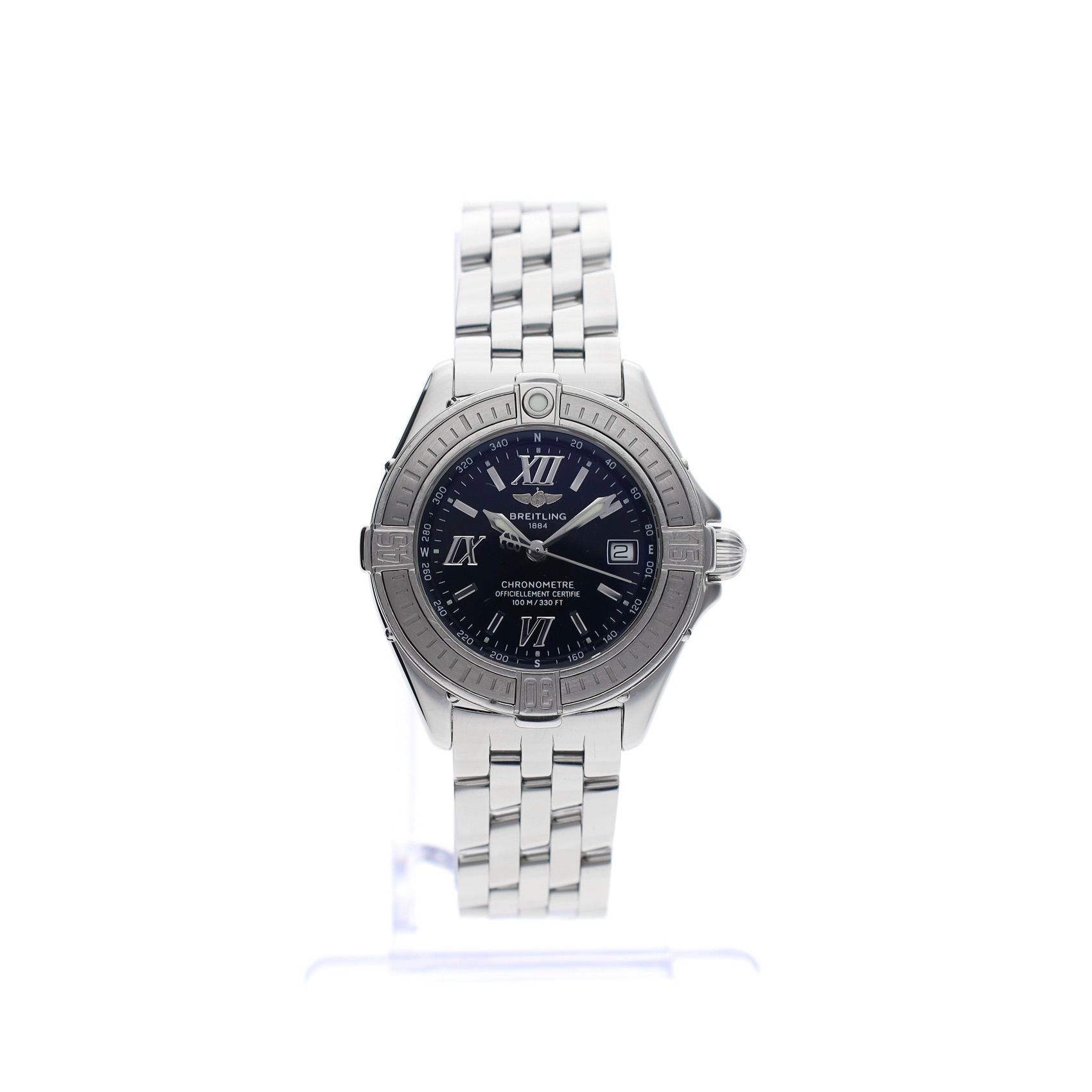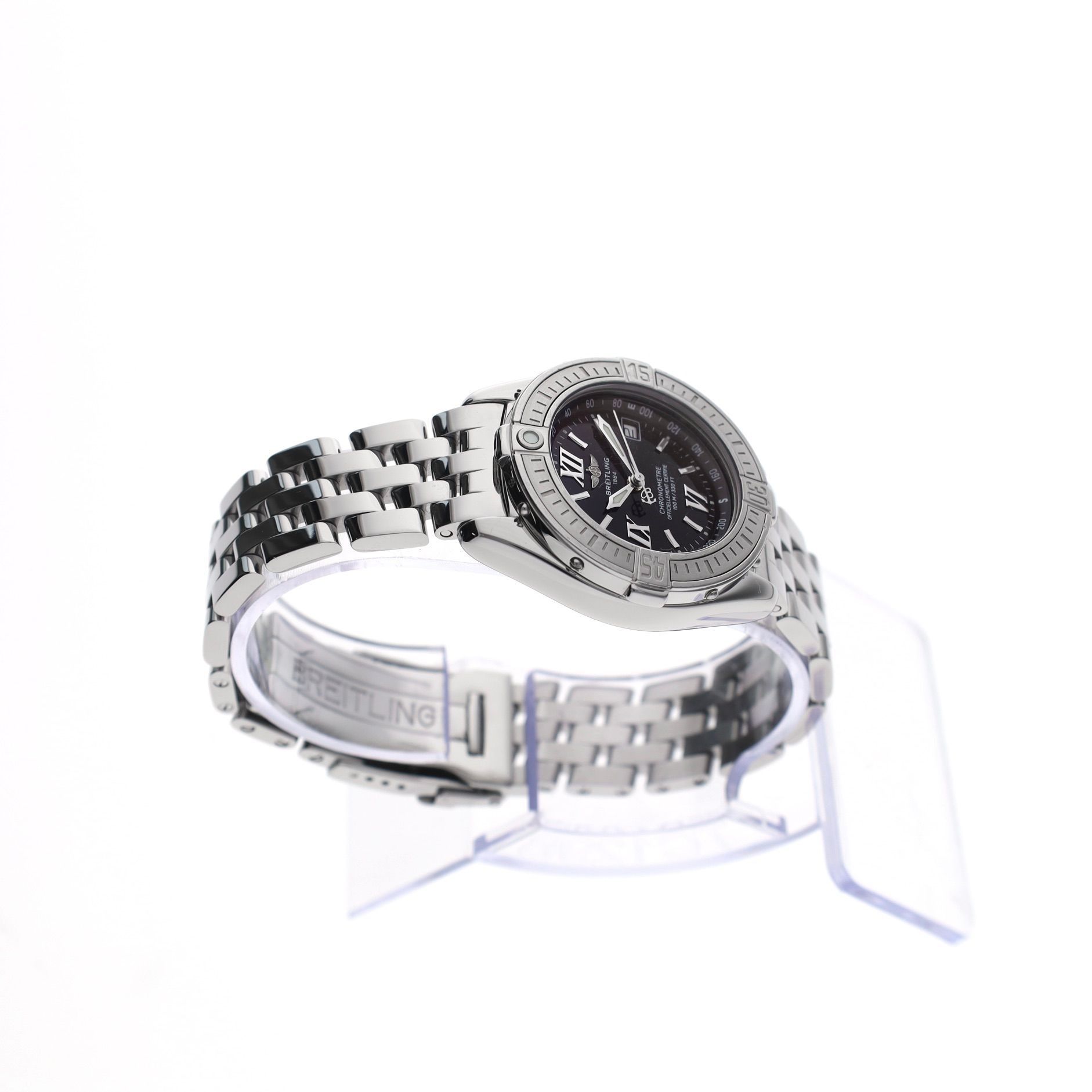 The elegant Breitling Cockpit J-Class A67365 is a refined ladies' watch from Breitling's sporty Cockpit collection. This model combines the brand's recognizable robustness with elegant sizing, making the watch both stylish and suitable for daily wear. With a case diameter of 31mm, this watch strikes a perfect balance between sportiness and refinement. The distinctive Breitling bezel with pattern gives the watch a powerful presence, while the classic dial ensures excellent readability. Inside, the high-quality Breitling Caliber B67 quartz movement operates. This movement is Chronometer certified, meaning it has been officially tested for accuracy according to strict Swiss standards. This piece from circa 2002 is in very good condition and has been carefully worn. The watch offers the quality and precision for which Breitling is known, in an elegant version that perfectly fits a sporty ladies' watch. The watch comes with: Original Breitling box, Breitling Chronometer certificate, original booklets, and our warranty report with 1 year warranty. A stylish and reliable Breitling ladies' watch, with chronometer precision and the characteristic design of the Cockpit collection. Perfect for lovers of Swiss watch quality in an elegant and sporty form.