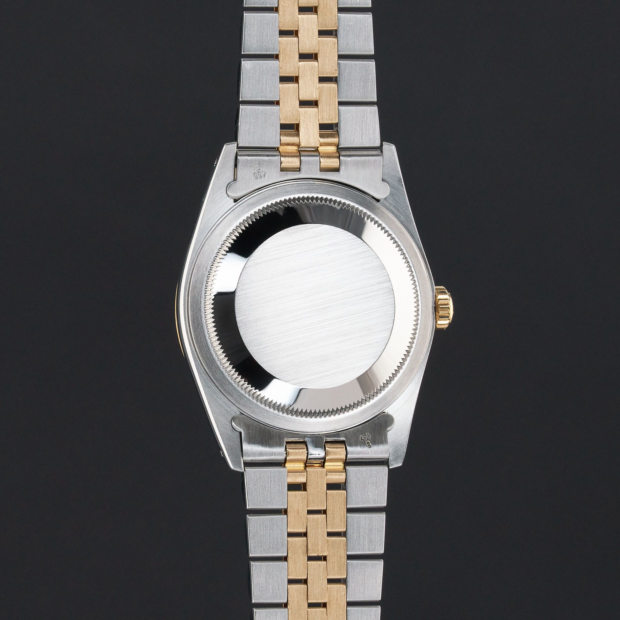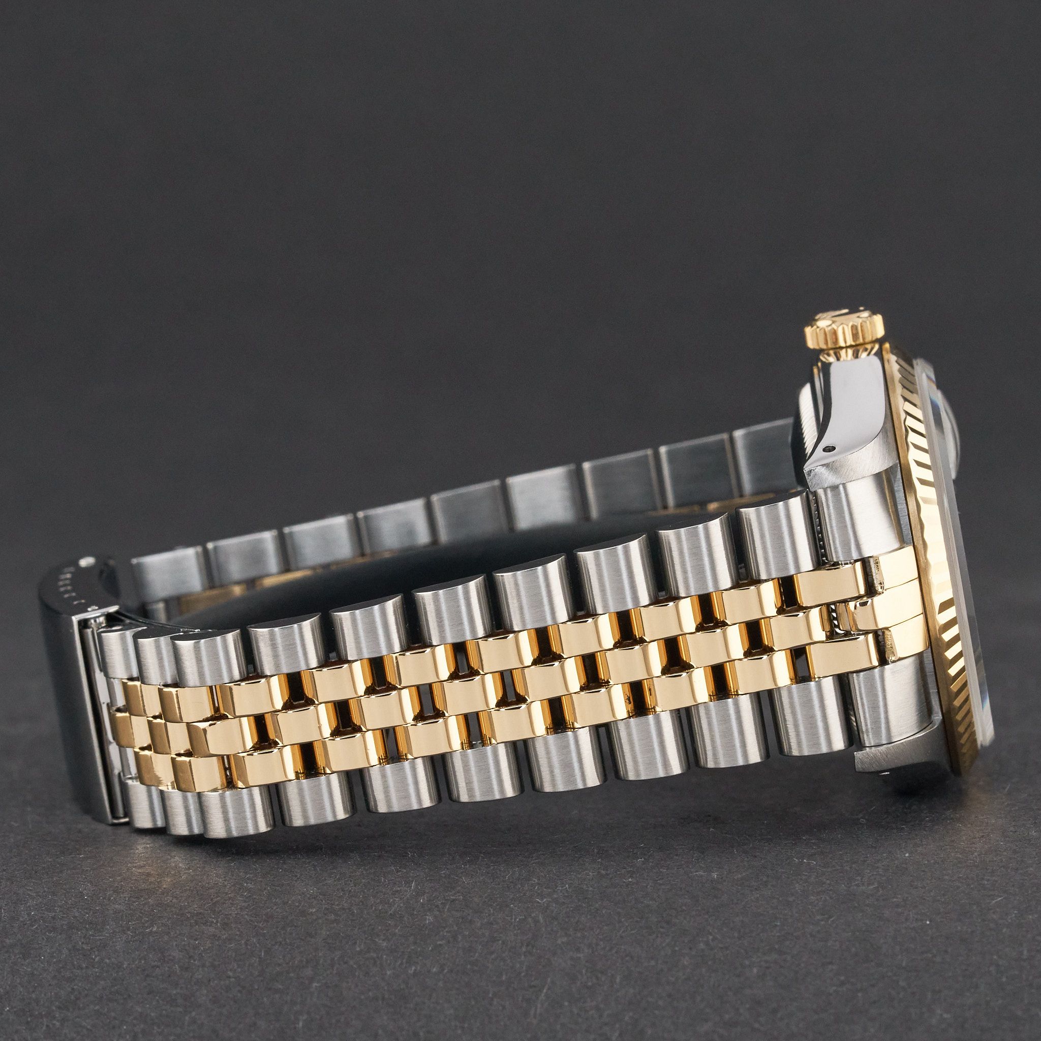 This Rolex Datejust 16233 features a Silver dial and is crafted from 18K yellow gold and stainless steel, with a production year of 1991.