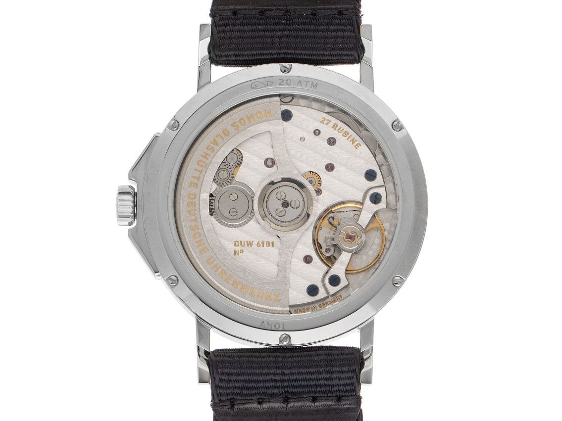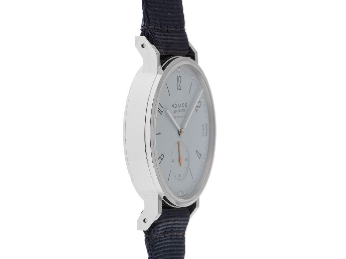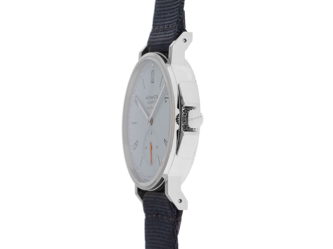Gehäuse Edelstahl poliert, Gehäusedurchmesser ohne Krone 38,5mm, Gehäusehöhe 9,9mm. Armband Textilband blauschwarz, Anstoßbreite 20mm, Stiftschließe Edelstahl poliert mit Hersteller-Logo. Zifferblatt himmelblau mit schwarzen Indexen, arabischen Ziffern und Edelstahl Leuchtzeigern, neonorangefarbener Sekundenzeiger. Uhrwerk Automatik, Nomos Manufakturkaliber DUW 6101 mit 27 Edelsteinen, Gangreserve ca. 42 Stunden. Anzeige von Stunde und Minute über Zeiger aus der Mitte, kleine Sekunde mit Sekundenstopp zur sekundengenauen Einstellung der Uhrzeit bei 6 Uhr, Datumsanzeige mit Schnellverstellung bei 3 Uhr. Saphirglas kratzfest. Krone verschraubbar mit Flankenschutz und Hersteller-Logo. Boden Edelstahl 6-fach verschraubt und graviert mit Saphirglas Sichtfenster. Gewicht der Uhr inklusive Armband 58g. Wasserdicht bis 20 ATM. Referenznummer: 526, ID: ST610248240326H-4020, Artikelnummer: 10000085072. Original Nomos Box mit Umkarton und Garantie Papiere von März 2026, Full Set. Neu. Lieferzeit sofort.